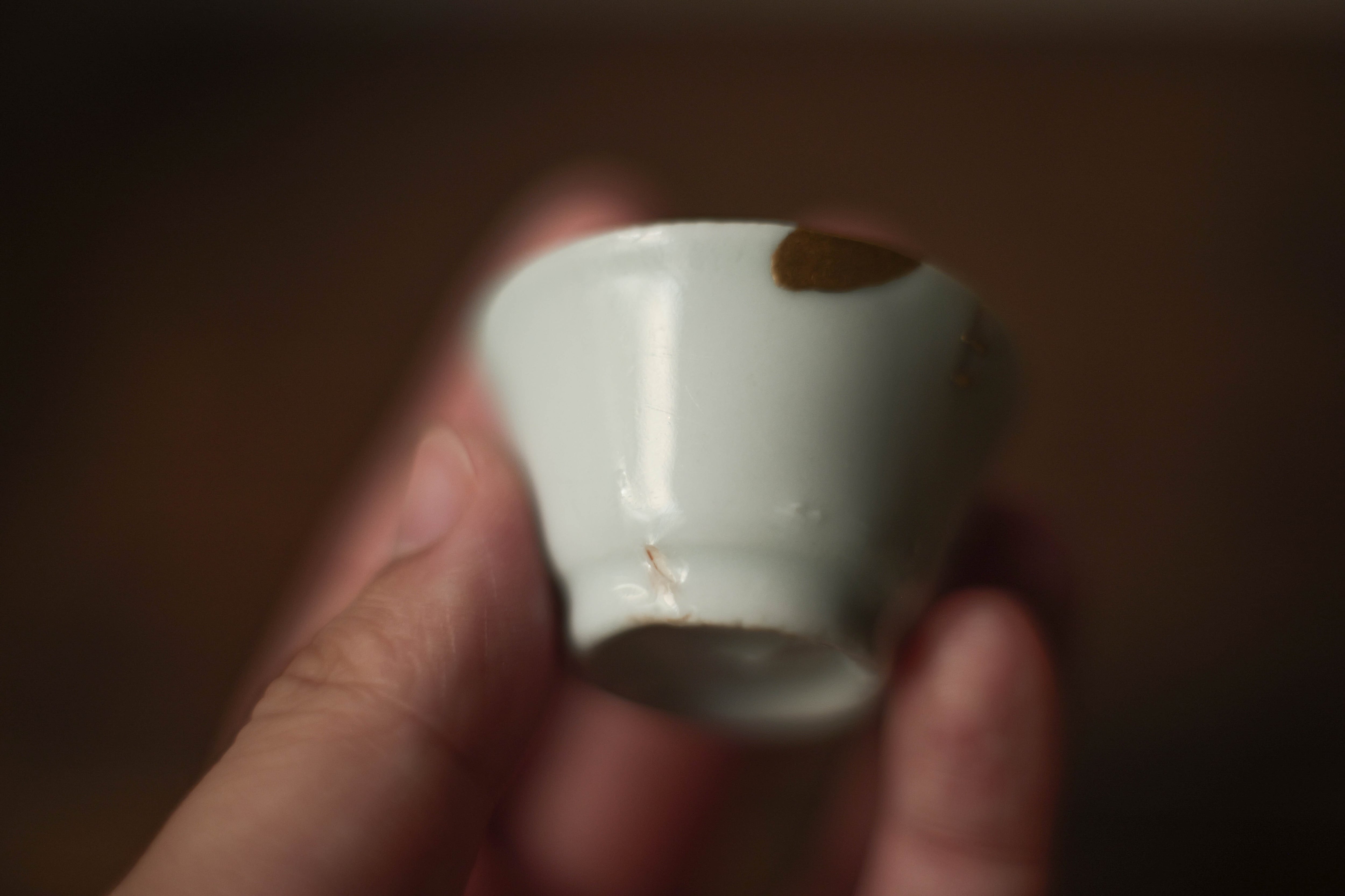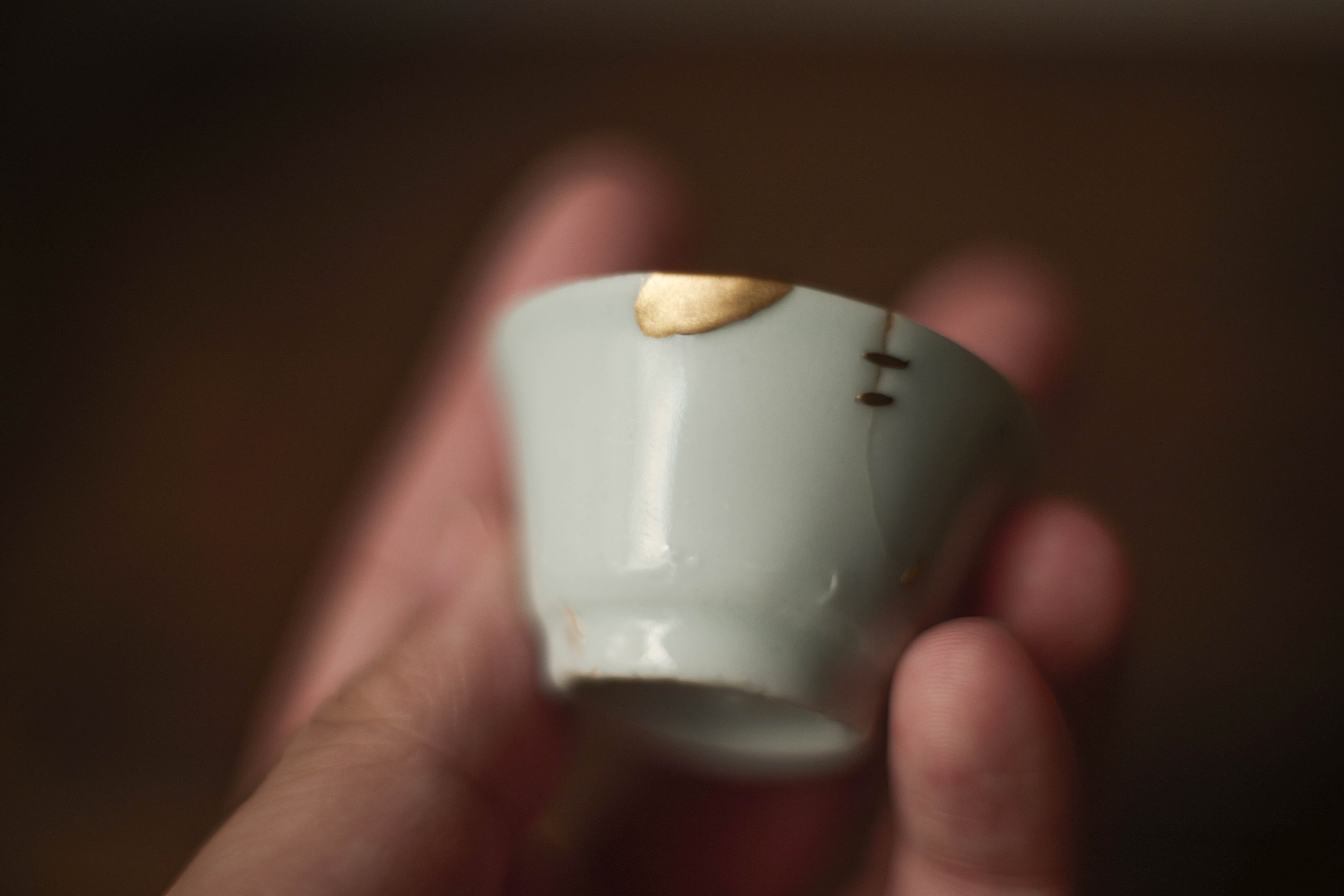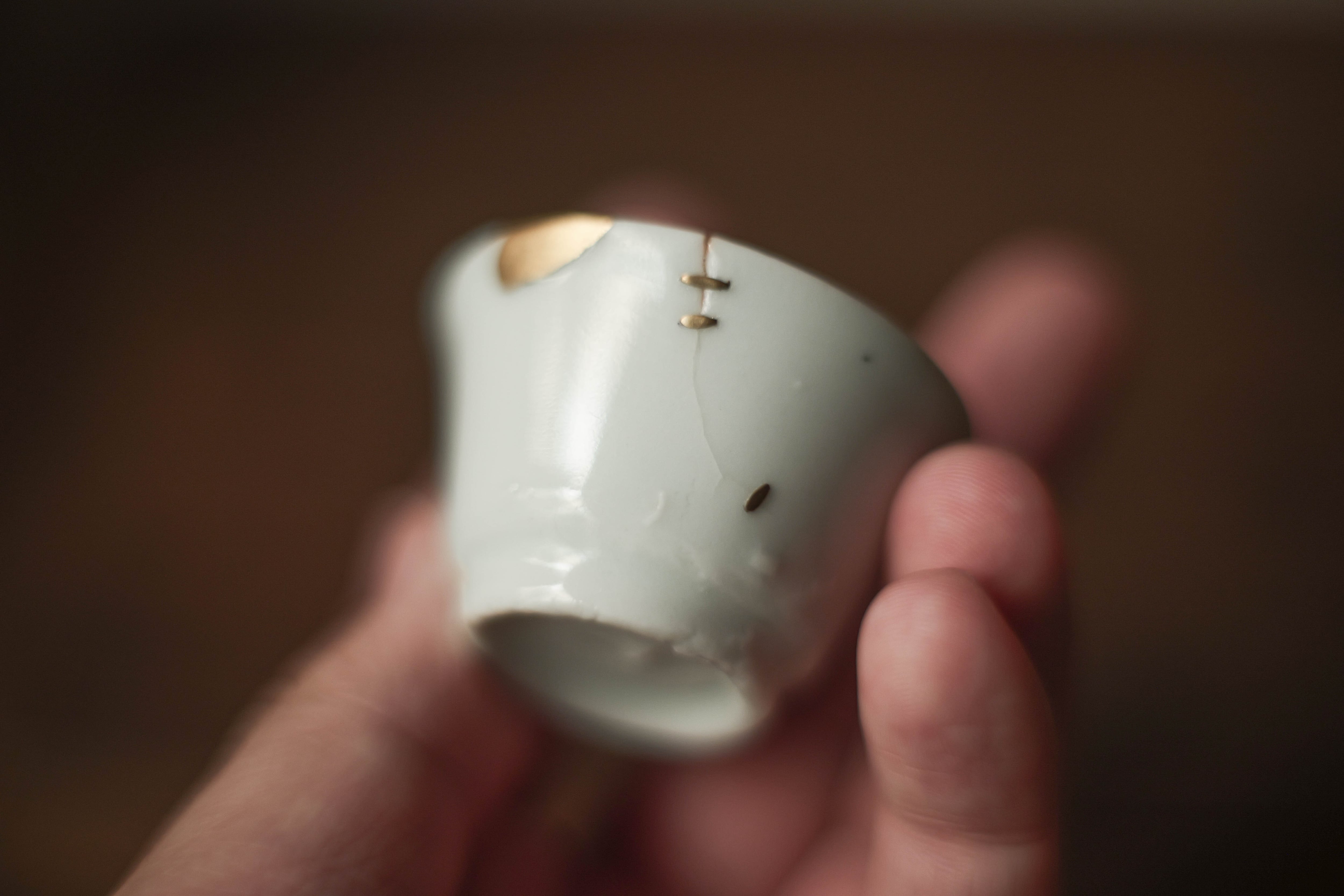 徳化の骨董屋で見つけた明代(約1368-1644年)徳化茶杯。 福州の修復師ユーさんに鎹・金継で直していただいた。 窯の遺跡で集められたもの。還元焼で青みかかっている。 最近の復刻された手拓白磁の「馬蹄杯」の原型。 「きれい」な古馬蹄杯は最近出回りが少なくなっている気がする。