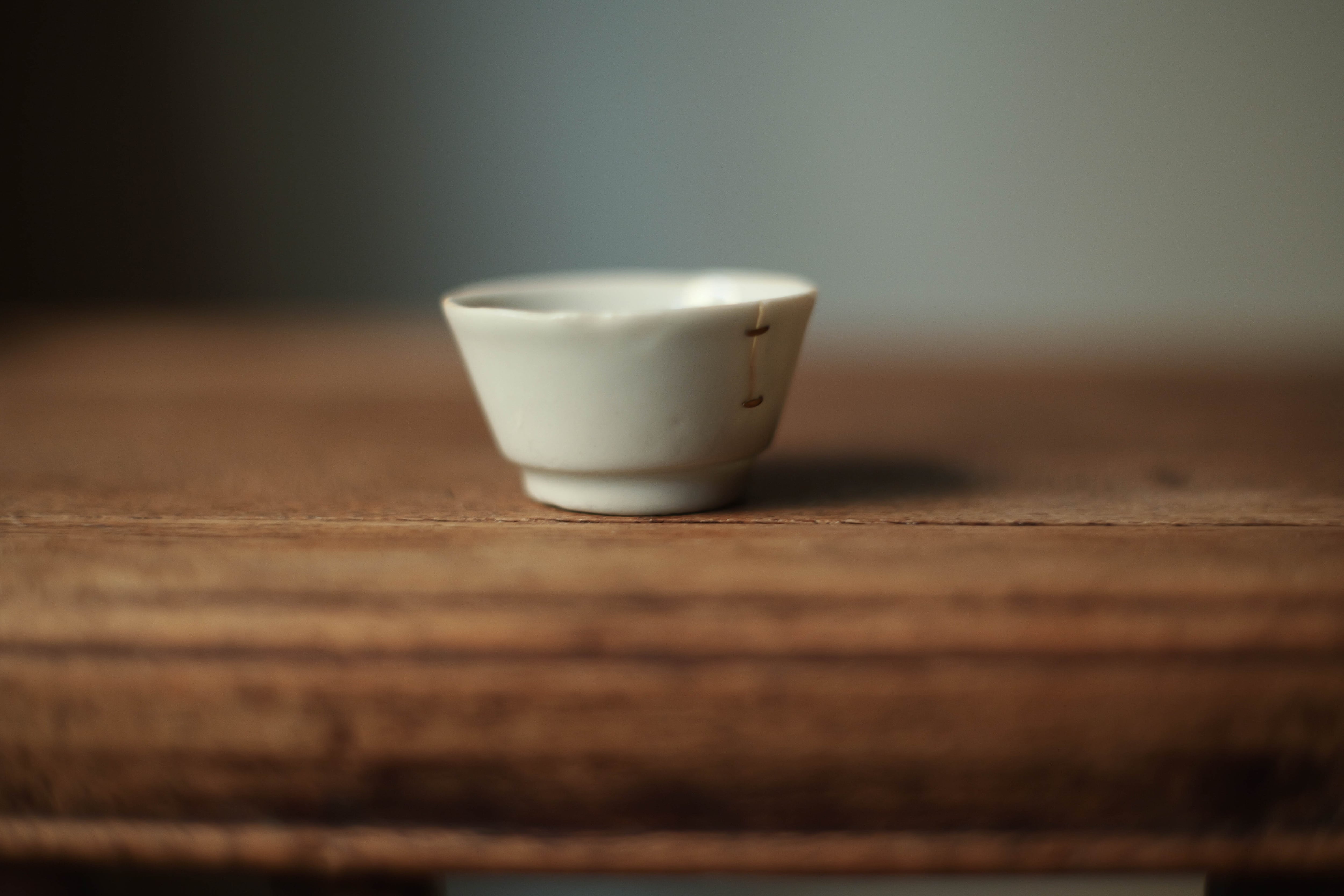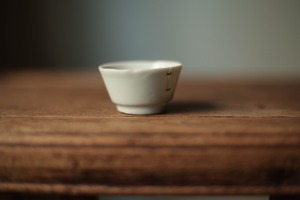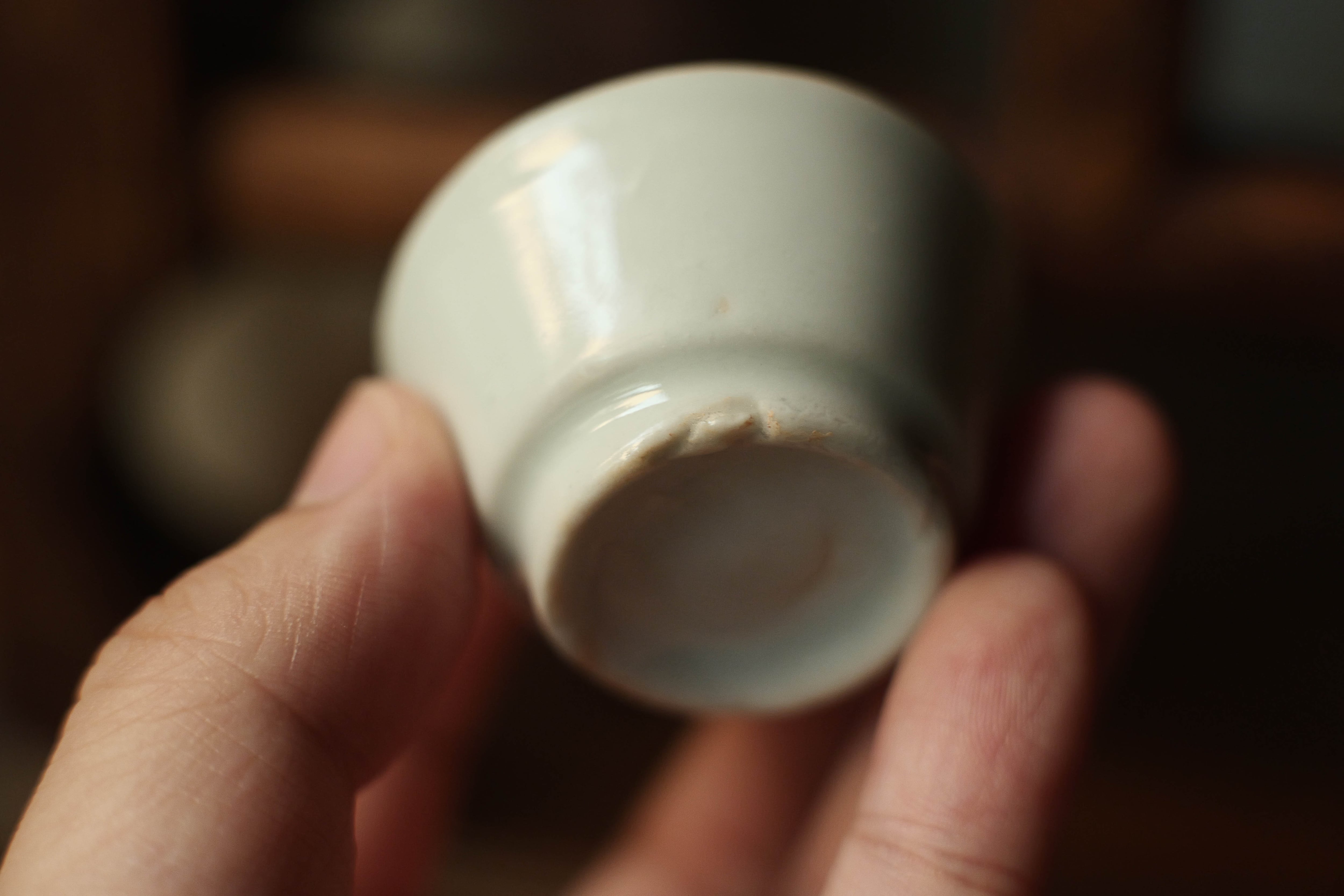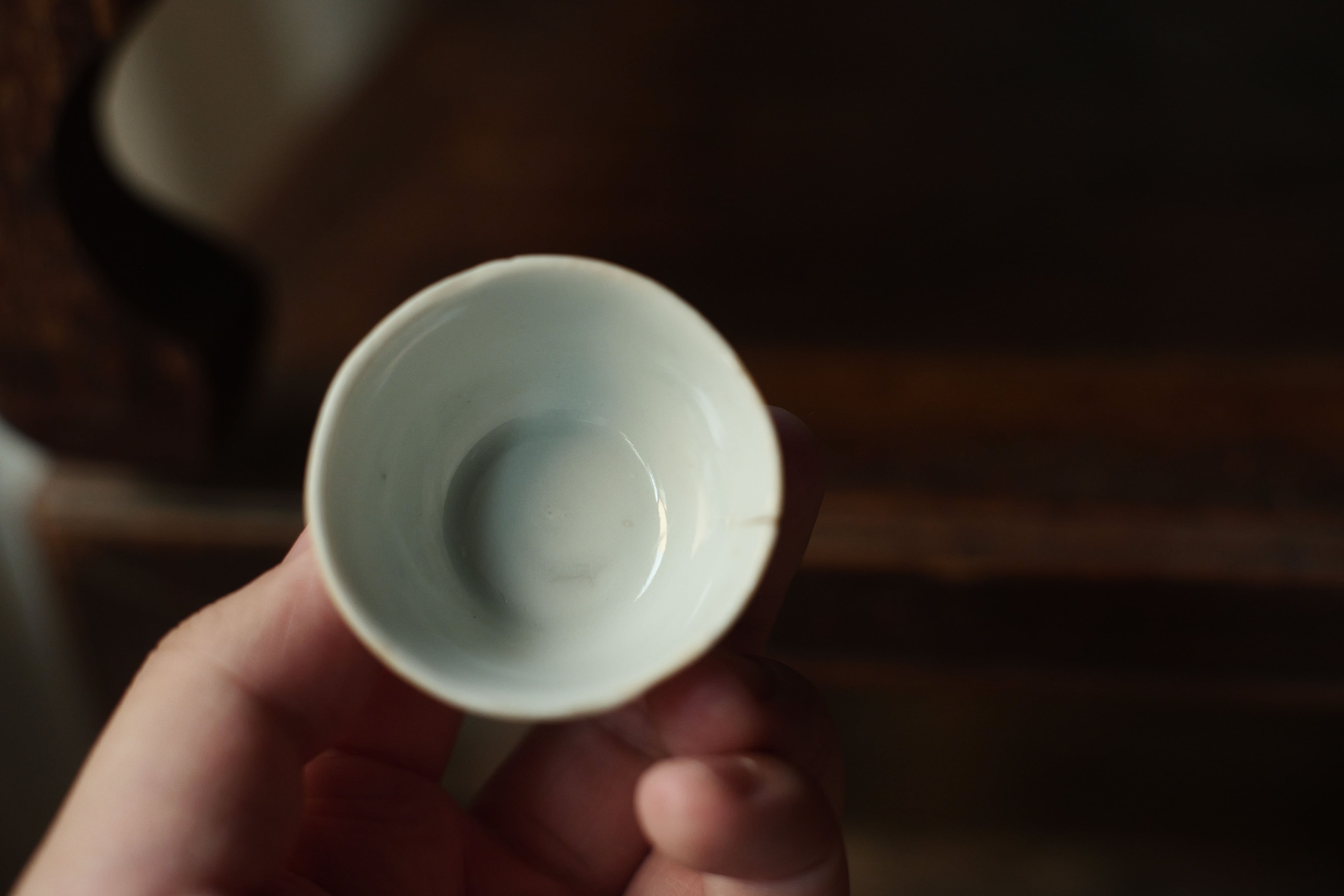 徳化の骨董屋で見つけた明代(約1368-1644年)徳化茶杯。 福州の修復師ユーさんに鎹で直していただいた。 * 低身の雪色 ‐ 窯の遺跡で集められたもの。還元焼で青みかかっている。 最近の復刻された手拓白磁の「馬蹄杯」の原型。 「きれい」な古馬蹄杯は最近出回りが少なくなっている気がする。