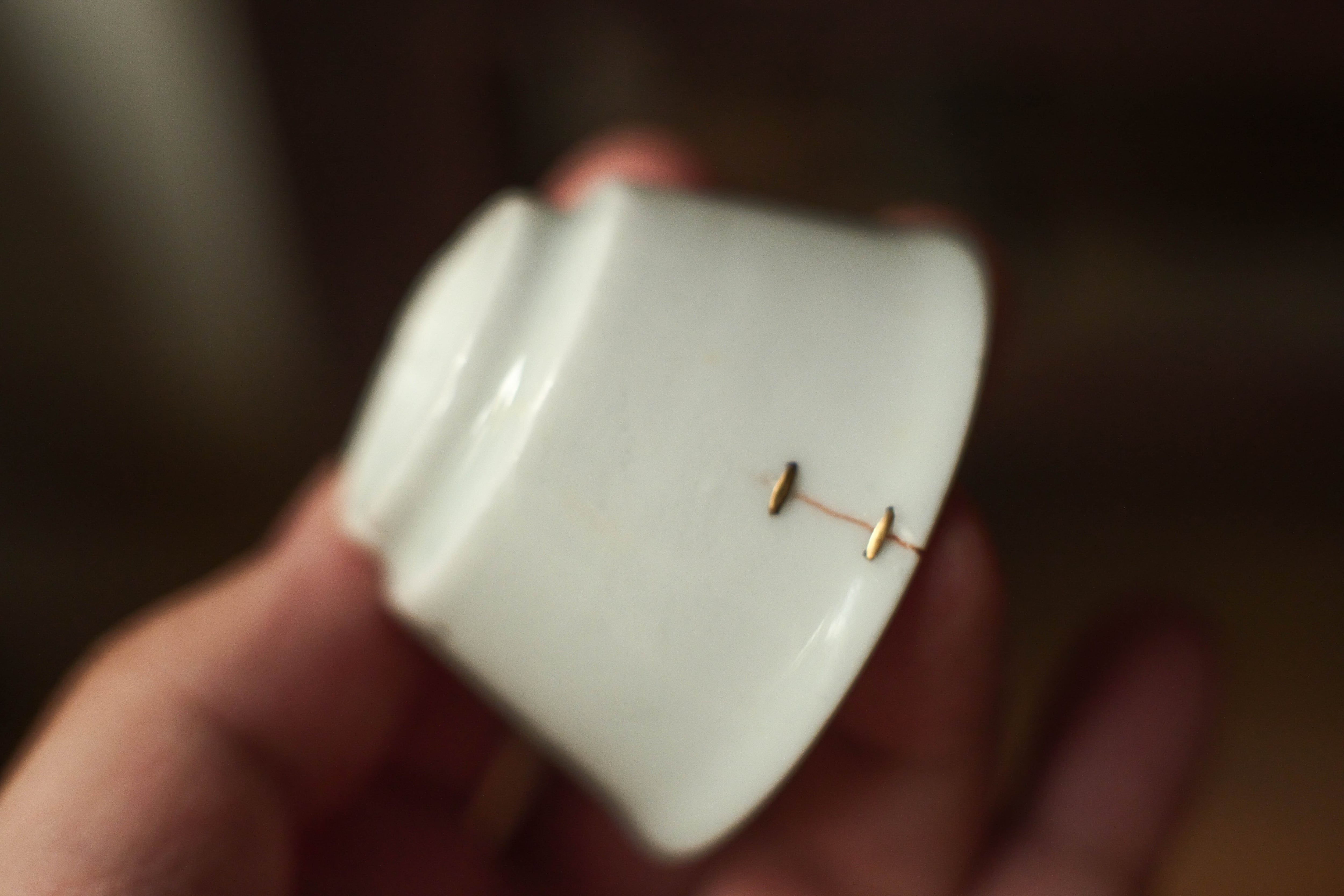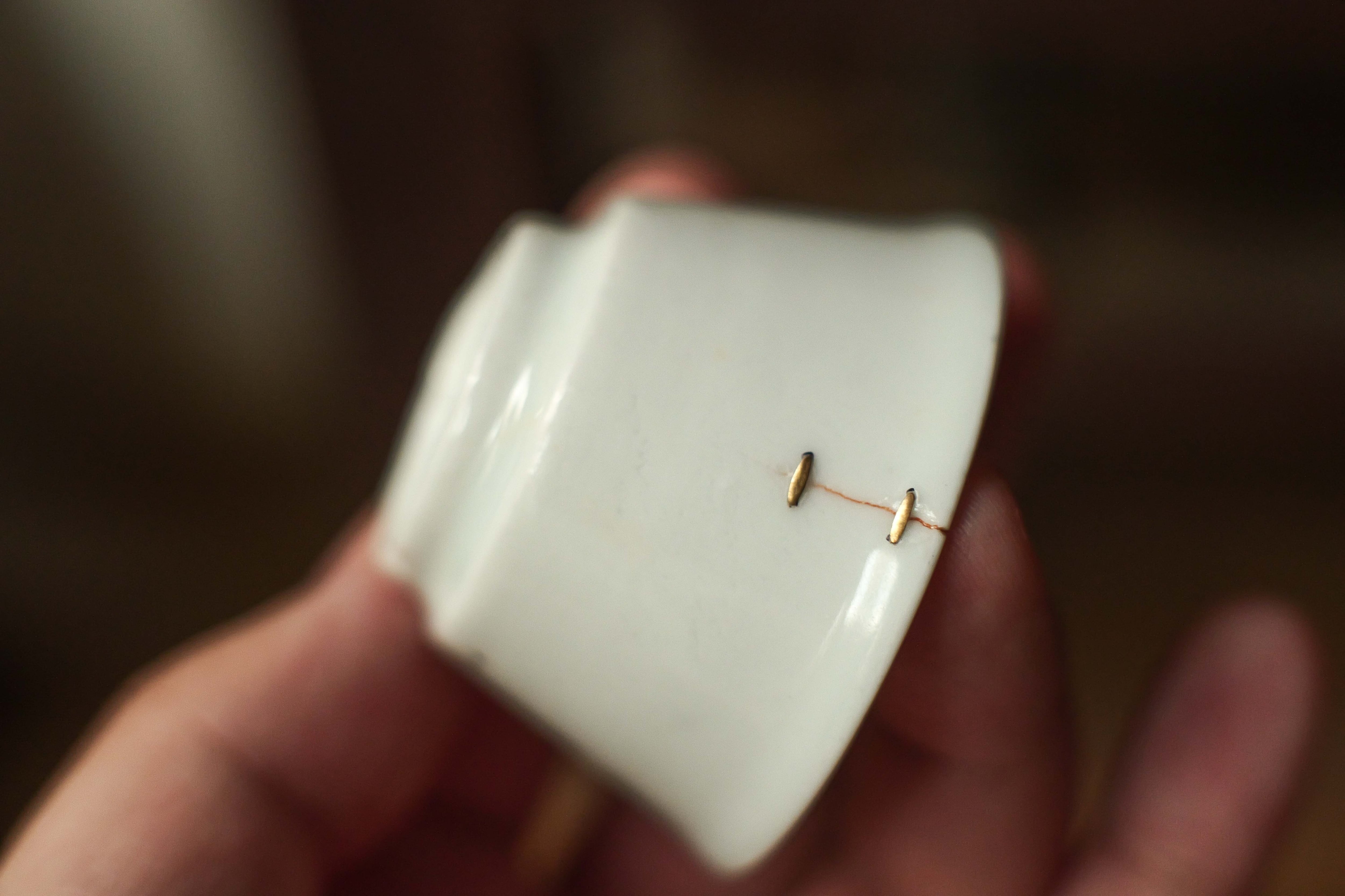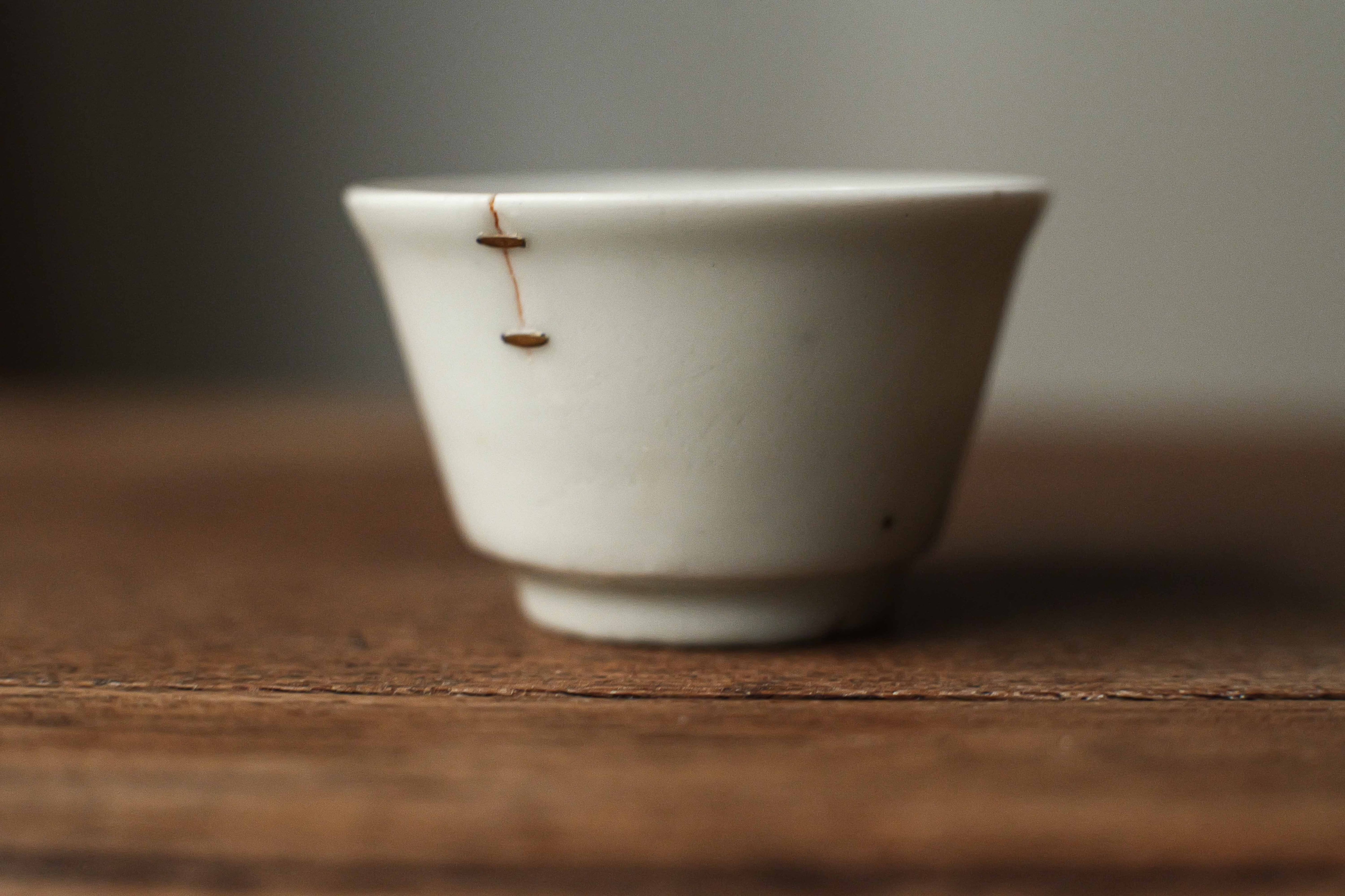徳化の骨董屋で見つけた明代(約1368-1644年)徳化茶杯。 福州の修復師ユーさんに鎹で直していただいた。 * 「手拓」(型作り・手押し)技法による皺の絵 きれいな肌理 ‐ 窯の遺跡で集められたもの。還元焼で青みかかっている。 最近の復刻された手拓白磁の「馬蹄杯」の原型。 「きれい」な古馬蹄杯は最近出回りが少なくなっている気がする。