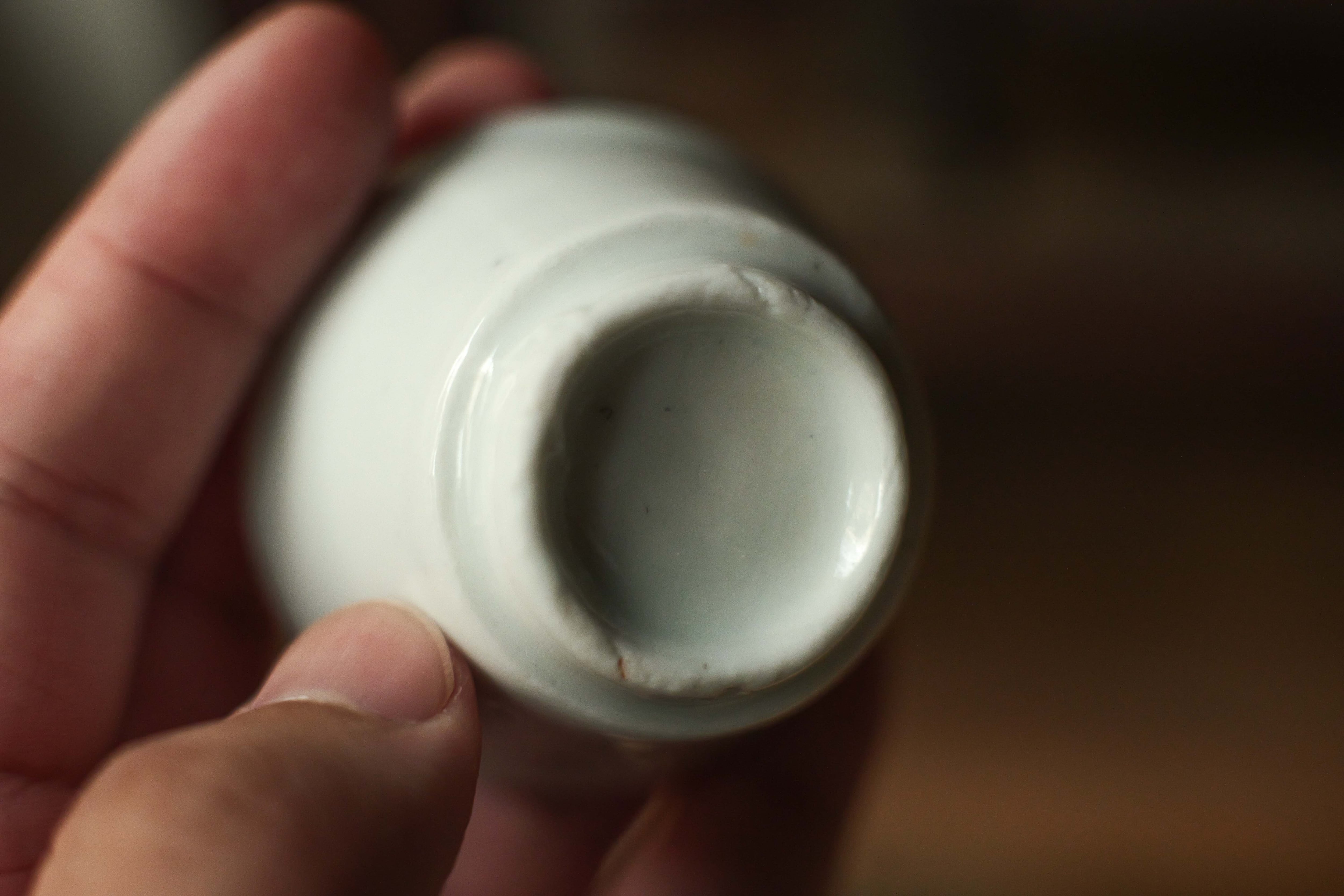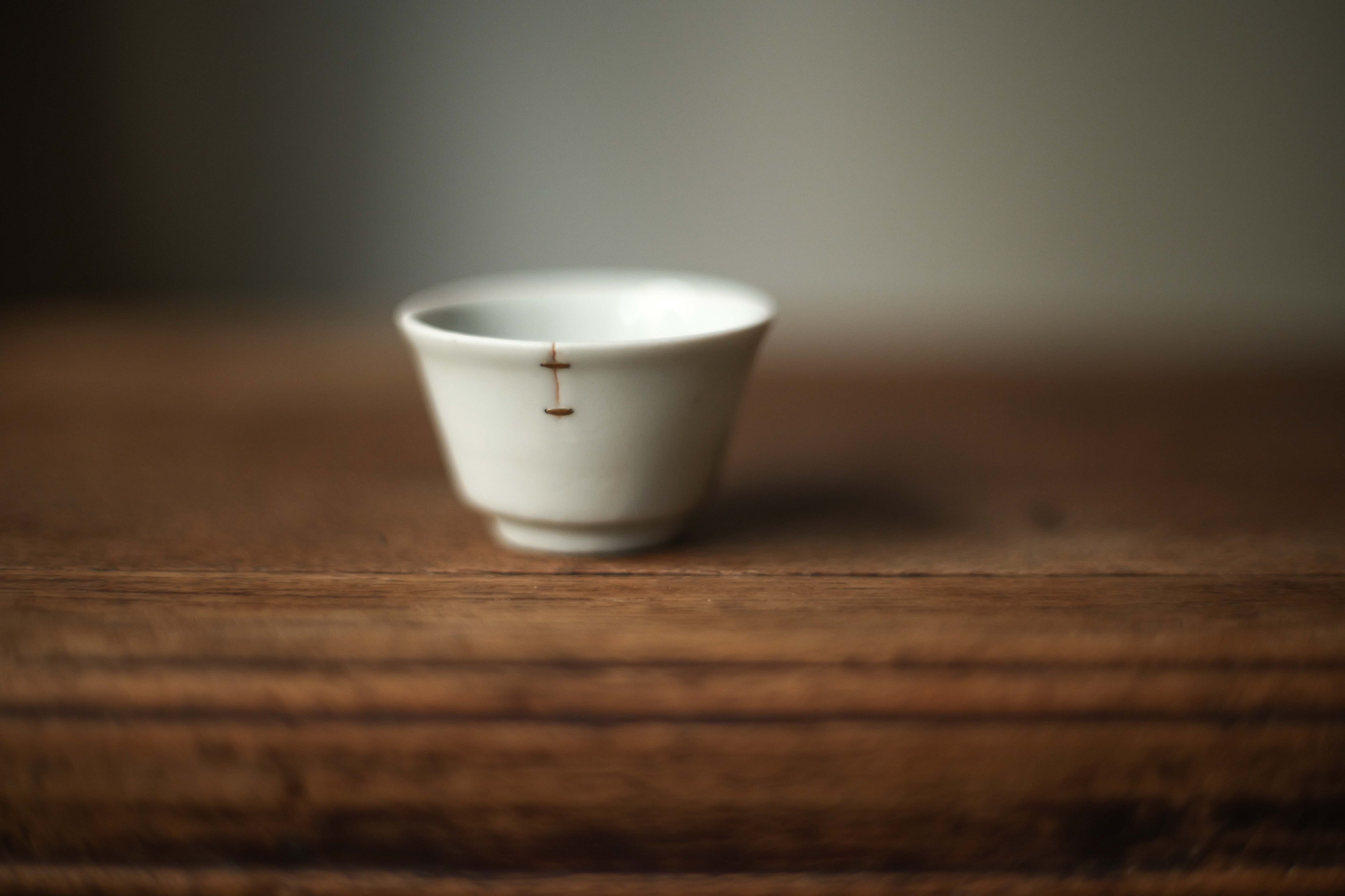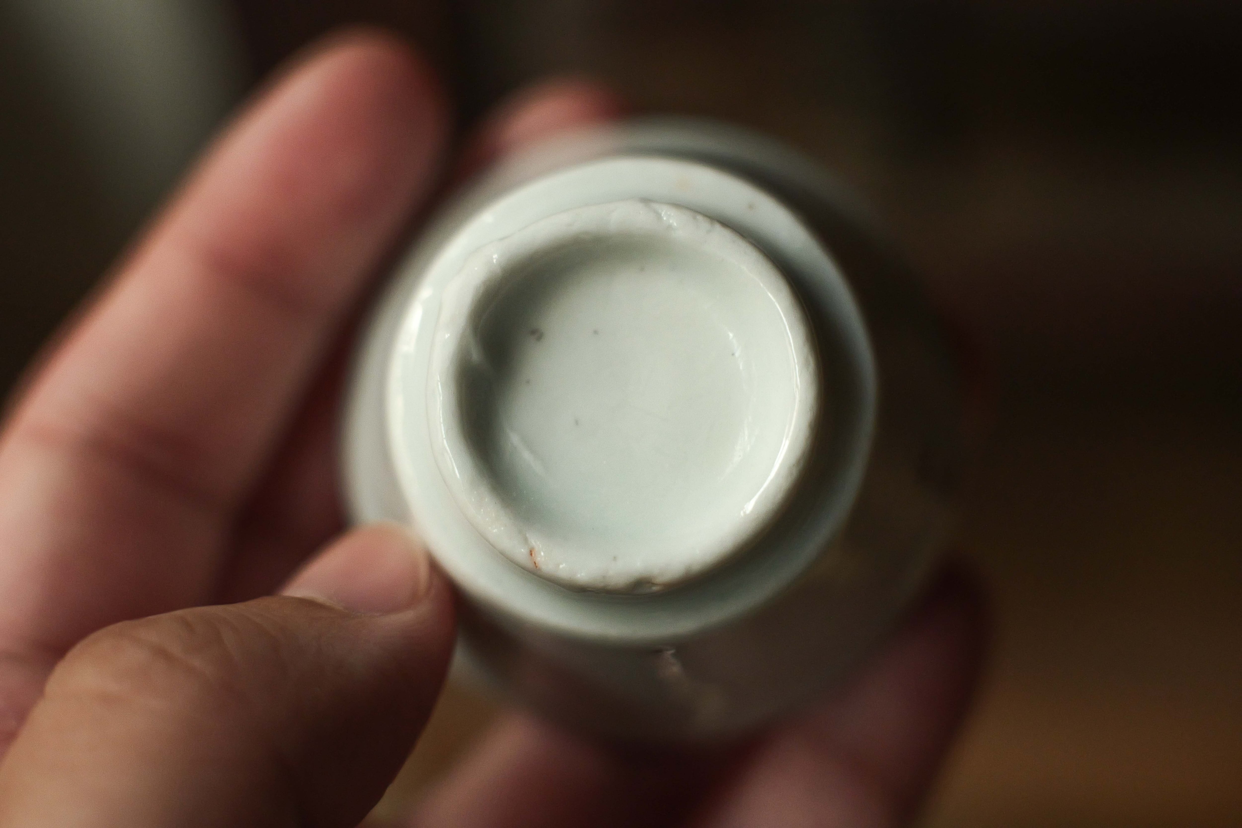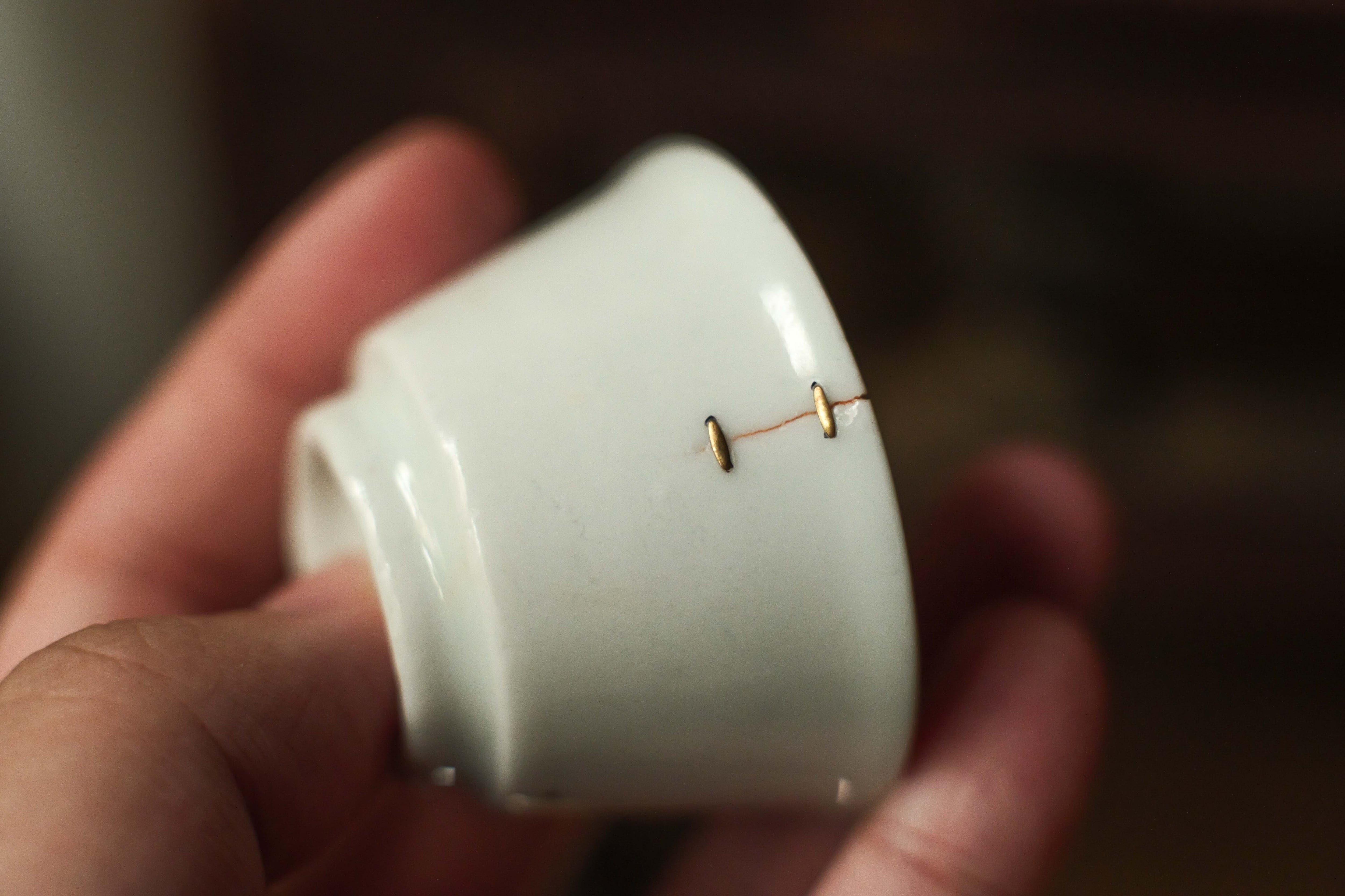 徳化の骨董屋で見つけた明代(約1368-1644年)徳化茶杯。 福州の修復師ユーさんに鎹で直していただいた。 * 「手拓」(型作り・手押し)技法による皺の絵 きれいな肌理 ‐ 窯の遺跡で集められたもの。還元焼で青みかかっている。 最近の復刻された手拓白磁の「馬蹄杯」の原型。 「きれい」な古馬蹄杯は最近出回りが少なくなっている気がする。