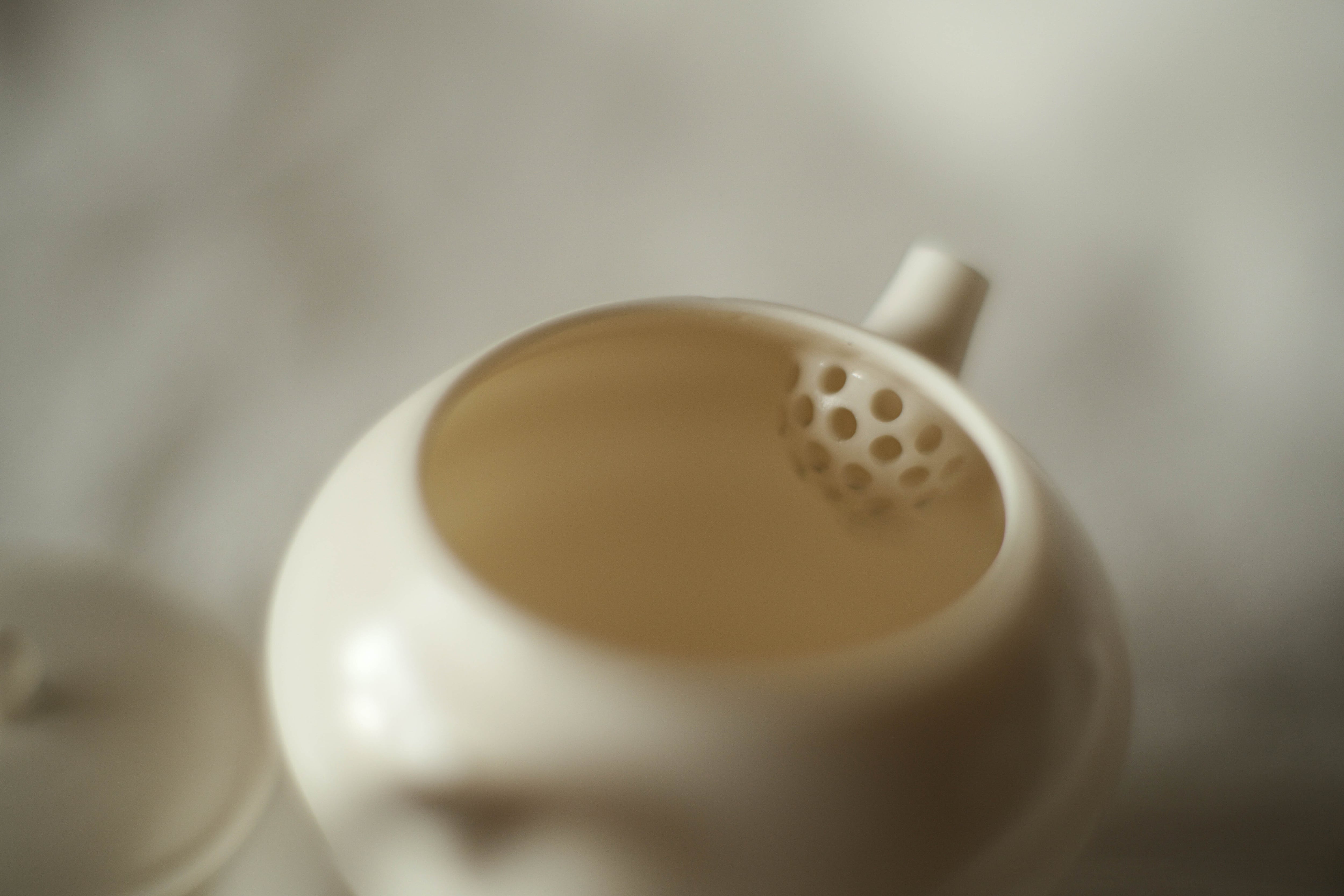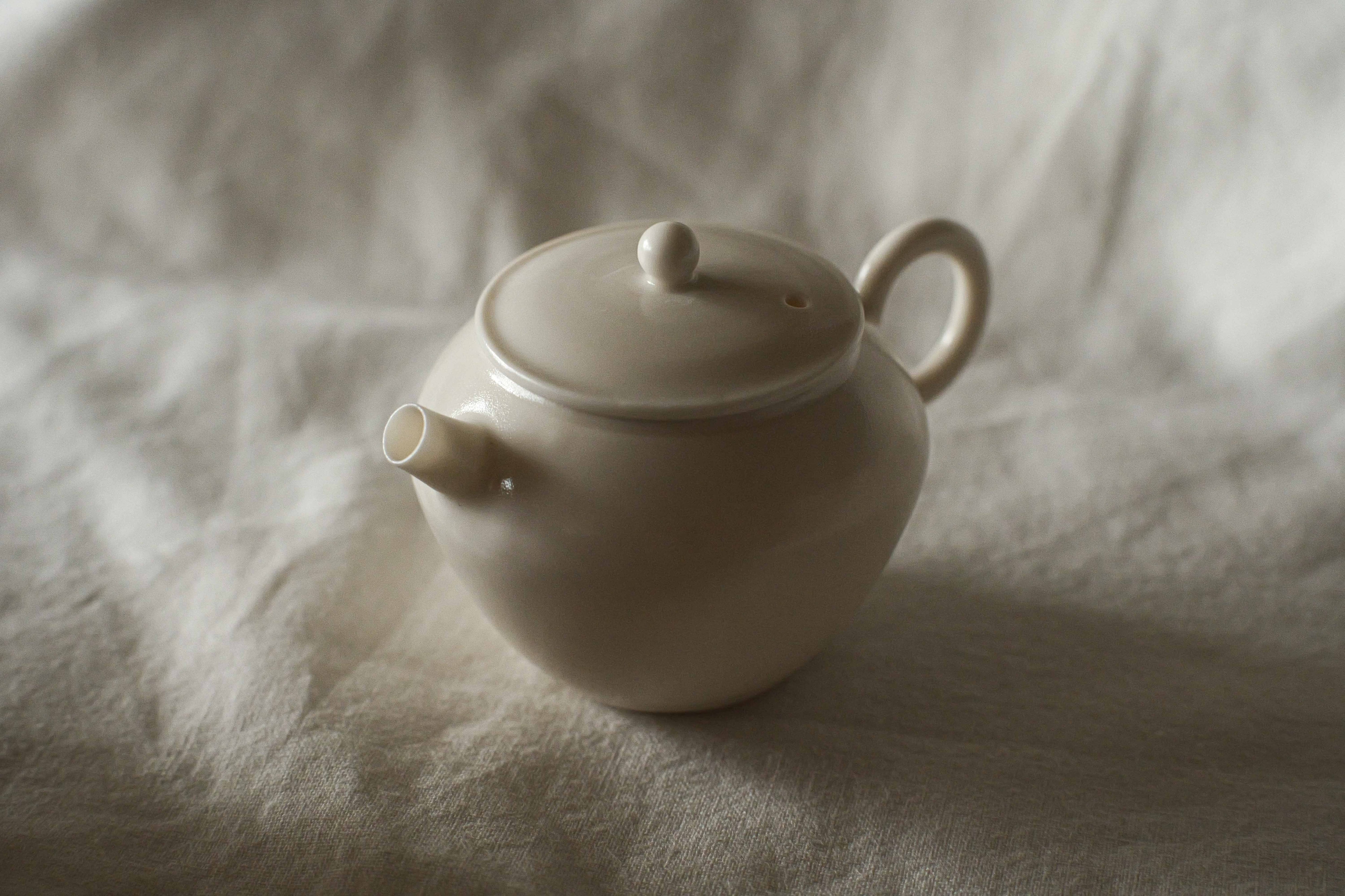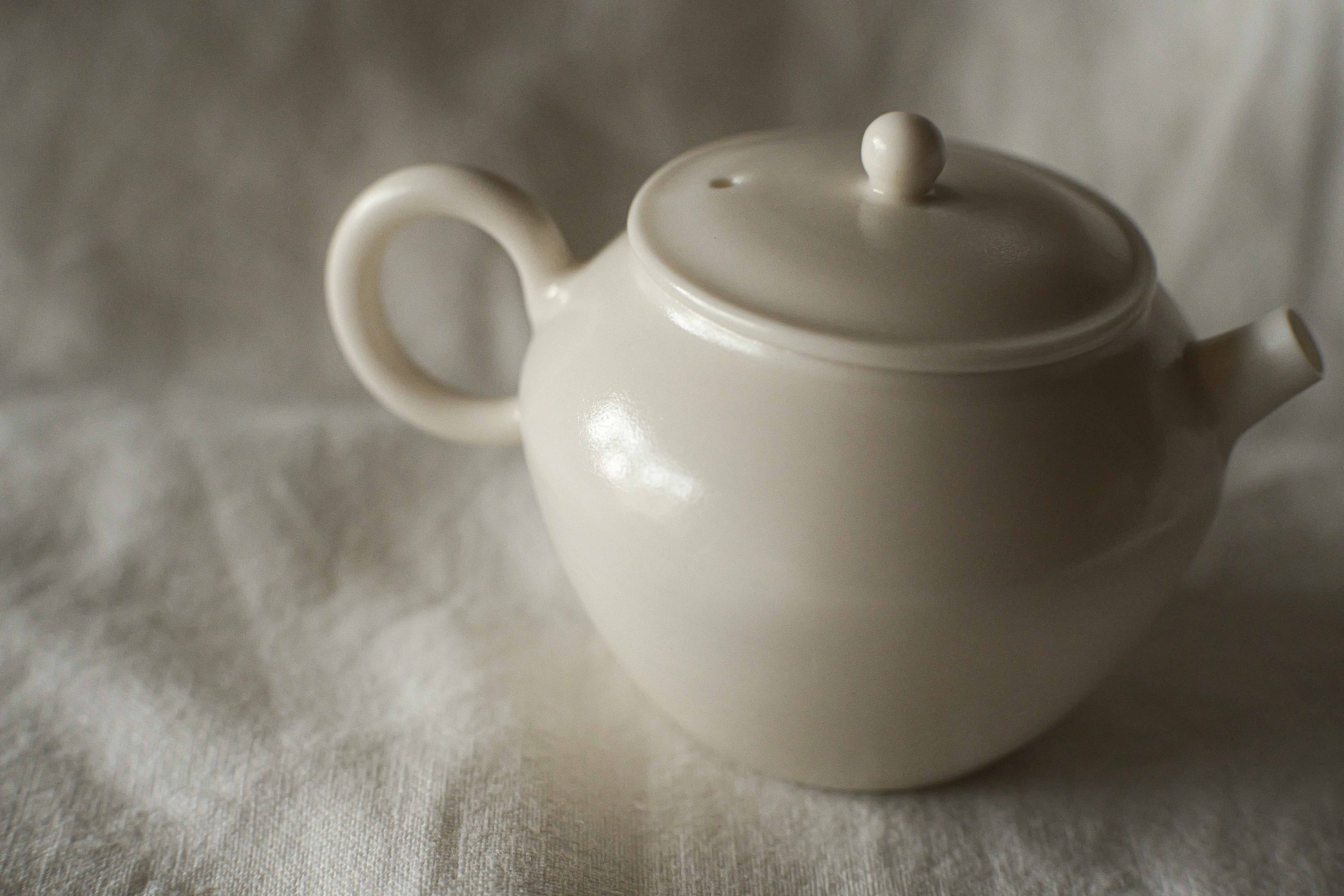 徳化で作陶している若手作家ヨウさんによるろくろ引き茶壺。 薄くて、精度が高いながら、取手、ツマミ、身から手の温もりを感じられる。 薪窯×白磁こそ出せる仄かなる質感と色合い。 その時作家の感覚にによる形で、全部一点物。 重さ:52g