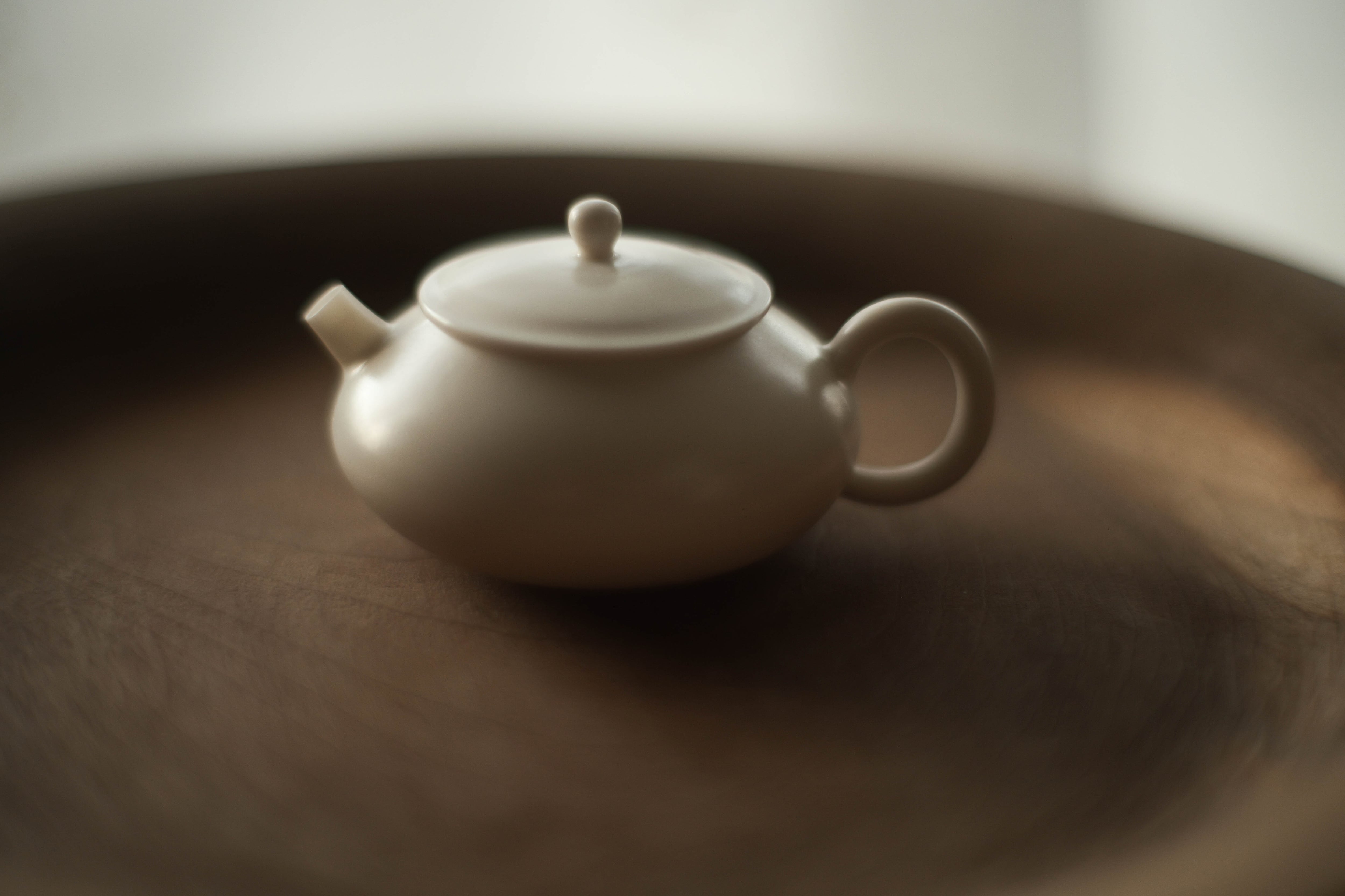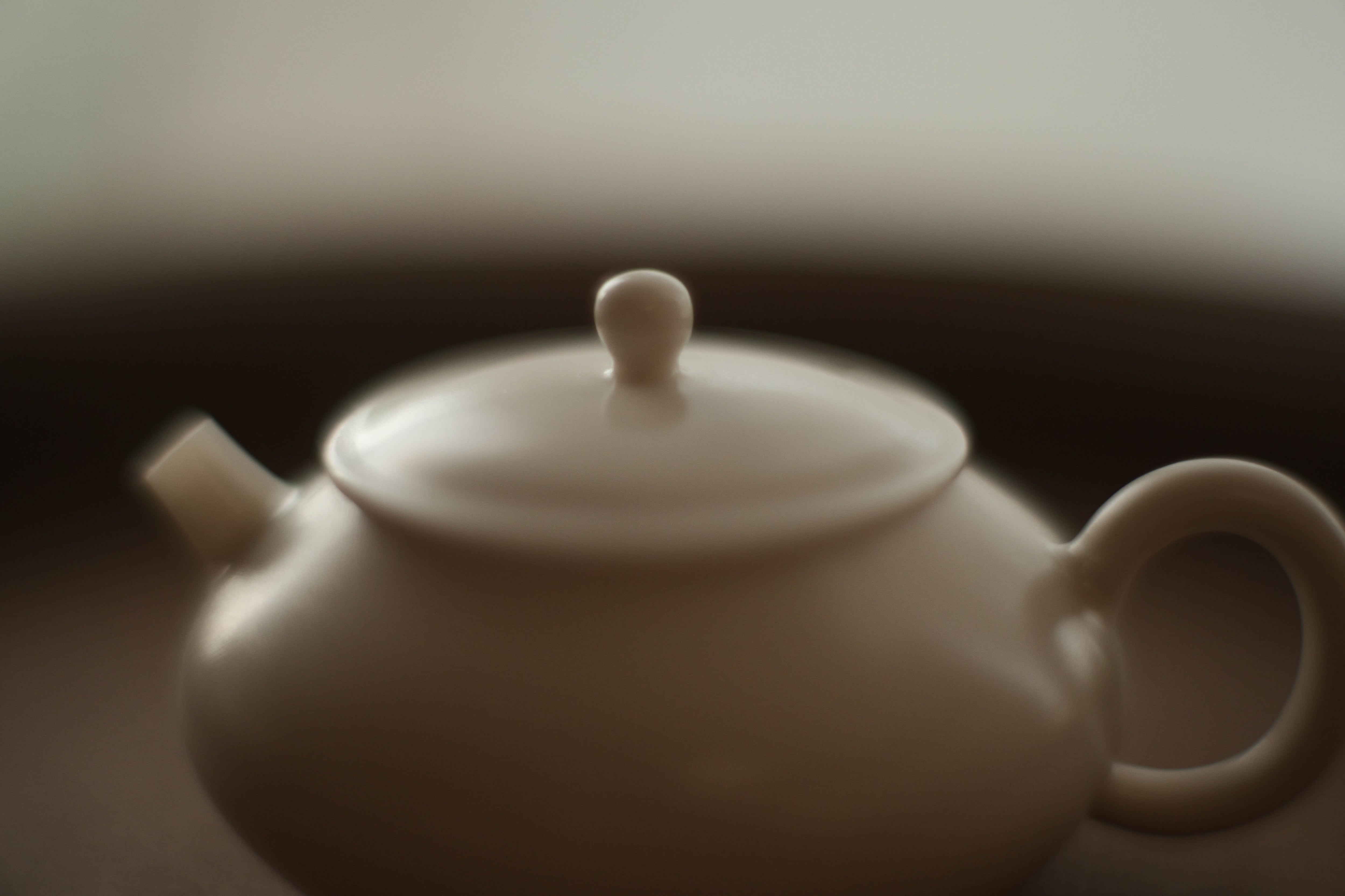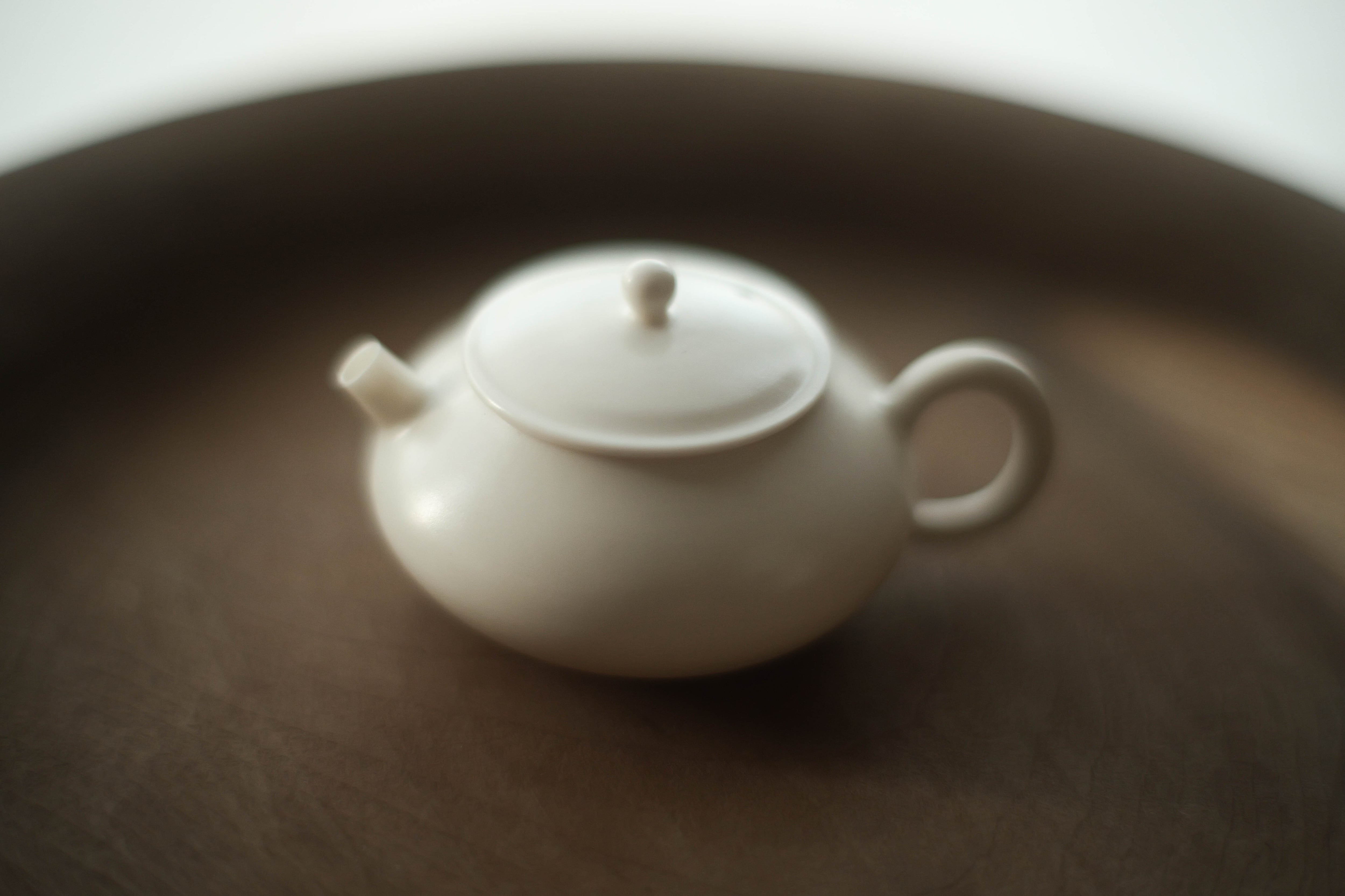 徳化で作陶している若手作家ヨウさんによるろくろ引き茶壺。 薄くて、精度が高いながら、取手、ツマミ、身から手の温もりを感じられる。 薪窯×白磁こそ出せる仄かなる質感と色合い。 その時作家の感覚にによる形で、全部一点物。 重さ:60g
