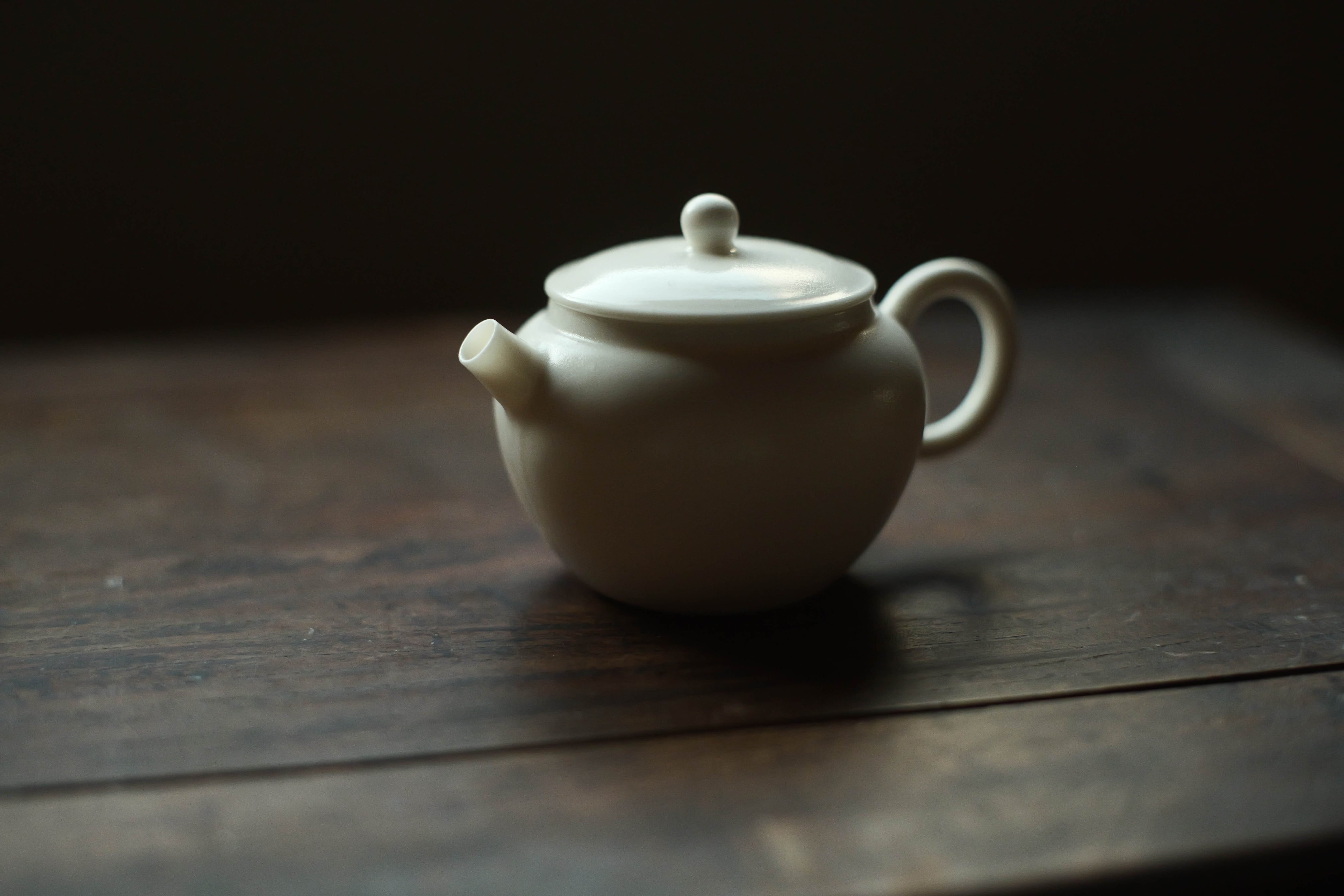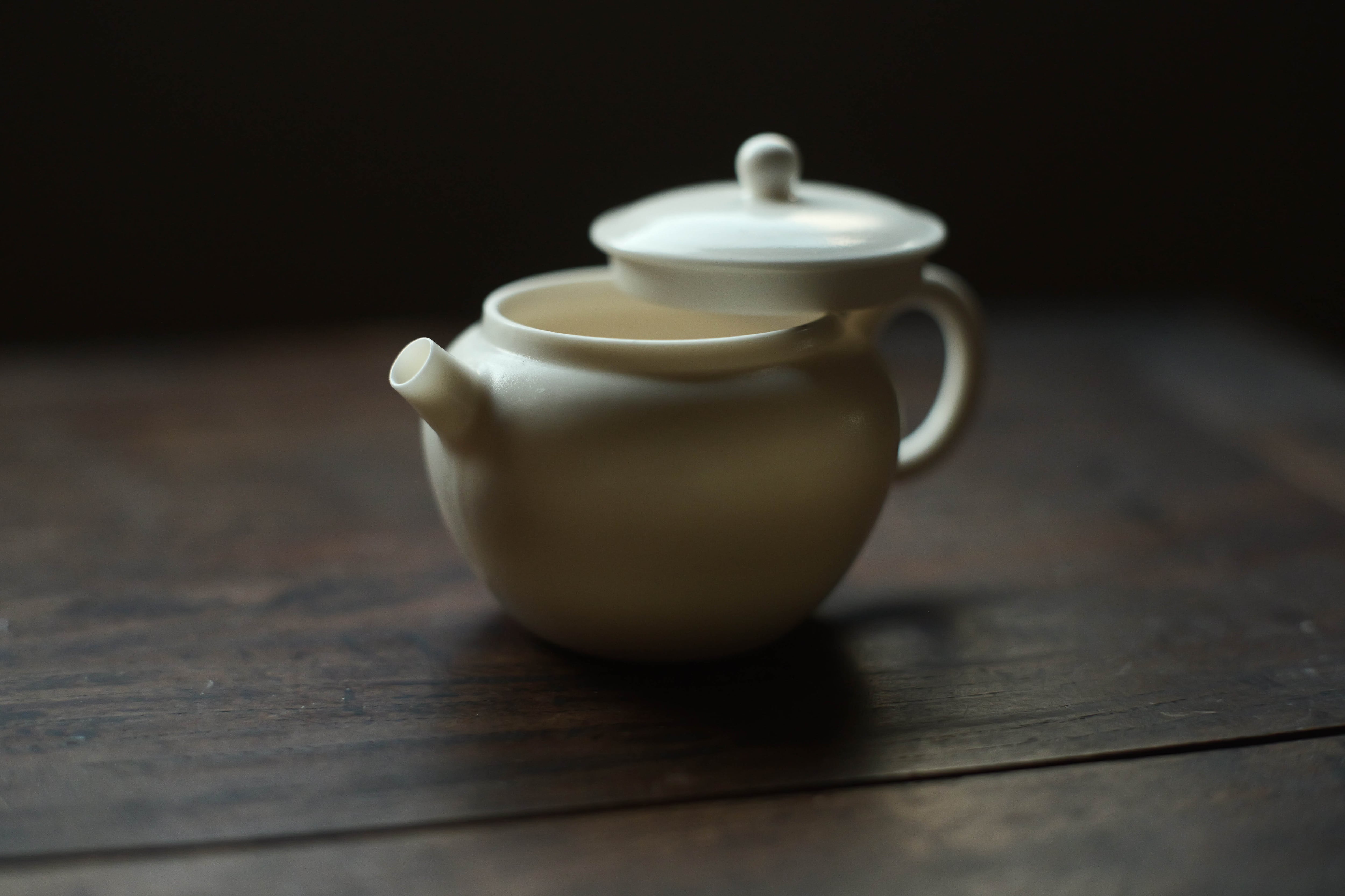 徳化で作陶している若手作家ヨウさんによるろくろ引き茶壺。 薄くて、精度が高いながら、取手、ツマミ、身から手の温もりを感じられる。 薪窯×白磁こそ出せる仄かなる質感と色合い。 その時作家の感覚にによる形で、全部一点物。 重さ:53.7g