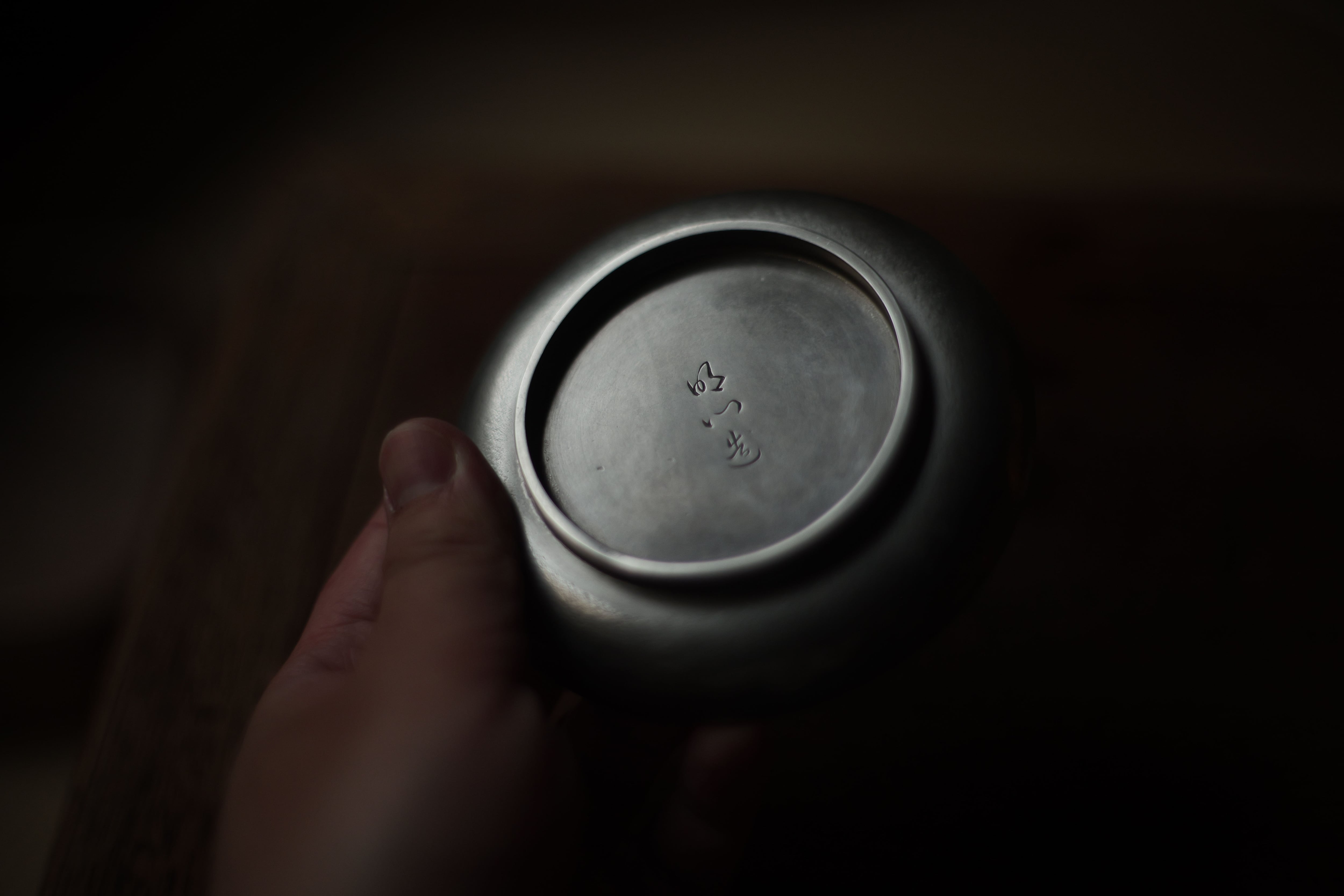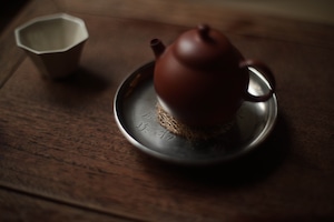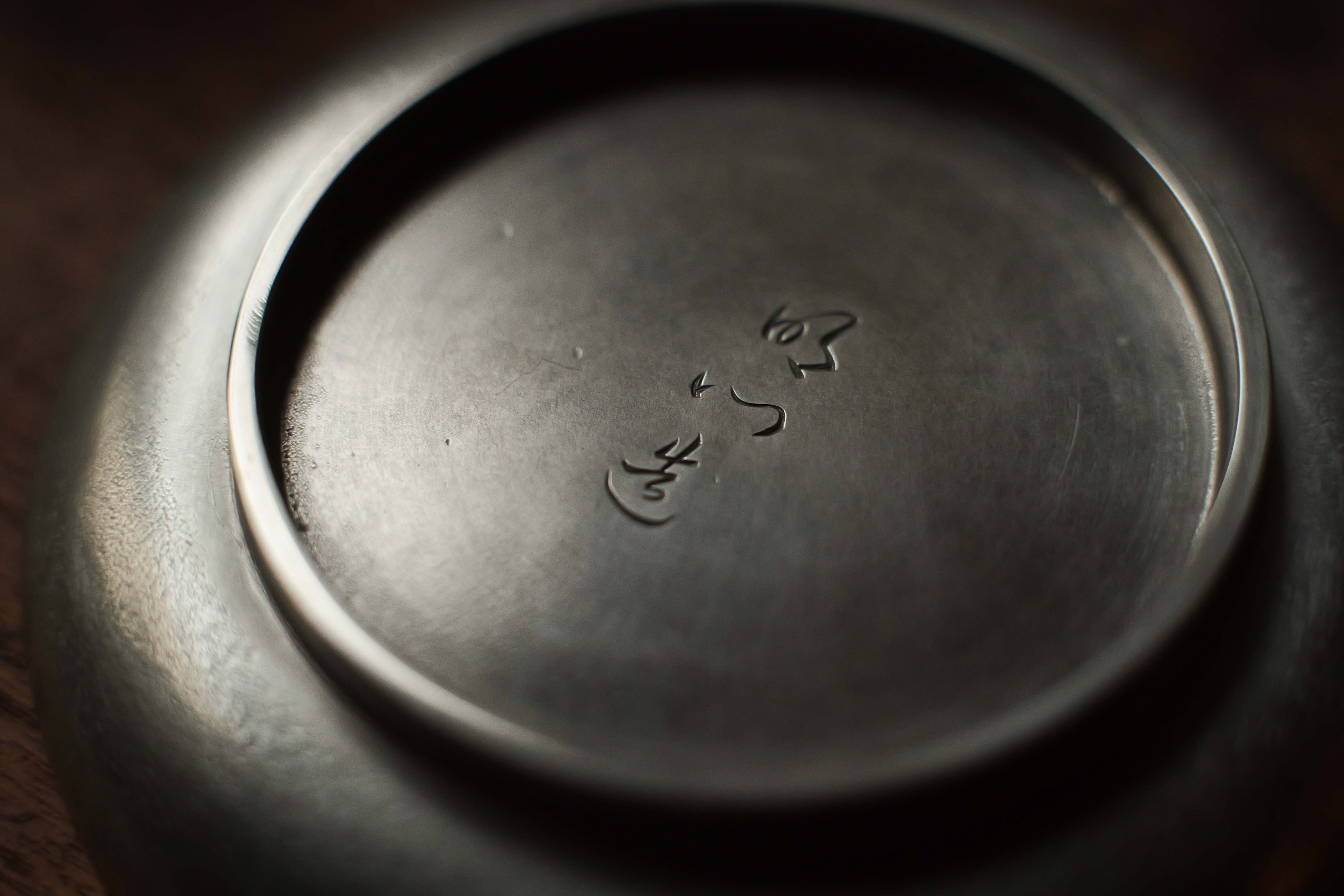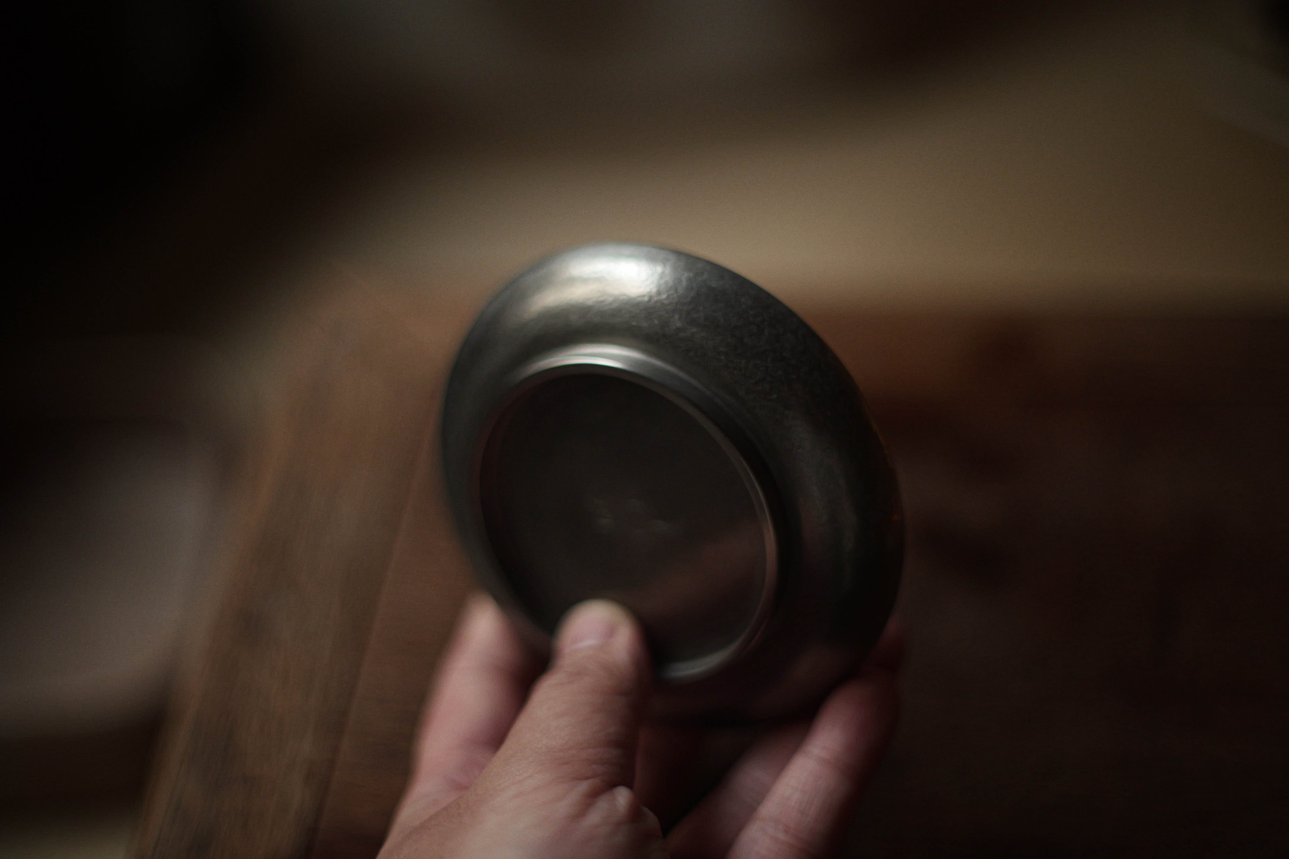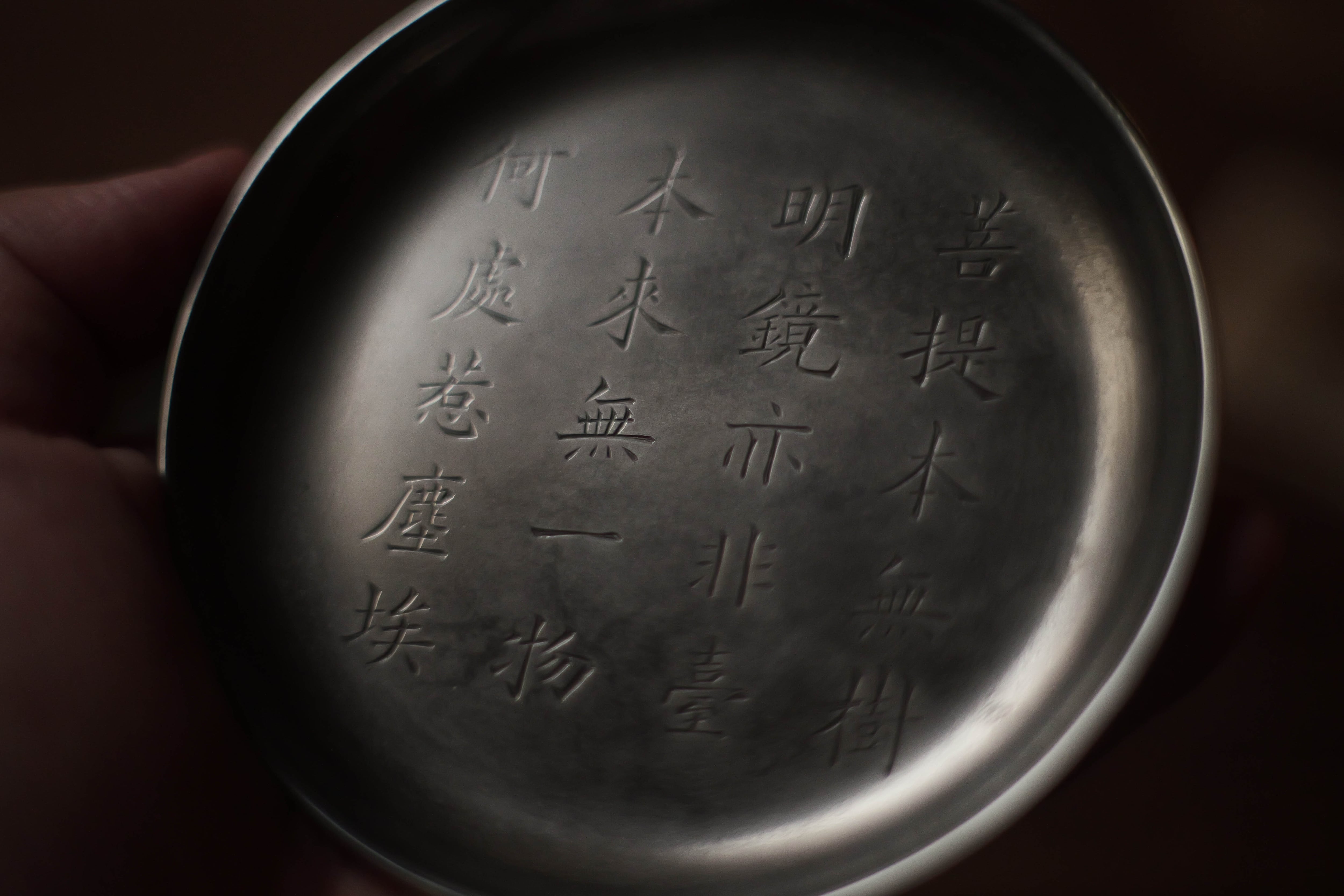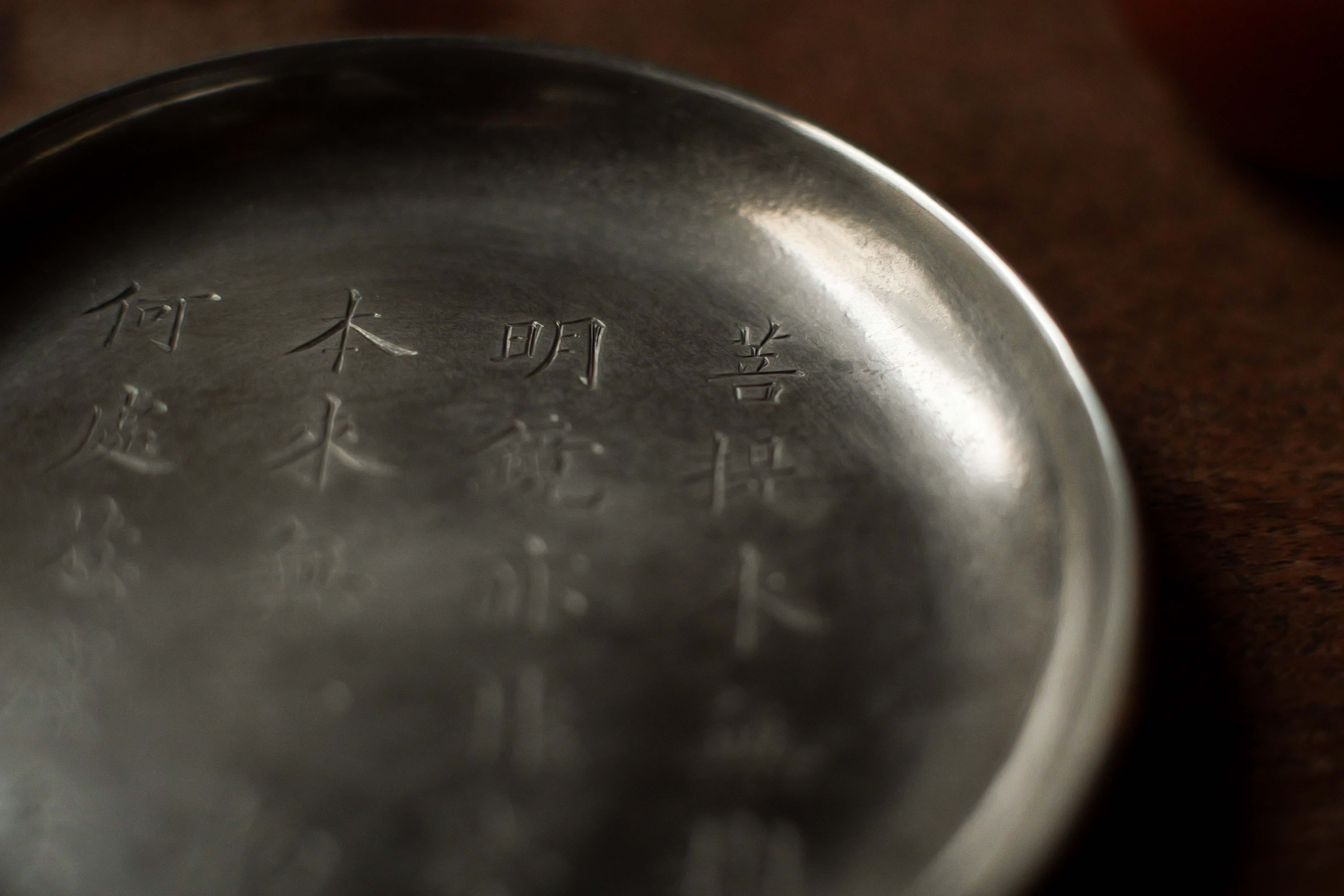 丸い錫板に彫刻した後に、打ち起こして皿に造形した。