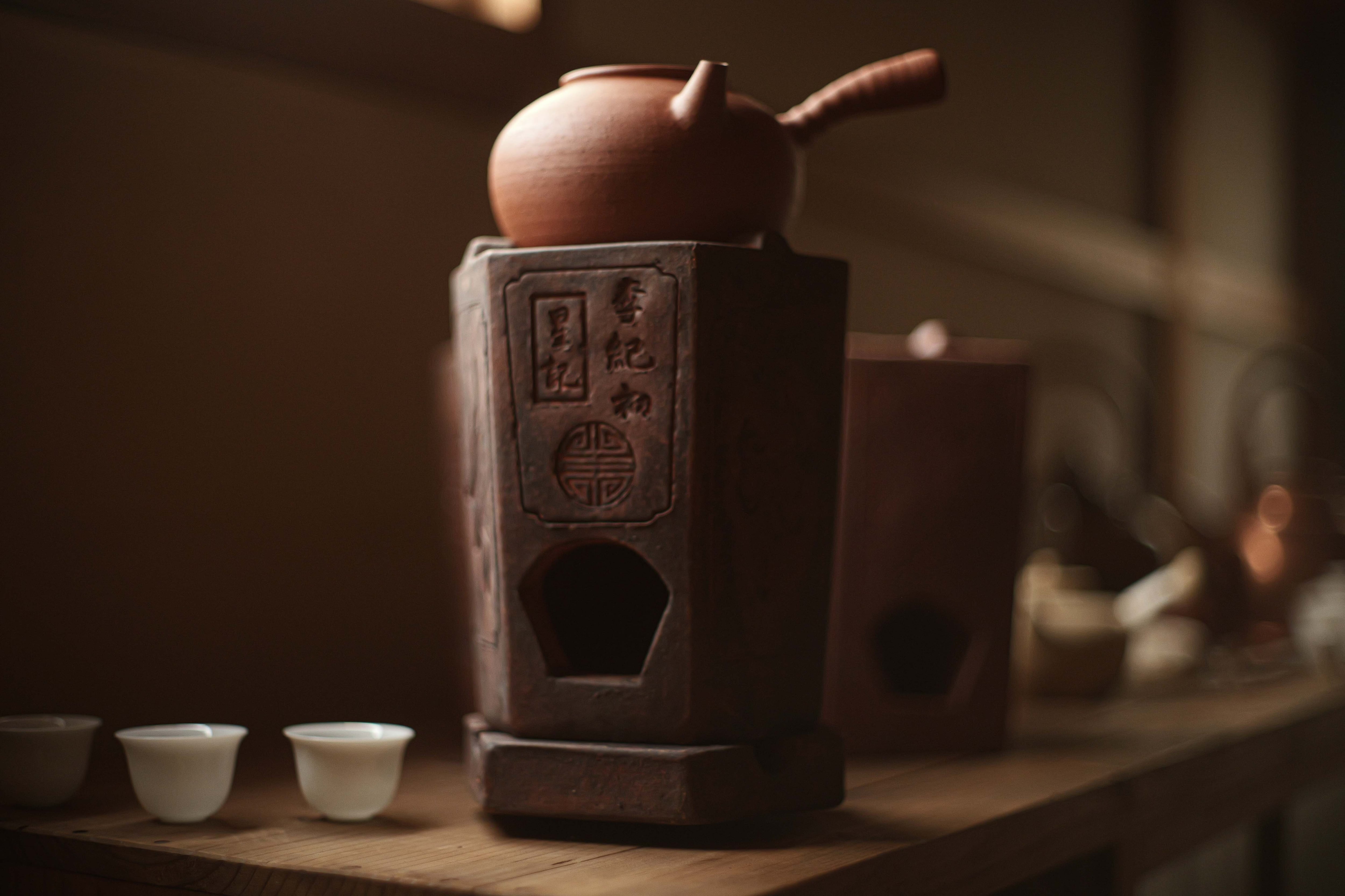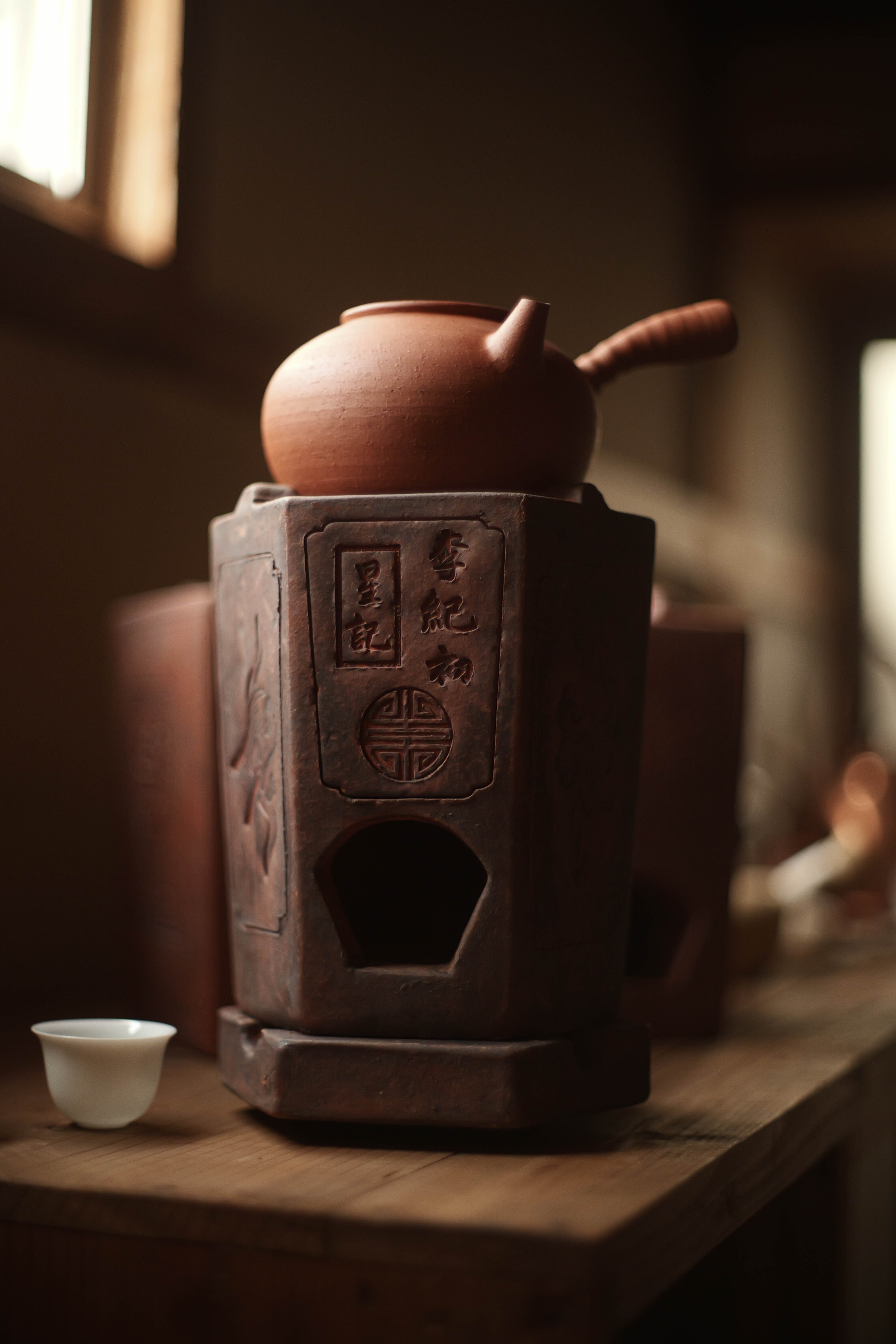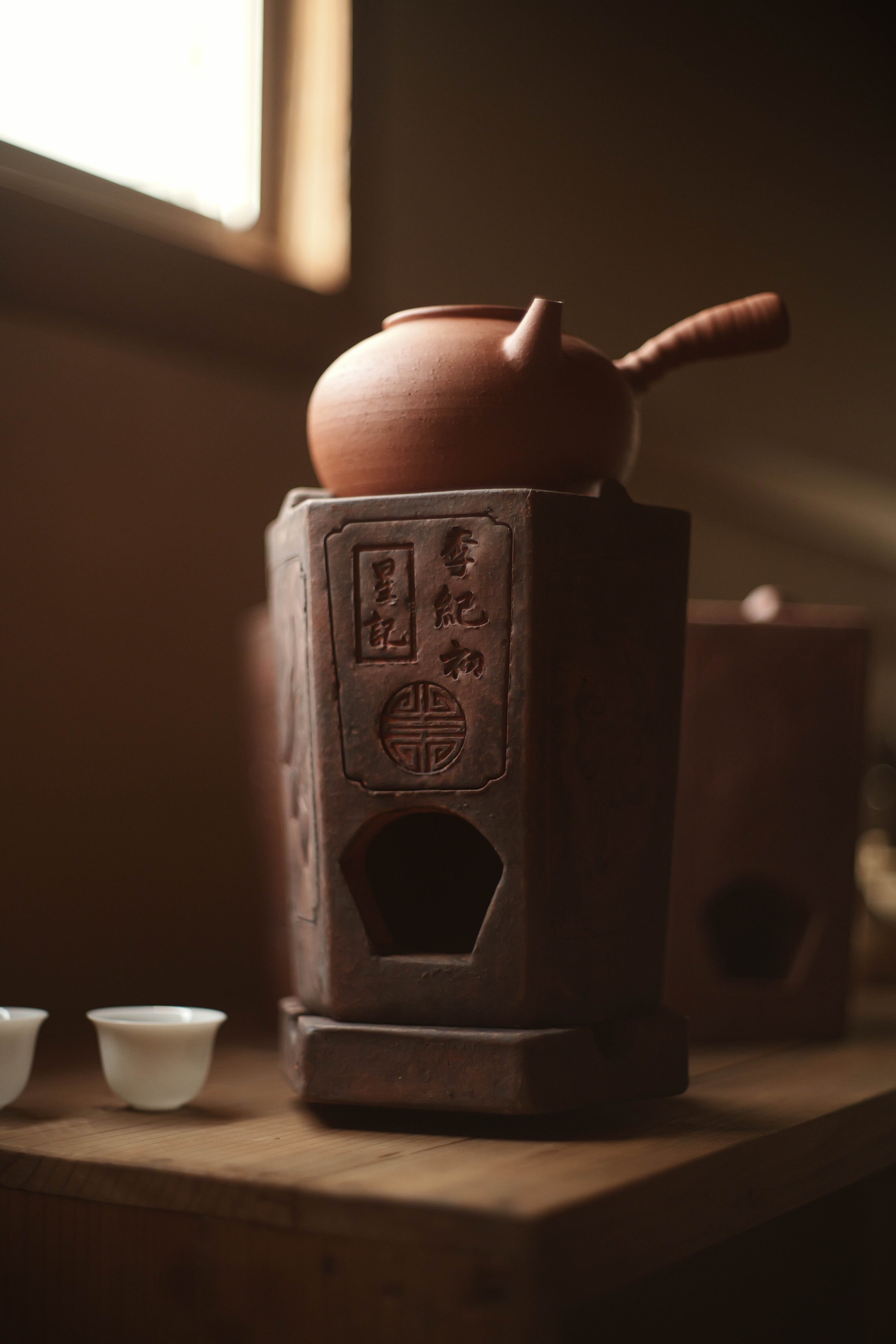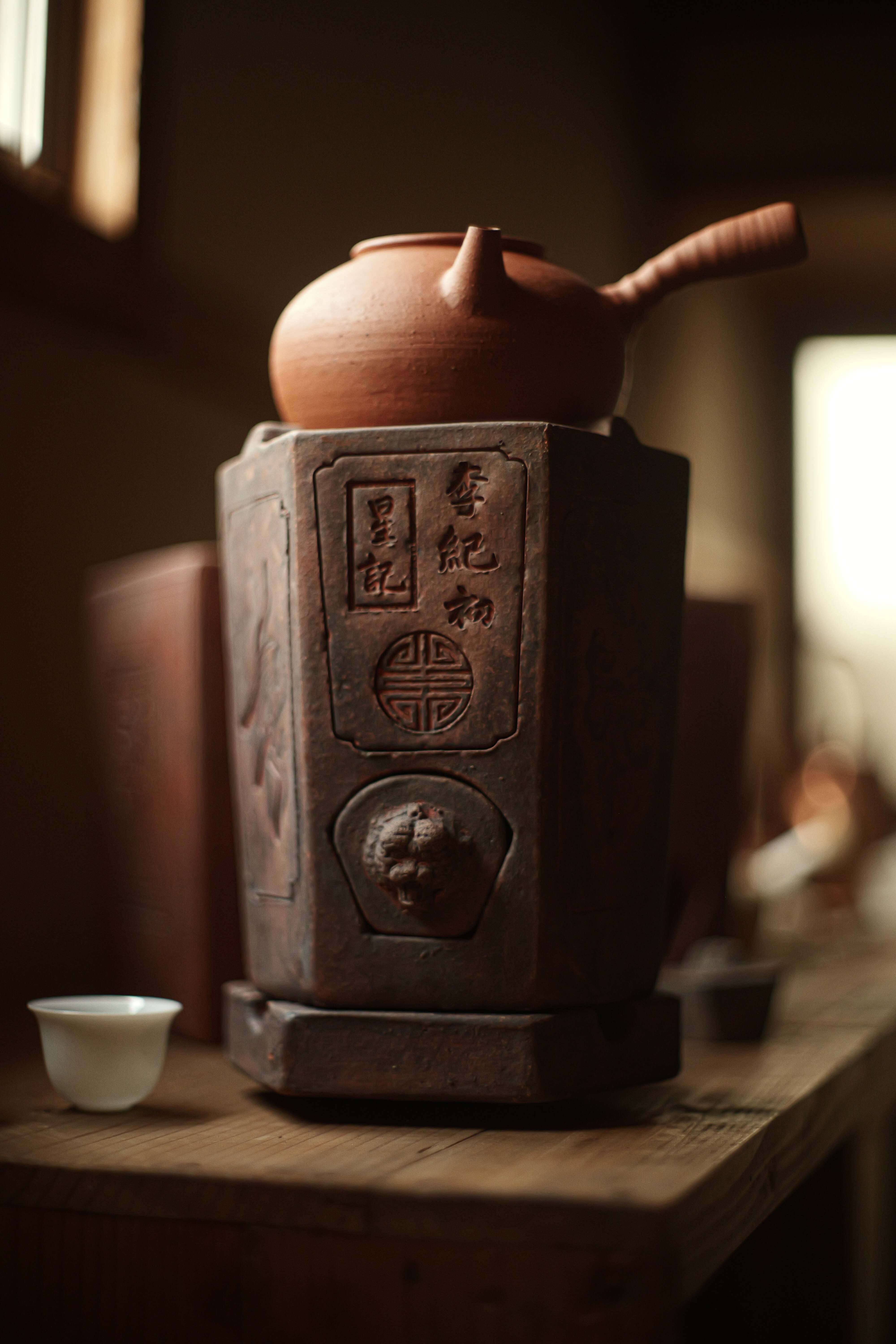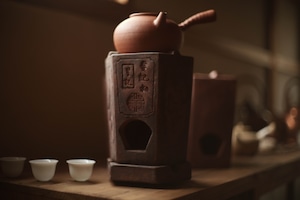 蓋と炉台(足付き)兼用のグッドデザインの蓋がついていて、 獅子の形する風門を塞ぐ蓋も昔の中華という味わい。 サイズ 15×13×18.5cm