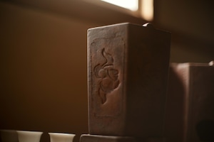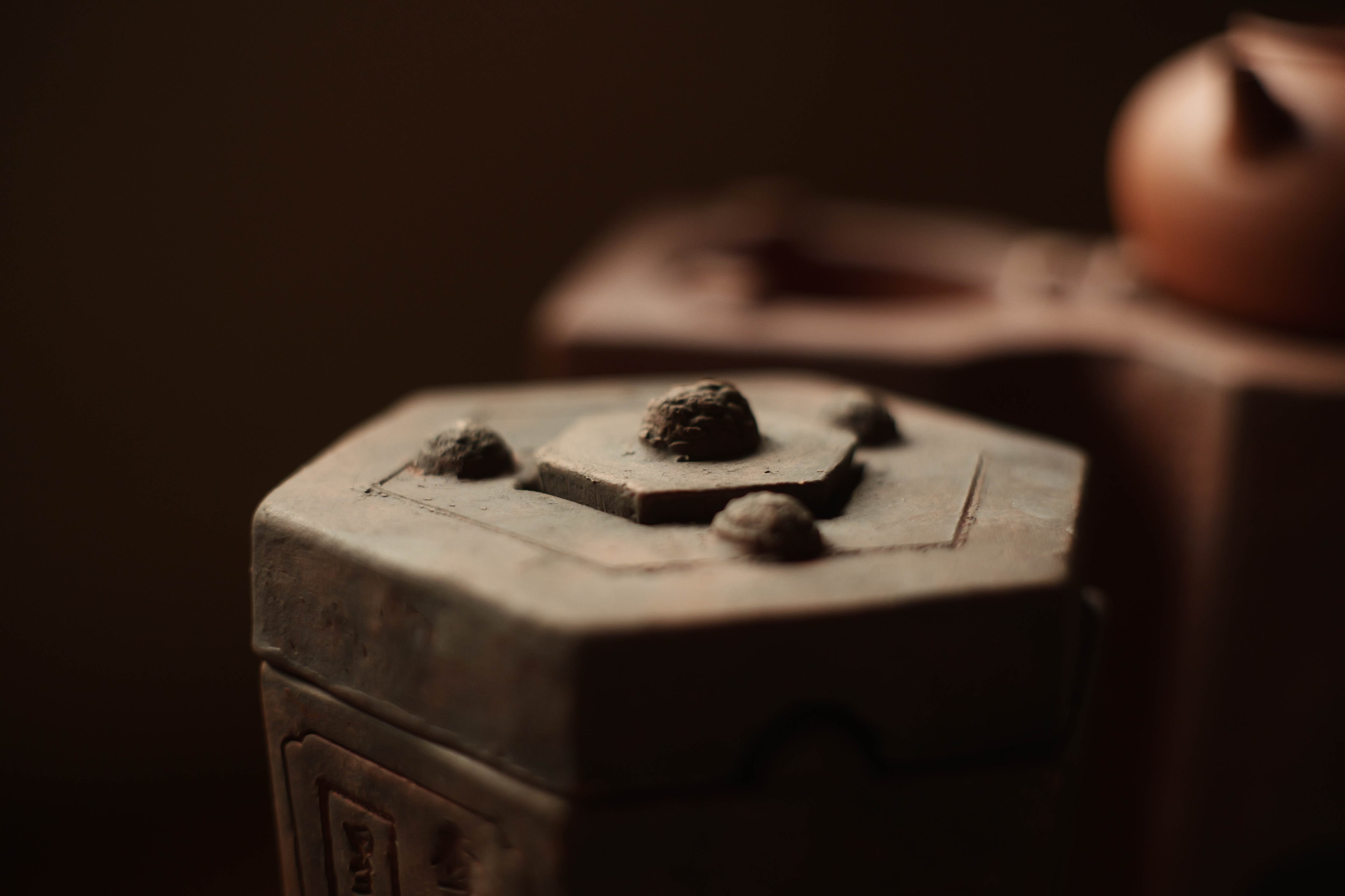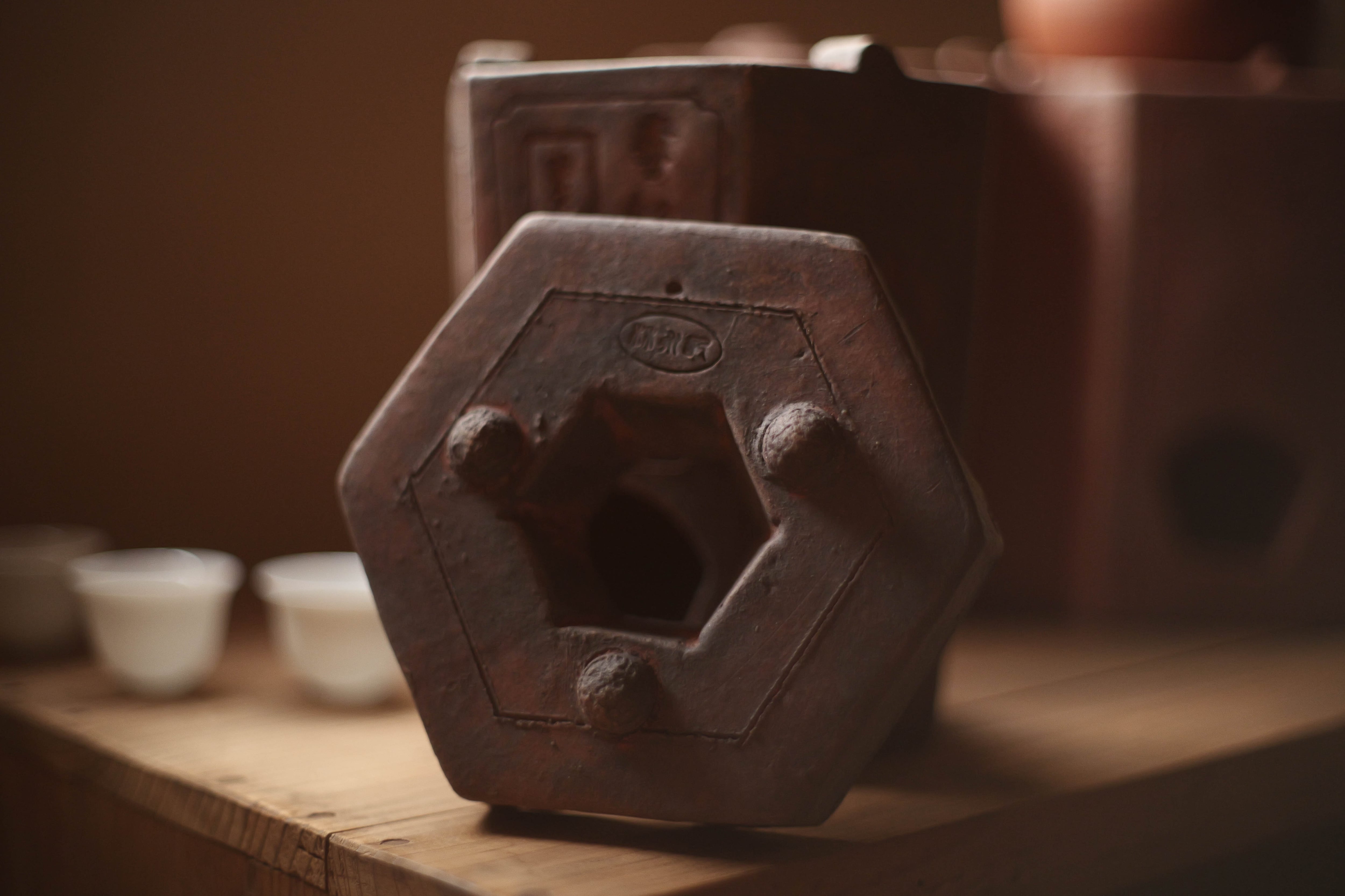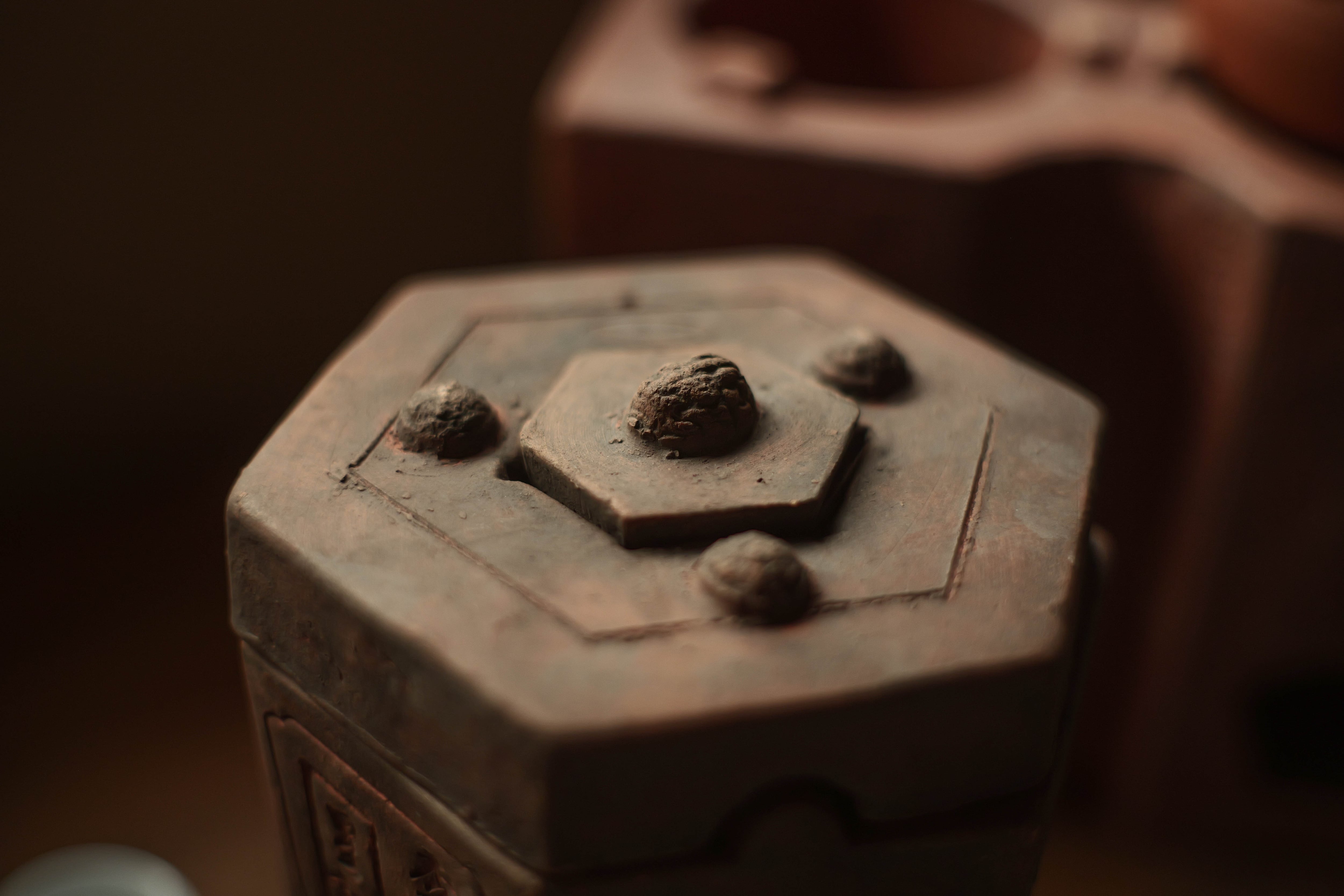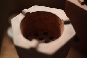 蓋と炉台(足付き)兼用のグッドデザインの蓋がついていて、 獅子の形する風門を塞ぐ蓋も昔の中華という味わい。 サイズ 15×13×18.5cm