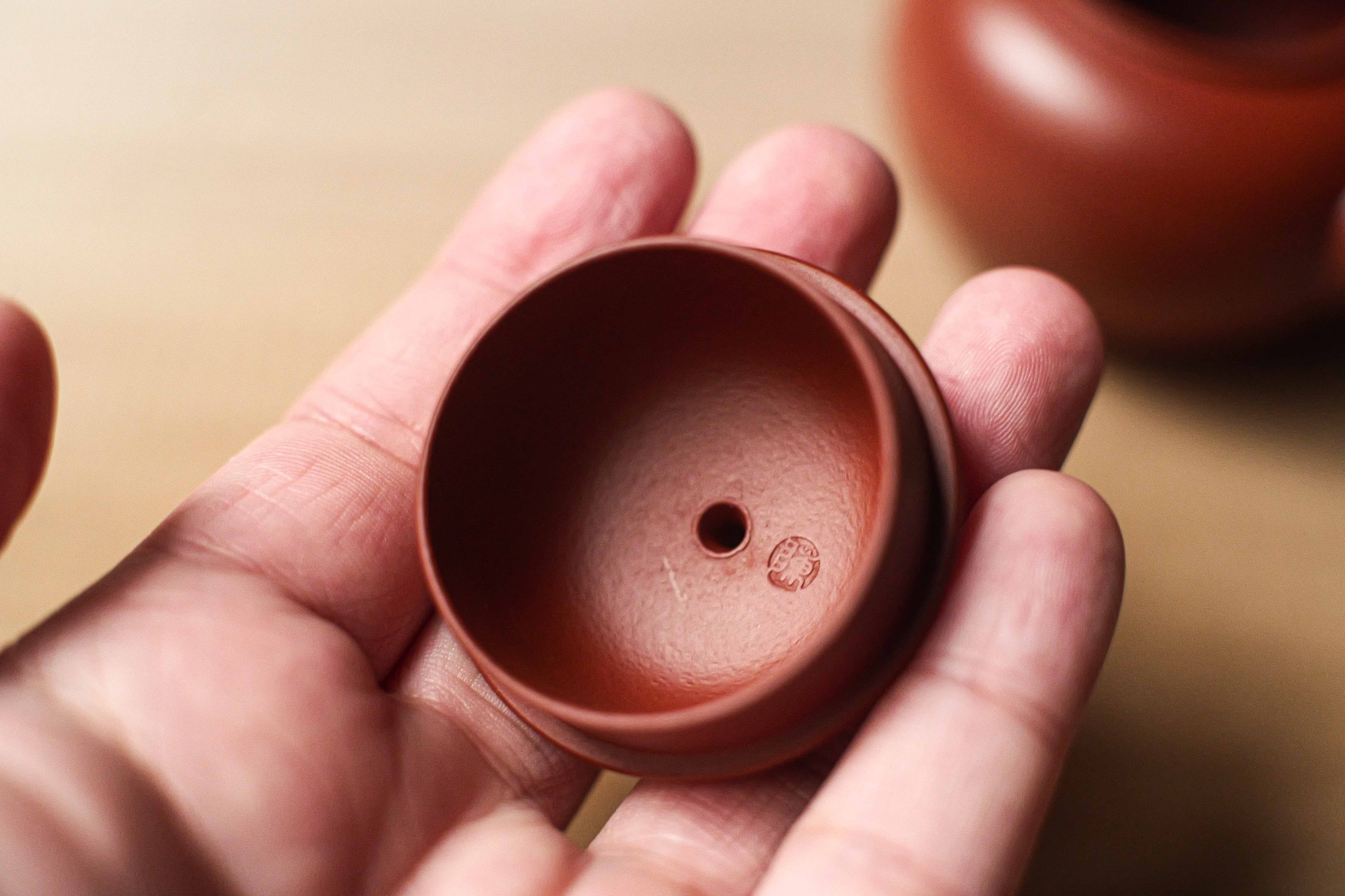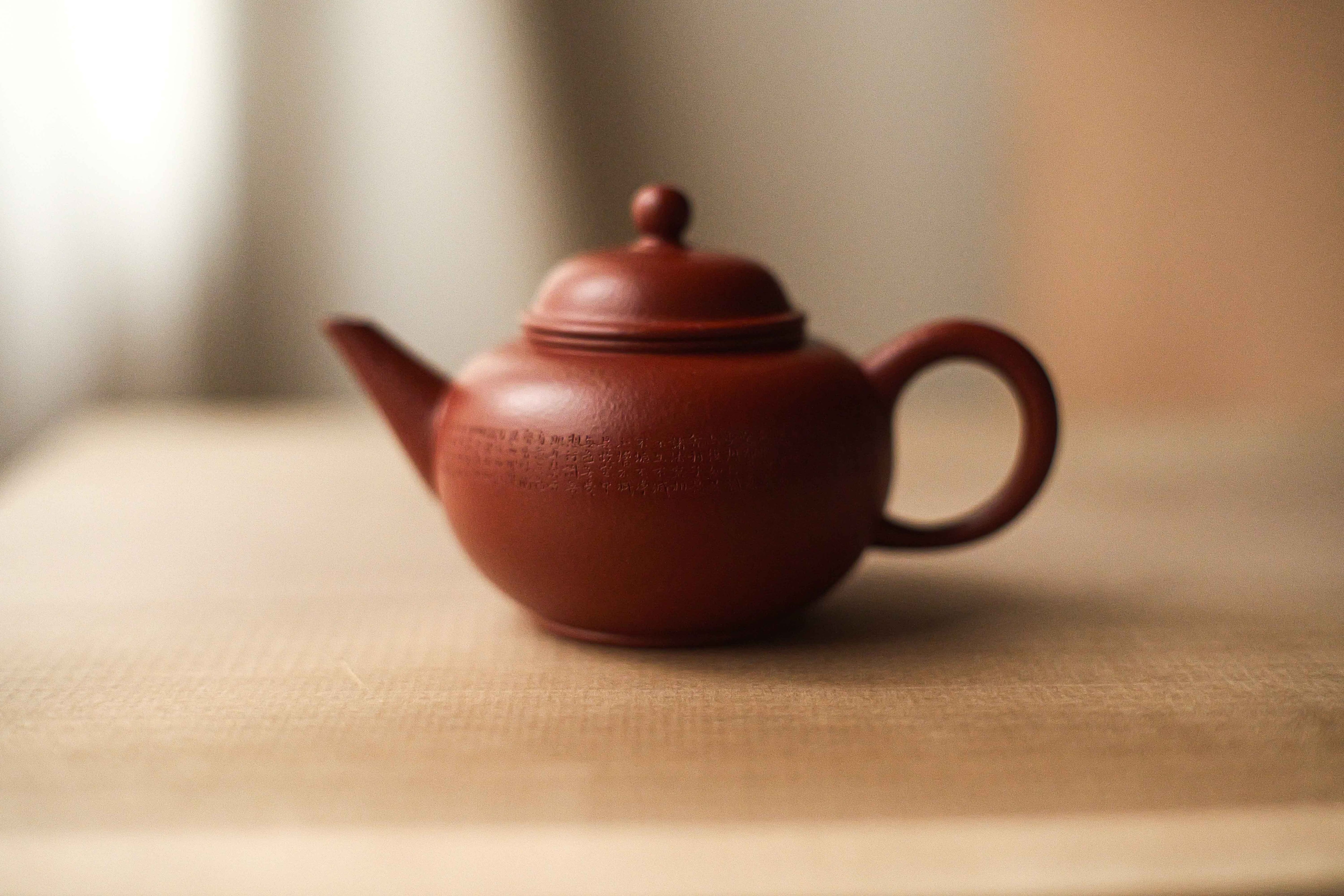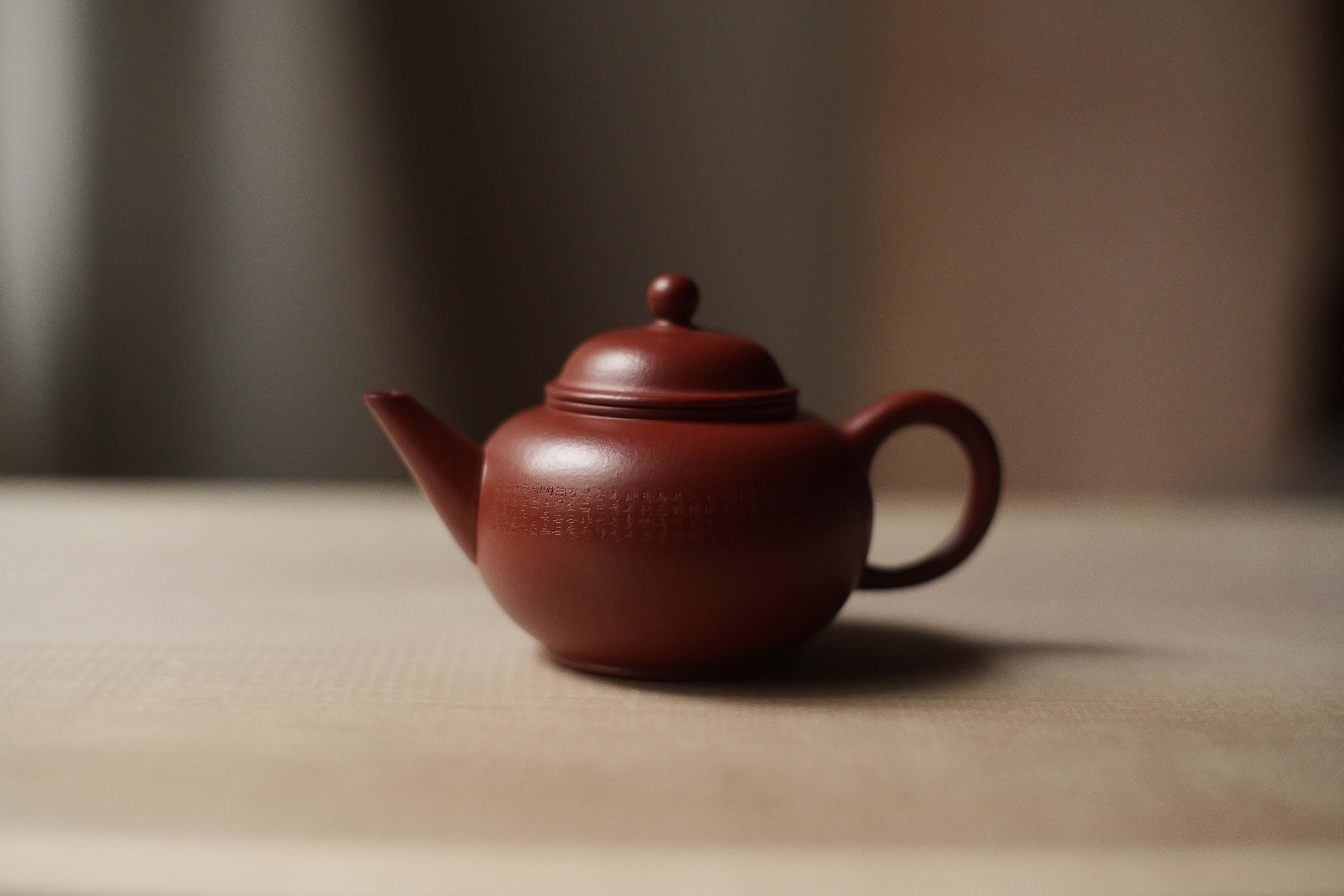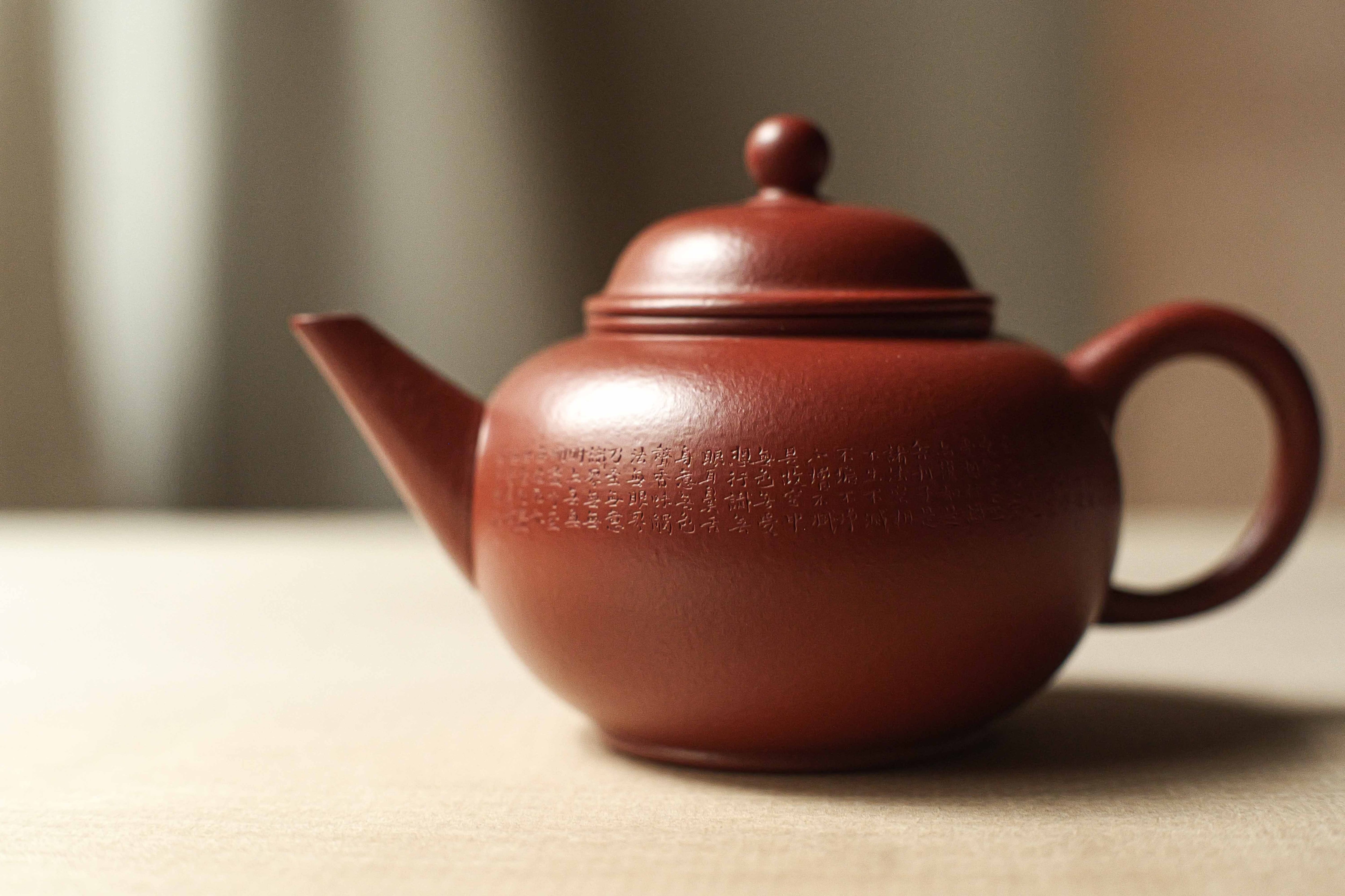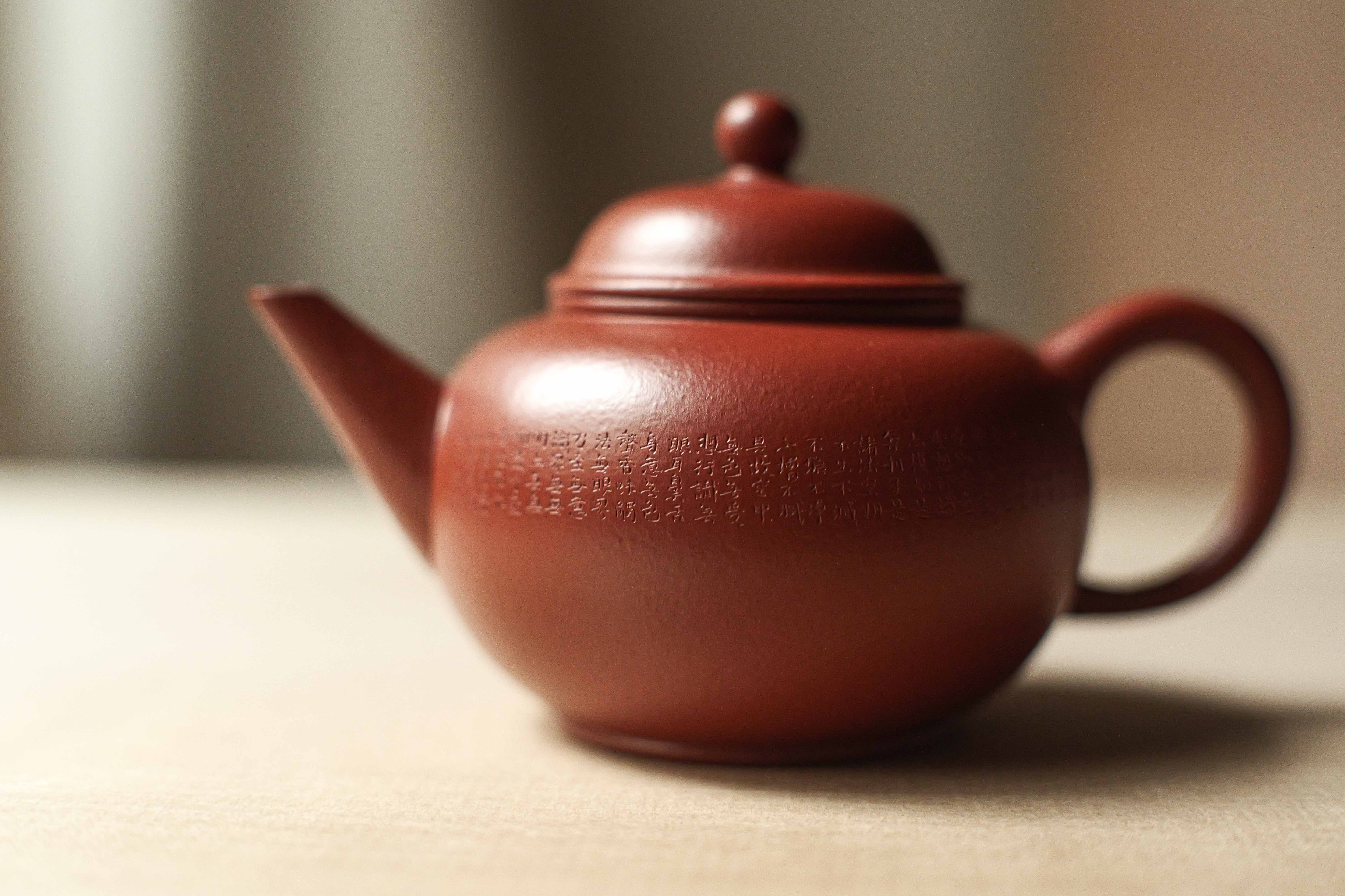 グレードの高い朱泥で完全手作りの水平壺。 オーソドックスな形に手によるアレンジが加えらた形です。 急須の作者は陳亮で、 般若心経を彫った彫刻家は王清松です。 この個体は作者自らの評定によって、やや安めの値段が付けられています。 形を使用いなくて、個体によって 形・バランスがかなり違うので、 一点物として扱わせていただき、 急須ごとに撮影して登録させていただきます。 写真でよく確認していただければ嬉しいです。 満水容量は約120cc