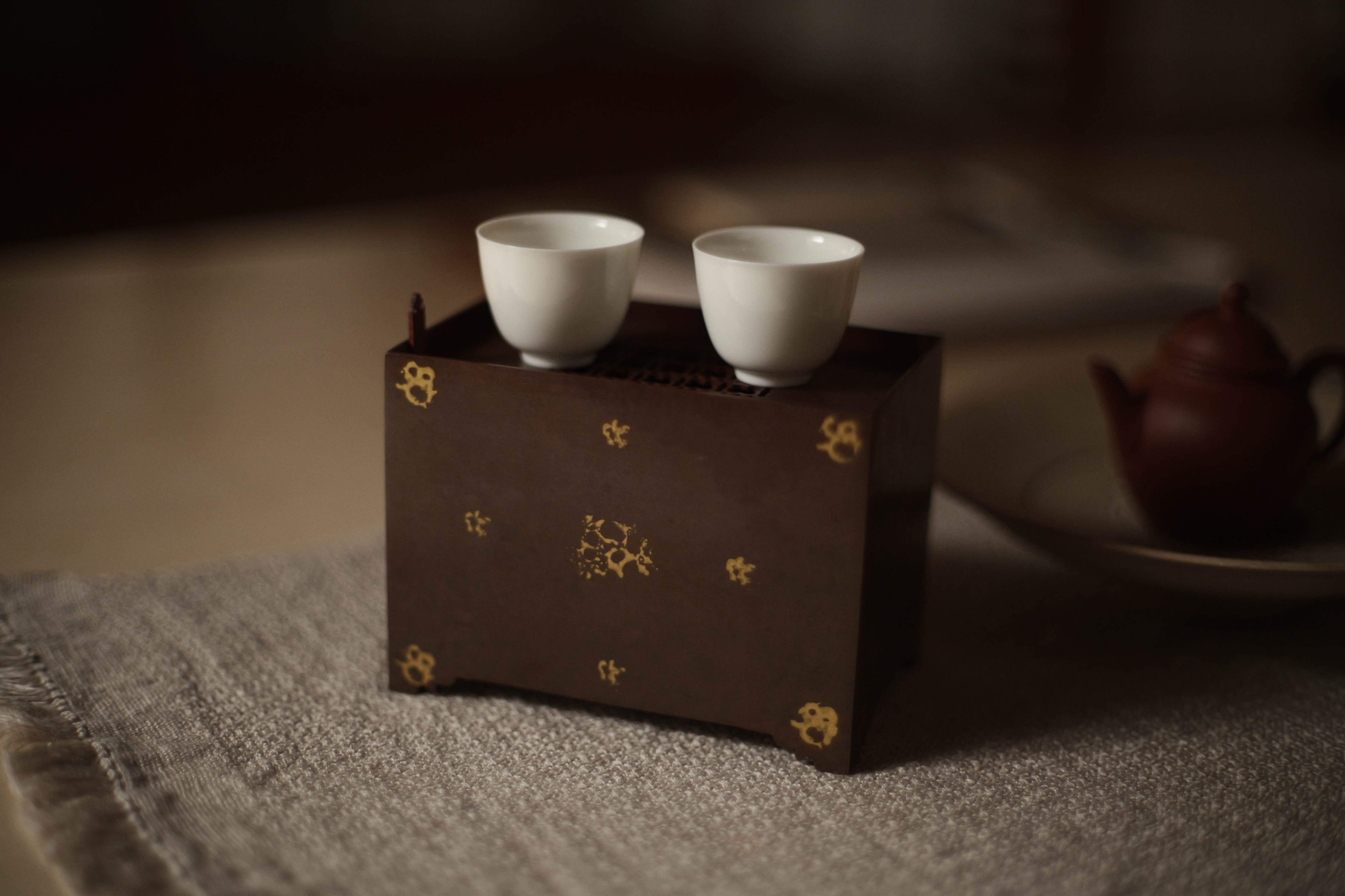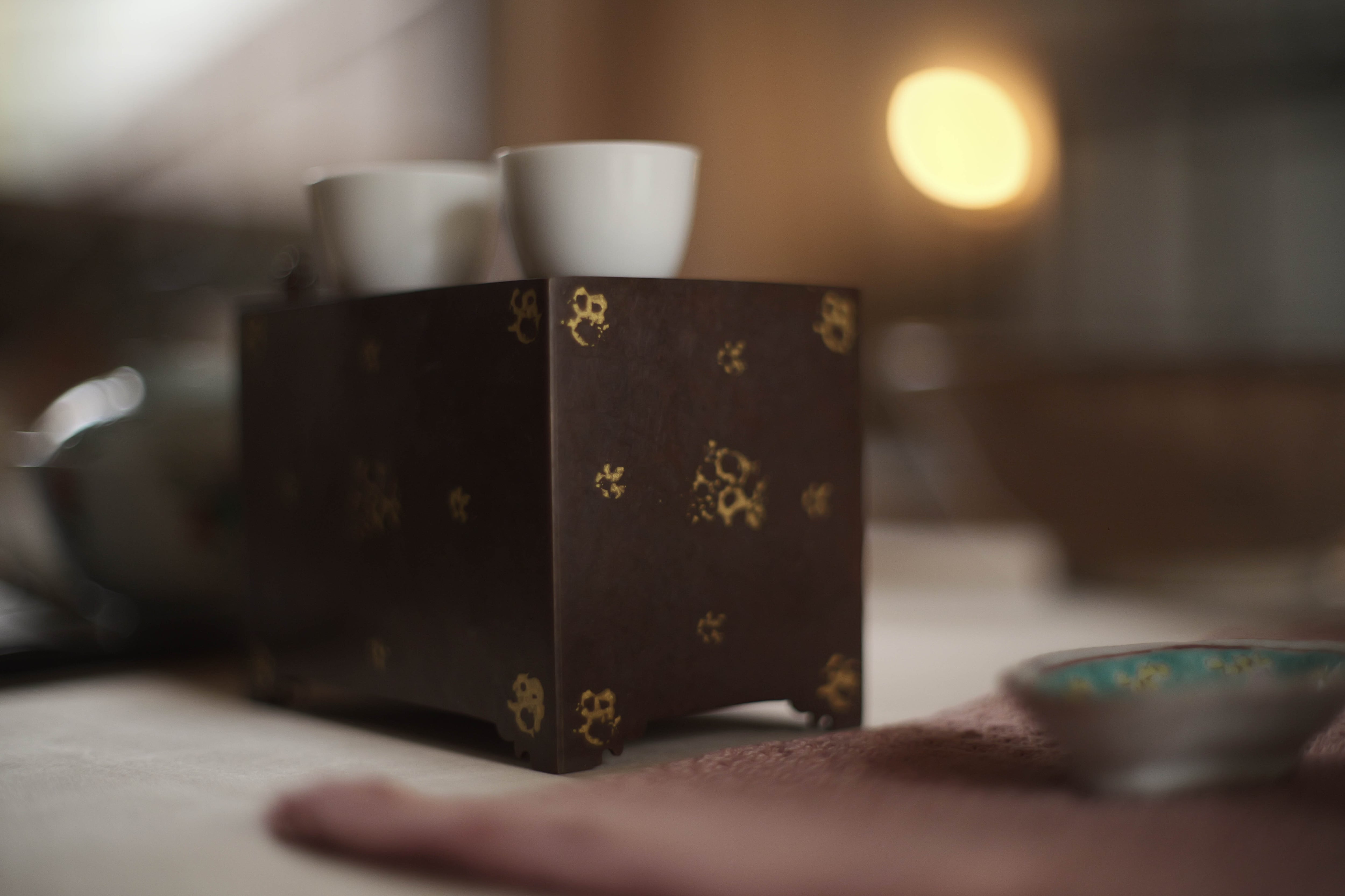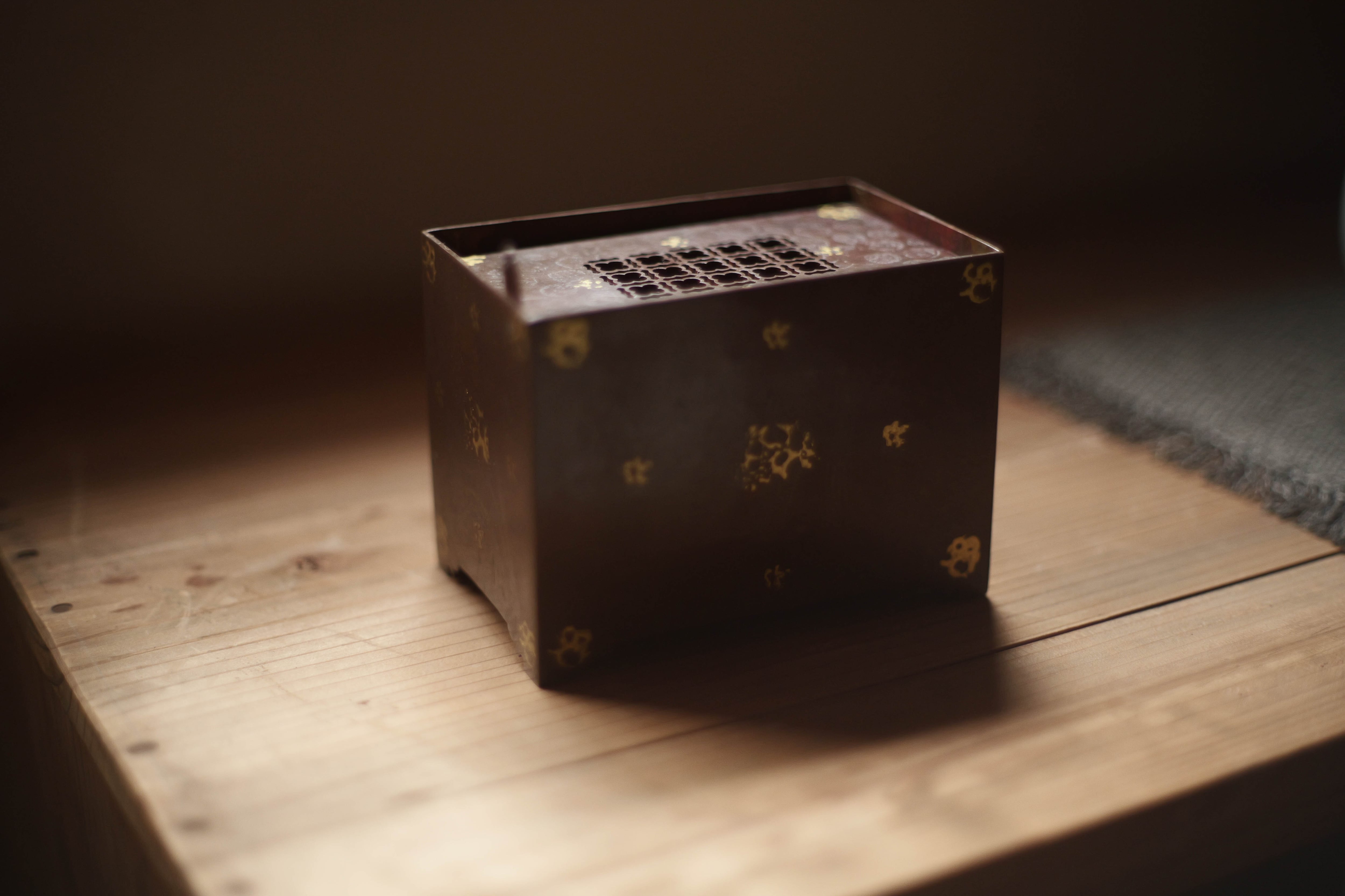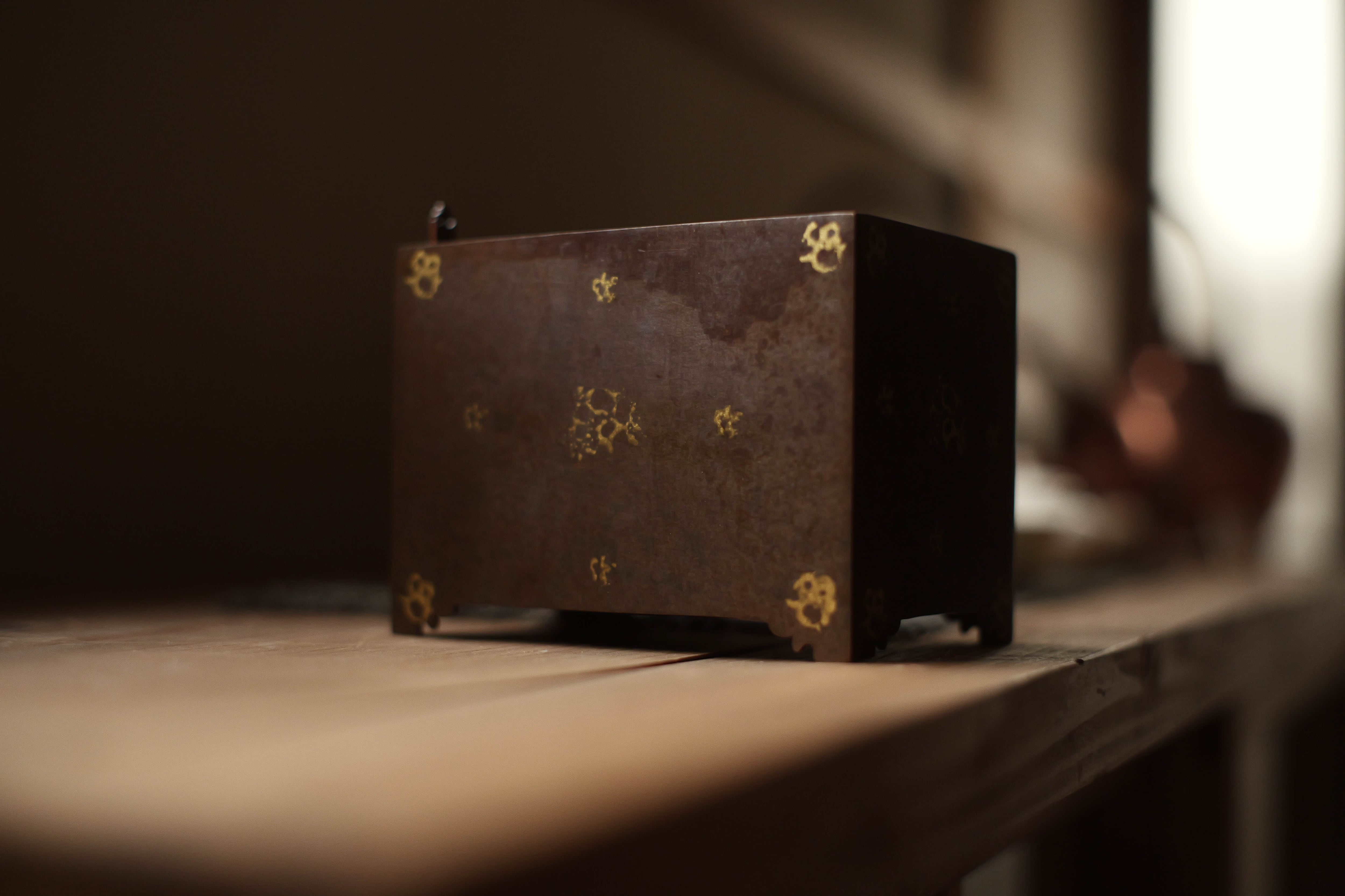 鎏金:金と水銀を混ぜたアマルガムを金属(銅・青銅など)の表面に塗布し、加熱して水銀を蒸発させ、金だけを定着させる方法。 面の色斑は「焼色」:銅を火で加熱すると、表面が酸化し、酸化銅の層が形成される。この酸化膜の厚み・状態によって色が変化する。 サイズ L12.5cm D8cm H9.5cm