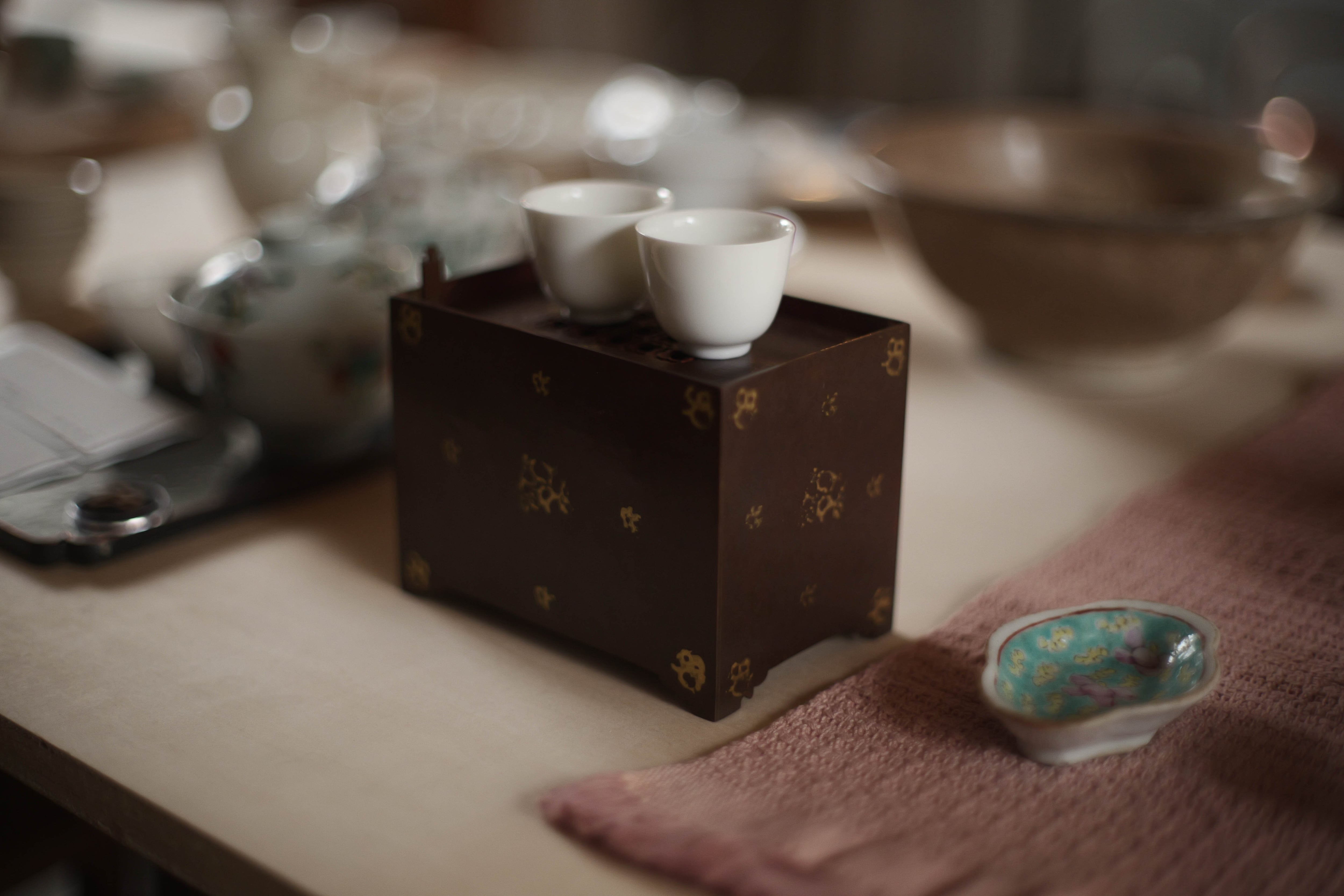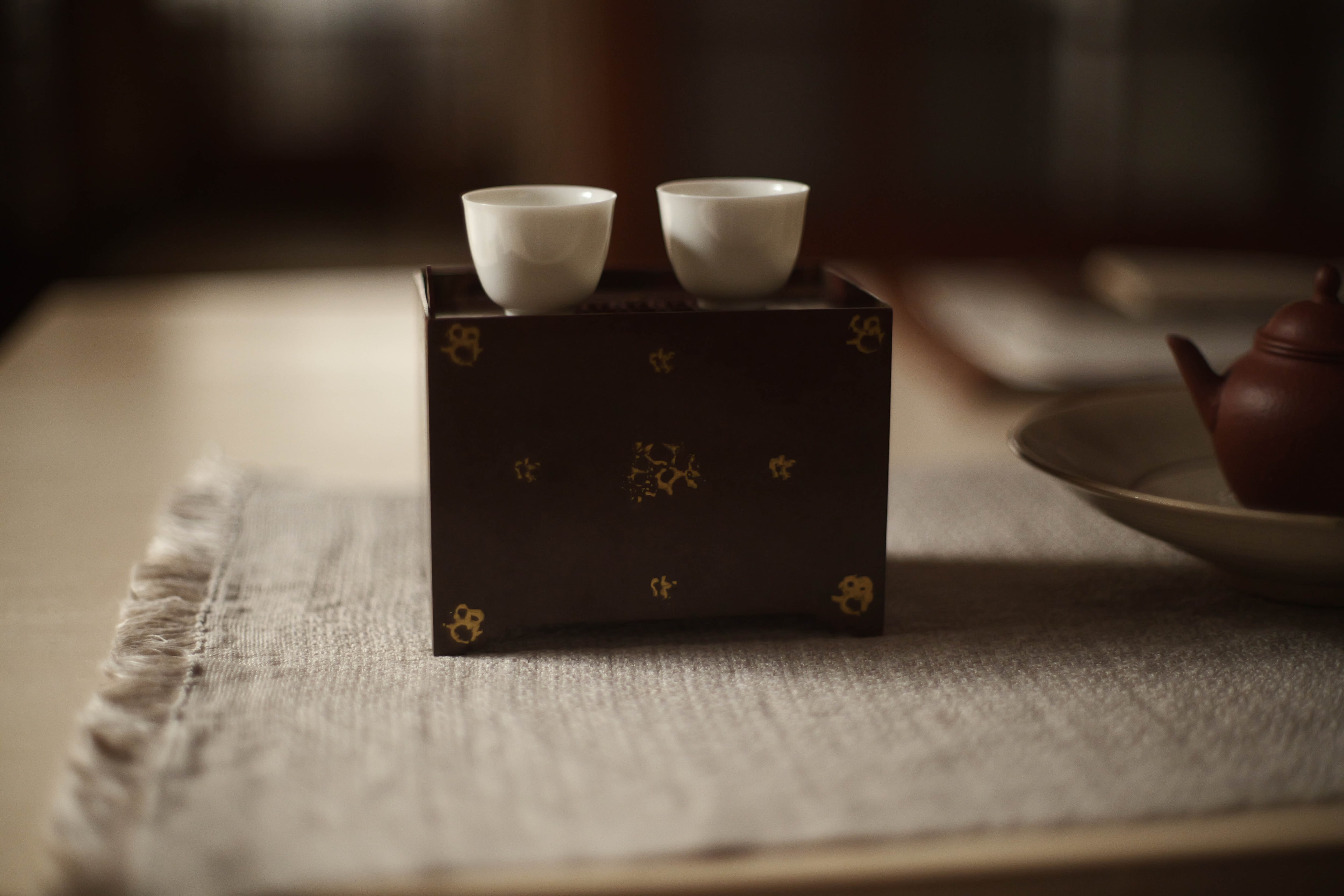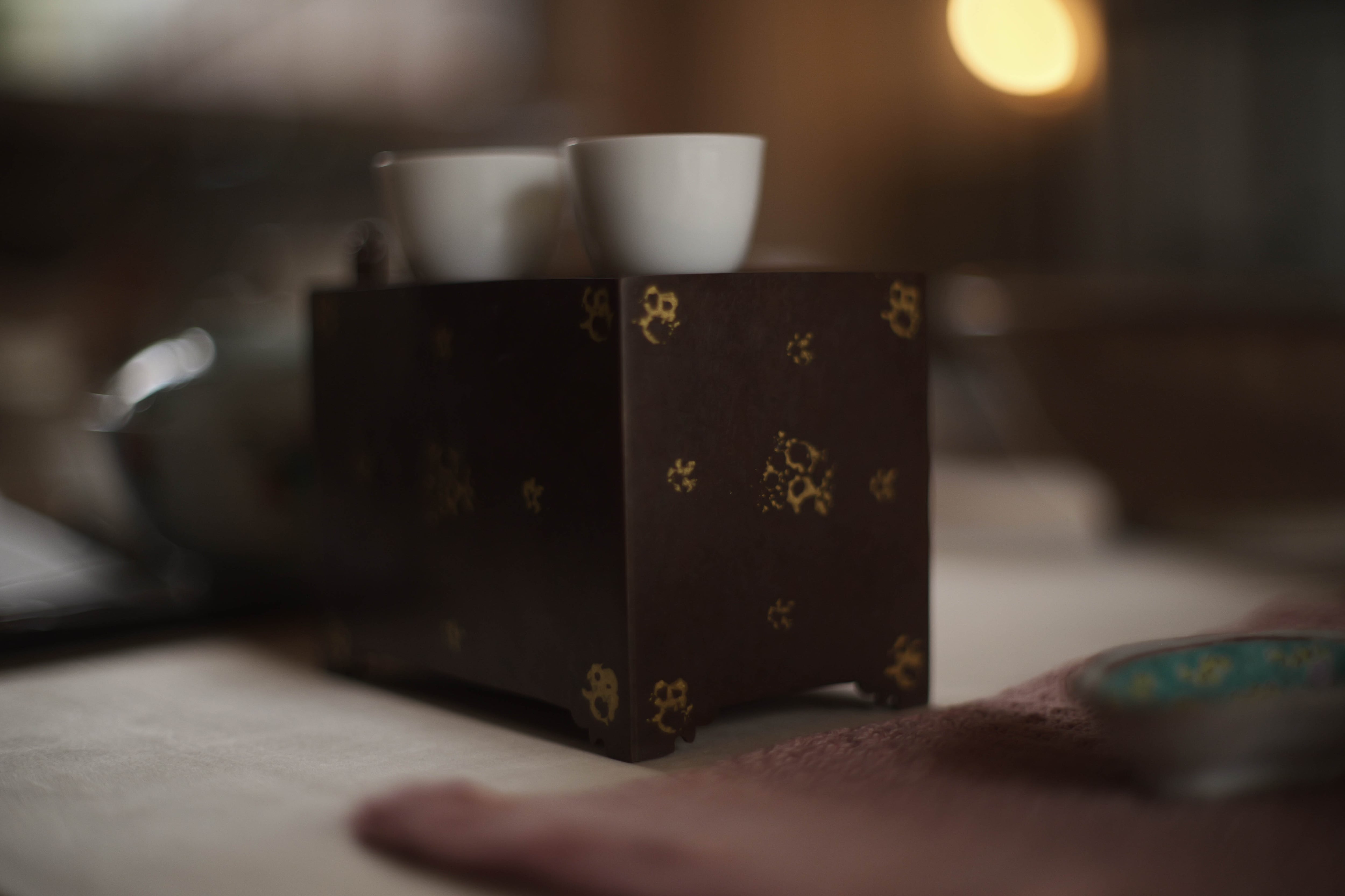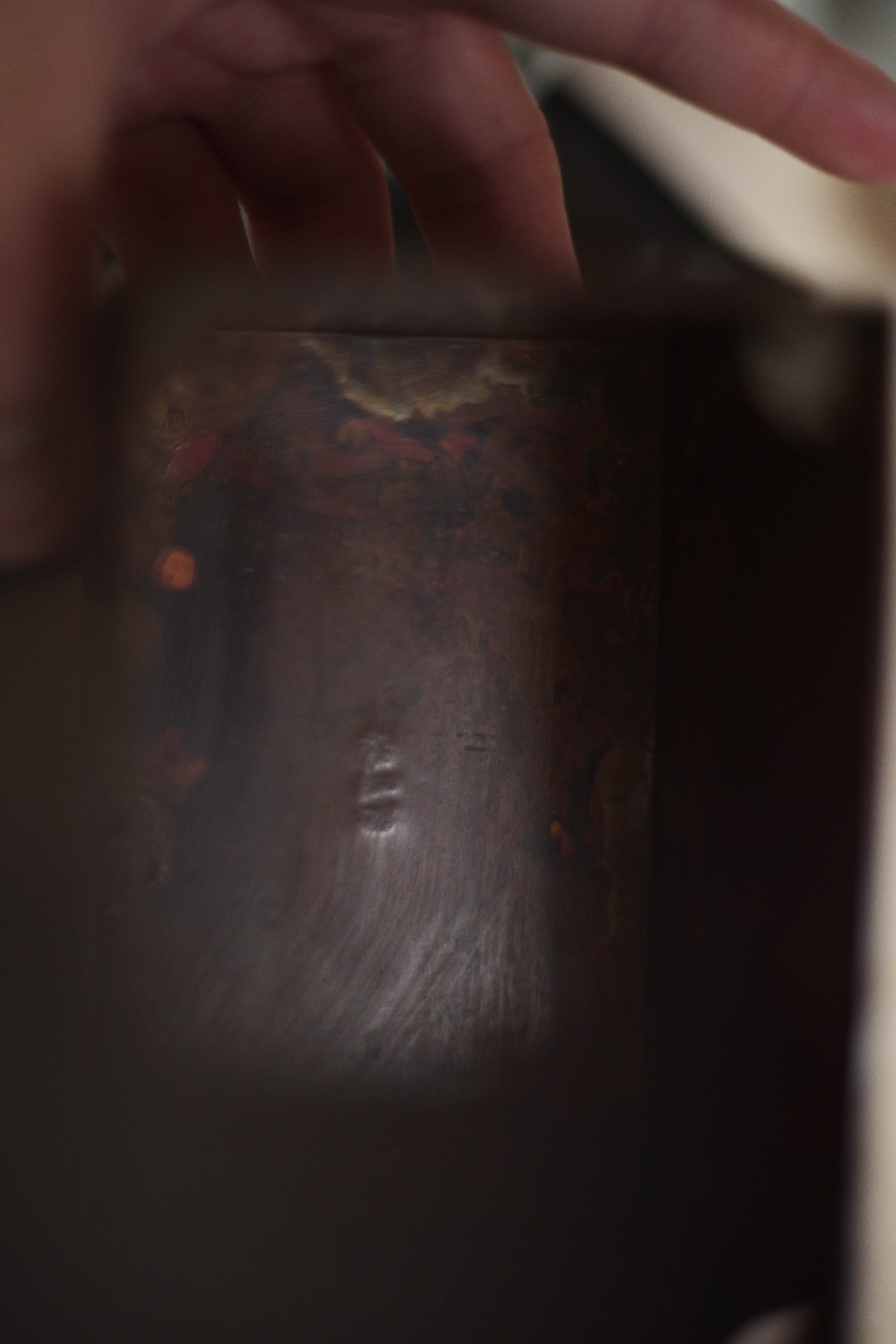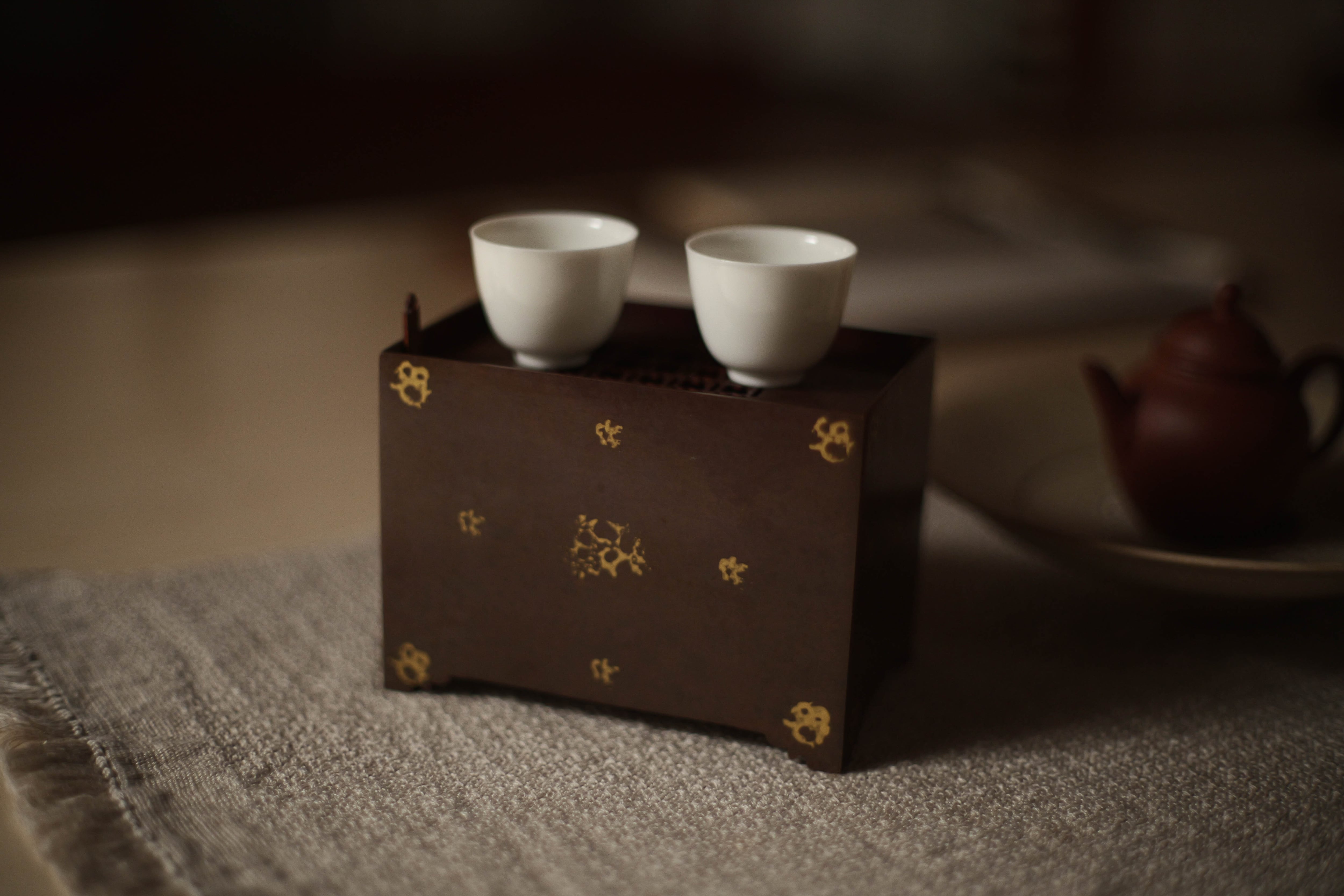 鎏金:金と水銀を混ぜたアマルガムを金属(銅・青銅など)の表面に塗布し、加熱して水銀を蒸発させ、金だけを定着させる方法。 面の色斑は「焼色」:銅を火で加熱すると、表面が酸化し、酸化銅の層が形成される。この酸化膜の厚み・状態によって色が変化する。 サイズ L12.5cm D8cm H9.5cm