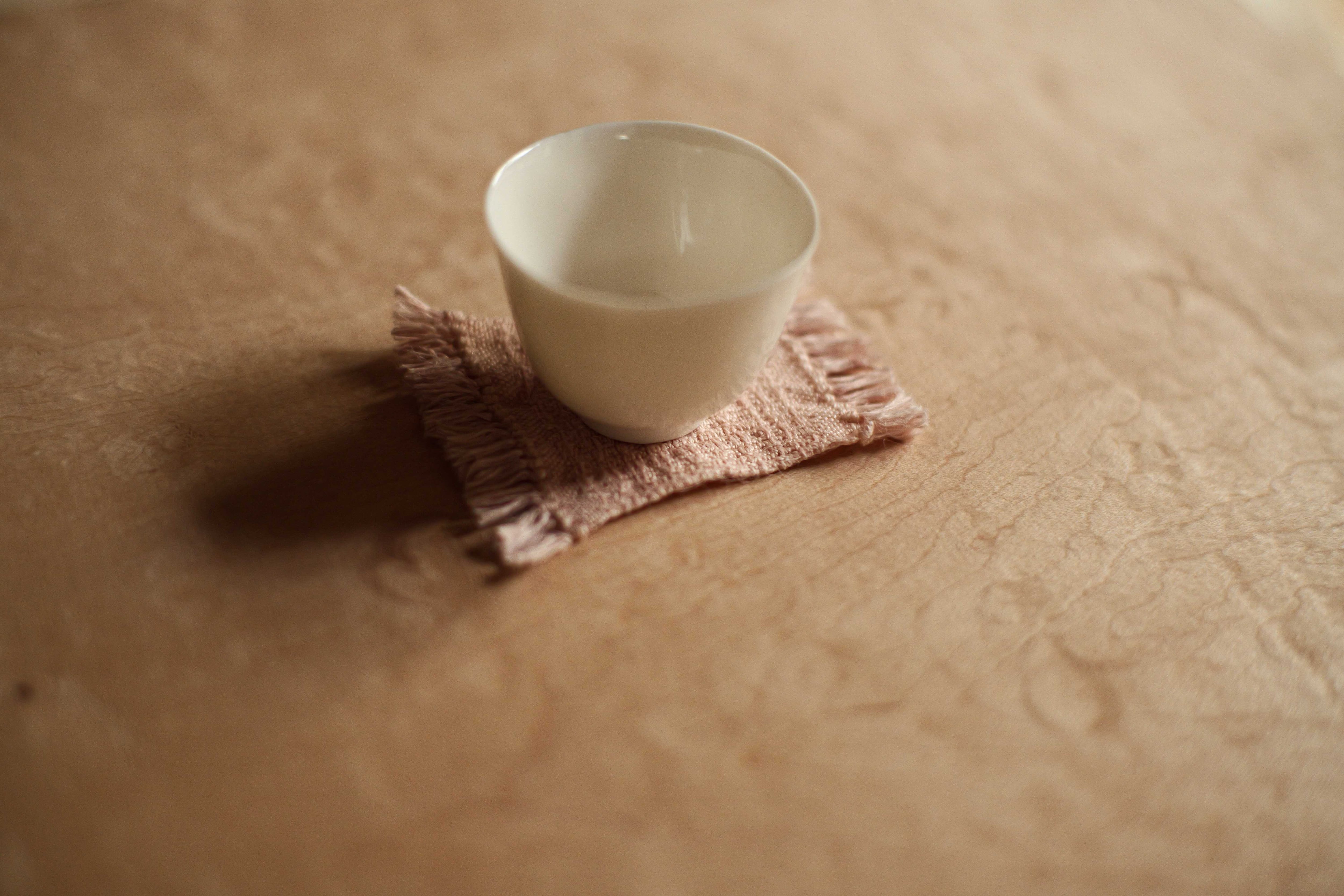 裏地を縫い合わせず、一枚の布として仕上げているので、陶のカップやグラスなど、合わせるものの質感は比較的選ばず、お使い頂く場所 ( 空間 ) にも馴染んでるように思います。