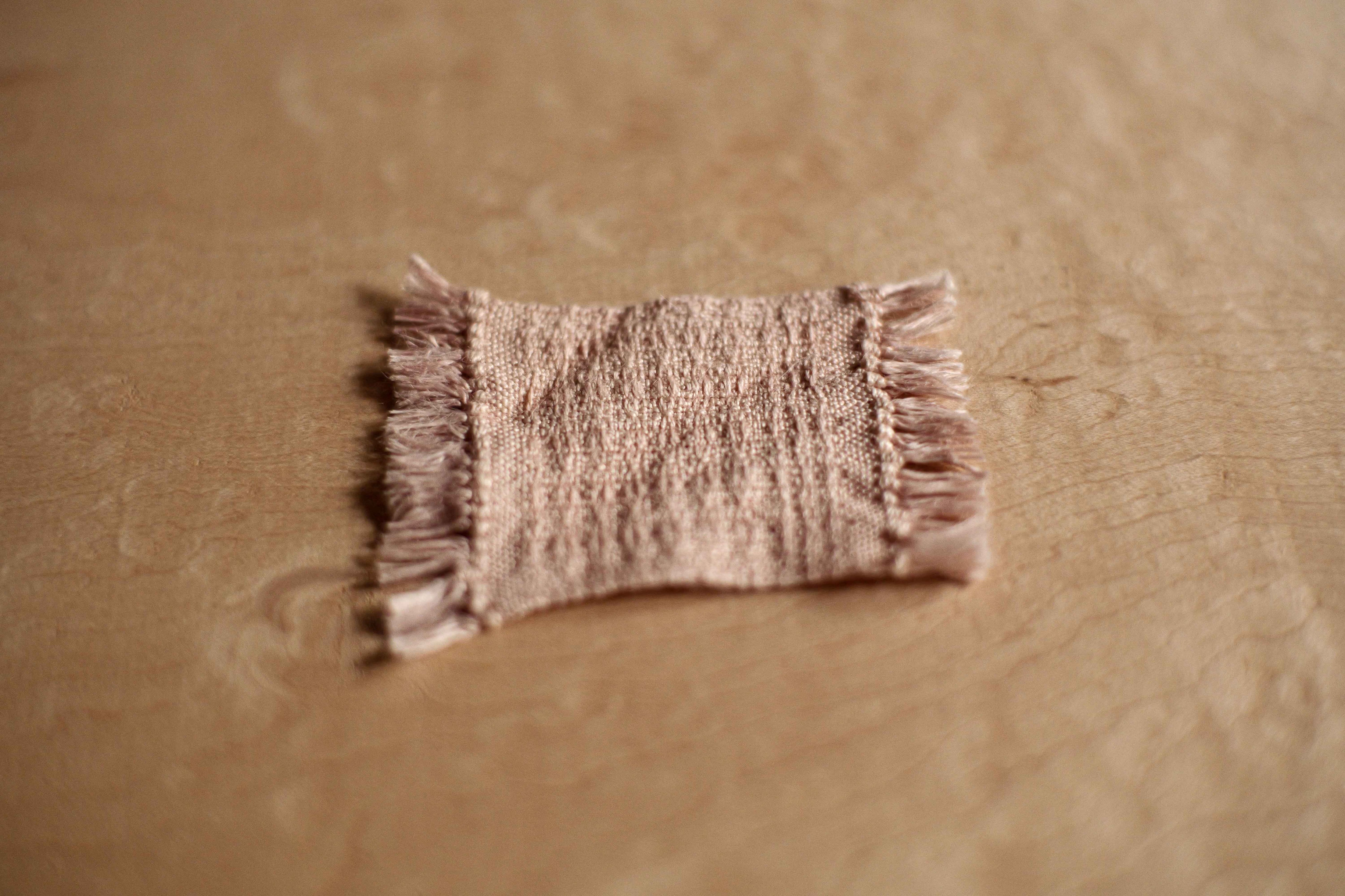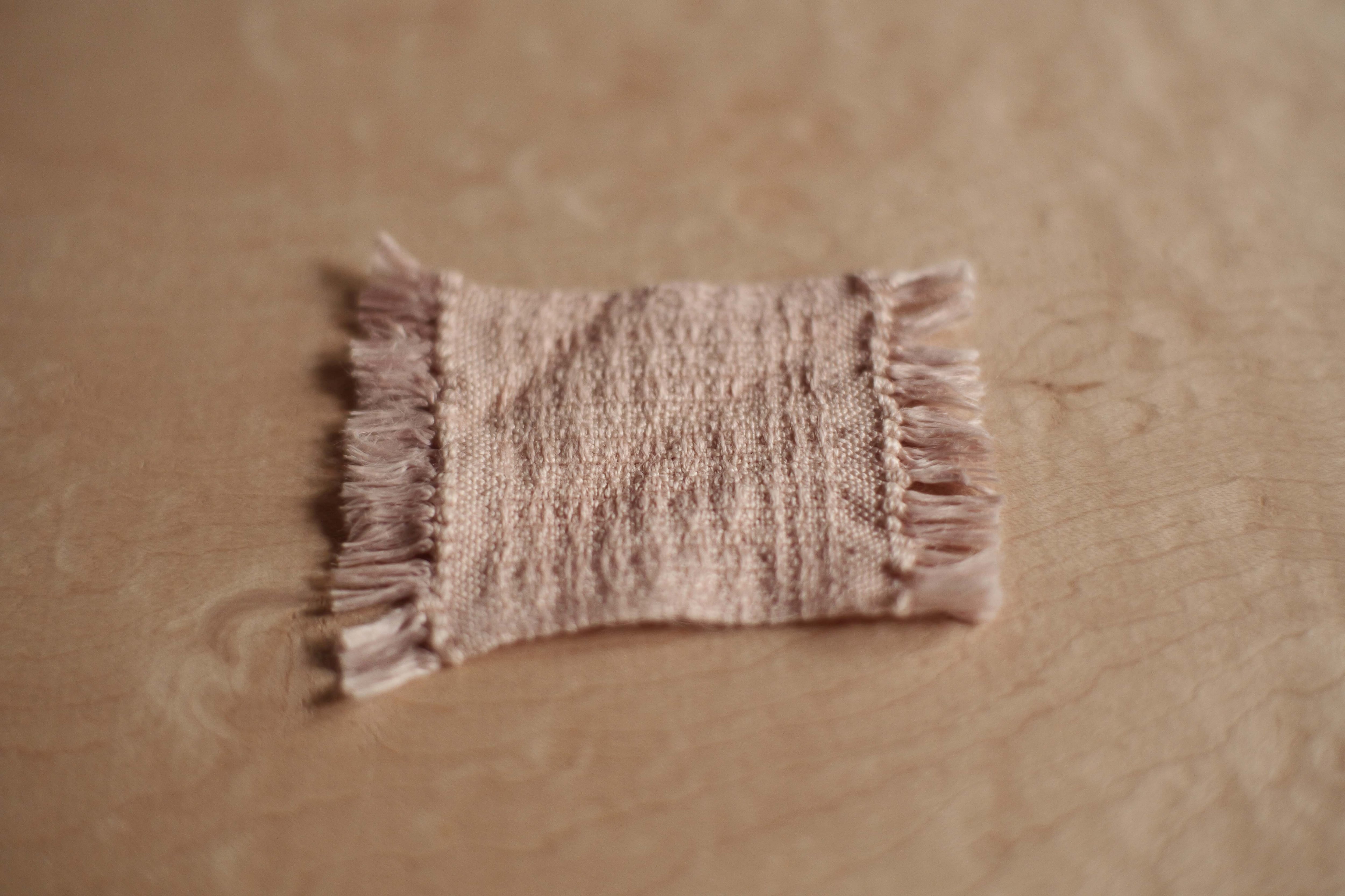 経糸、緯糸ともに、細番手のタコ糸を使用し、手機で組織織りにし、それぞれ 製品の出来上がりサイズを想定した布幅で一枚一枚織り上げた後、布端を細かく結び留め仕上げている 「 mosaic cloth piece 」