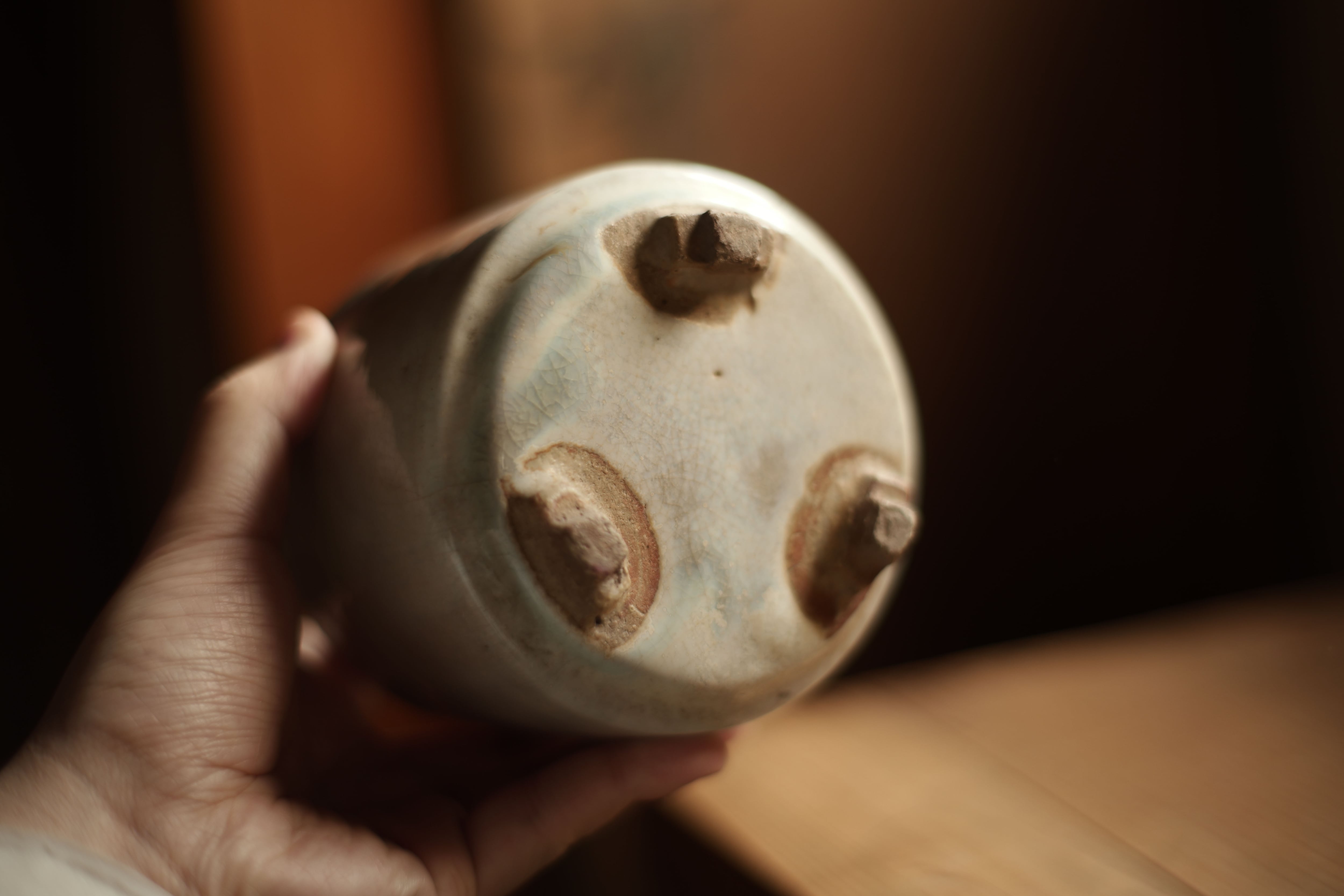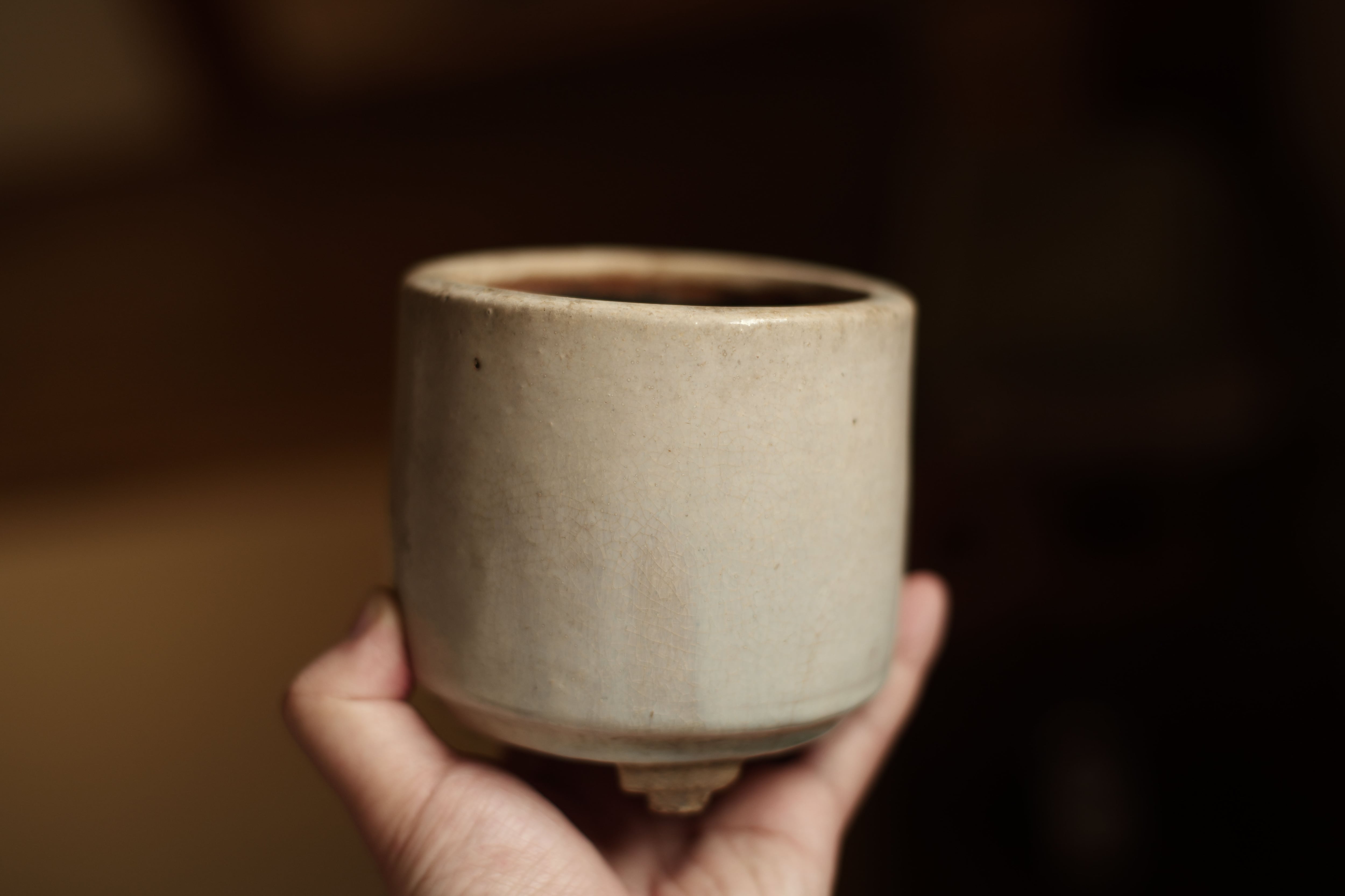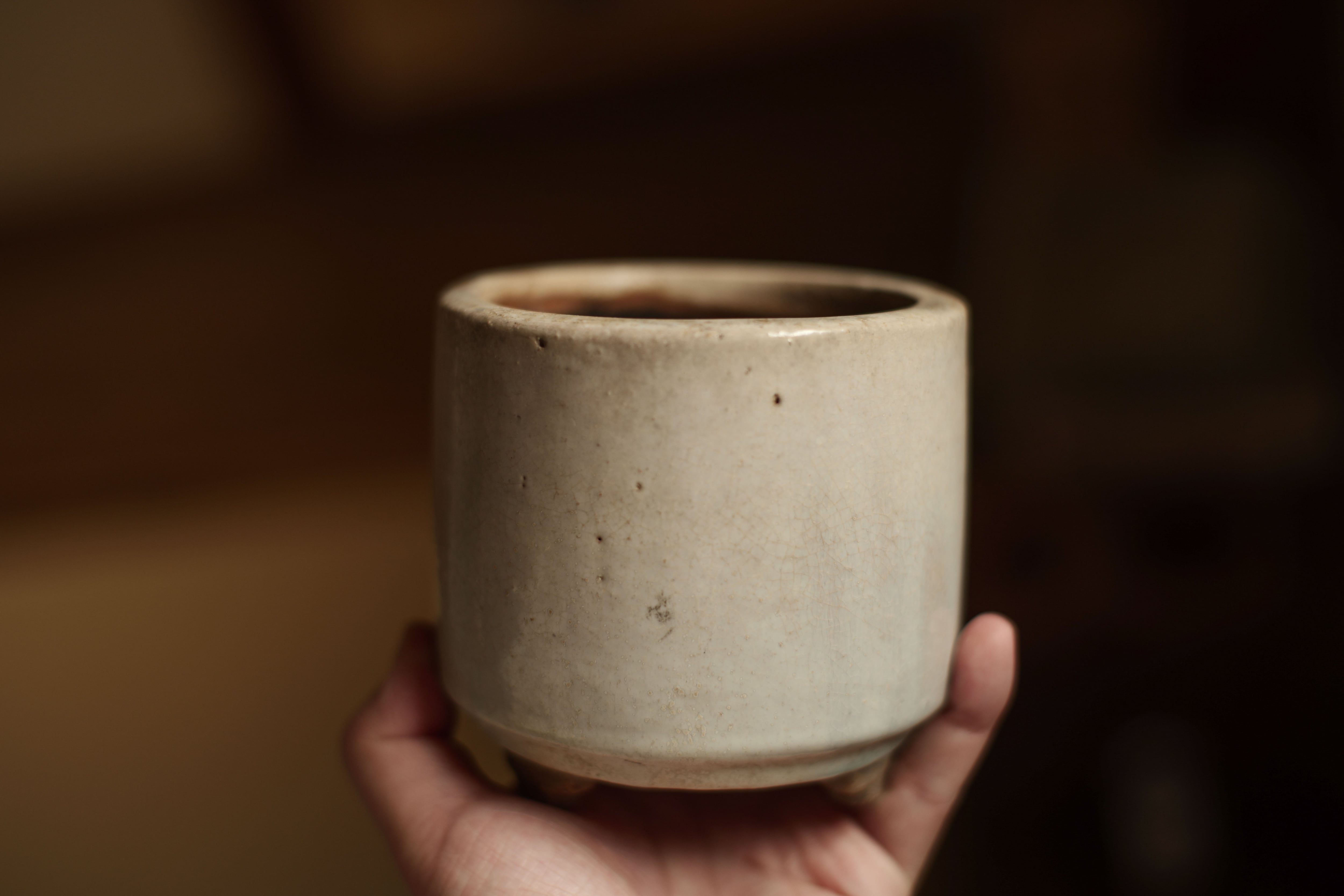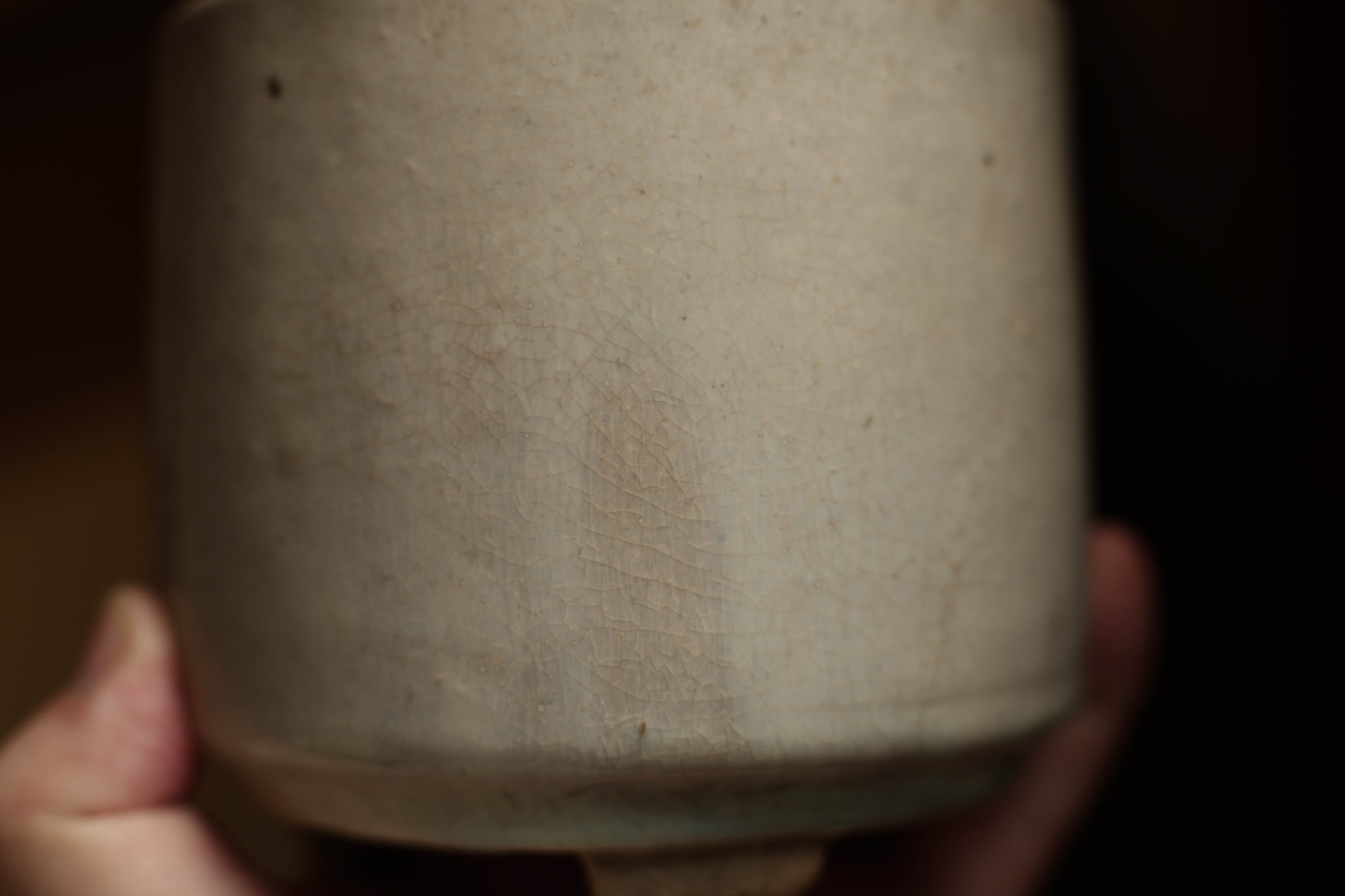 時代:約15-18世紀(明末清初) 美しい貫入と全体に端正な質感。 本来の用途以外、建水として使ってもいい雰囲気を作ってくれそう。 サイズ 高さ:約10.8cm 直径:約11.2cm
