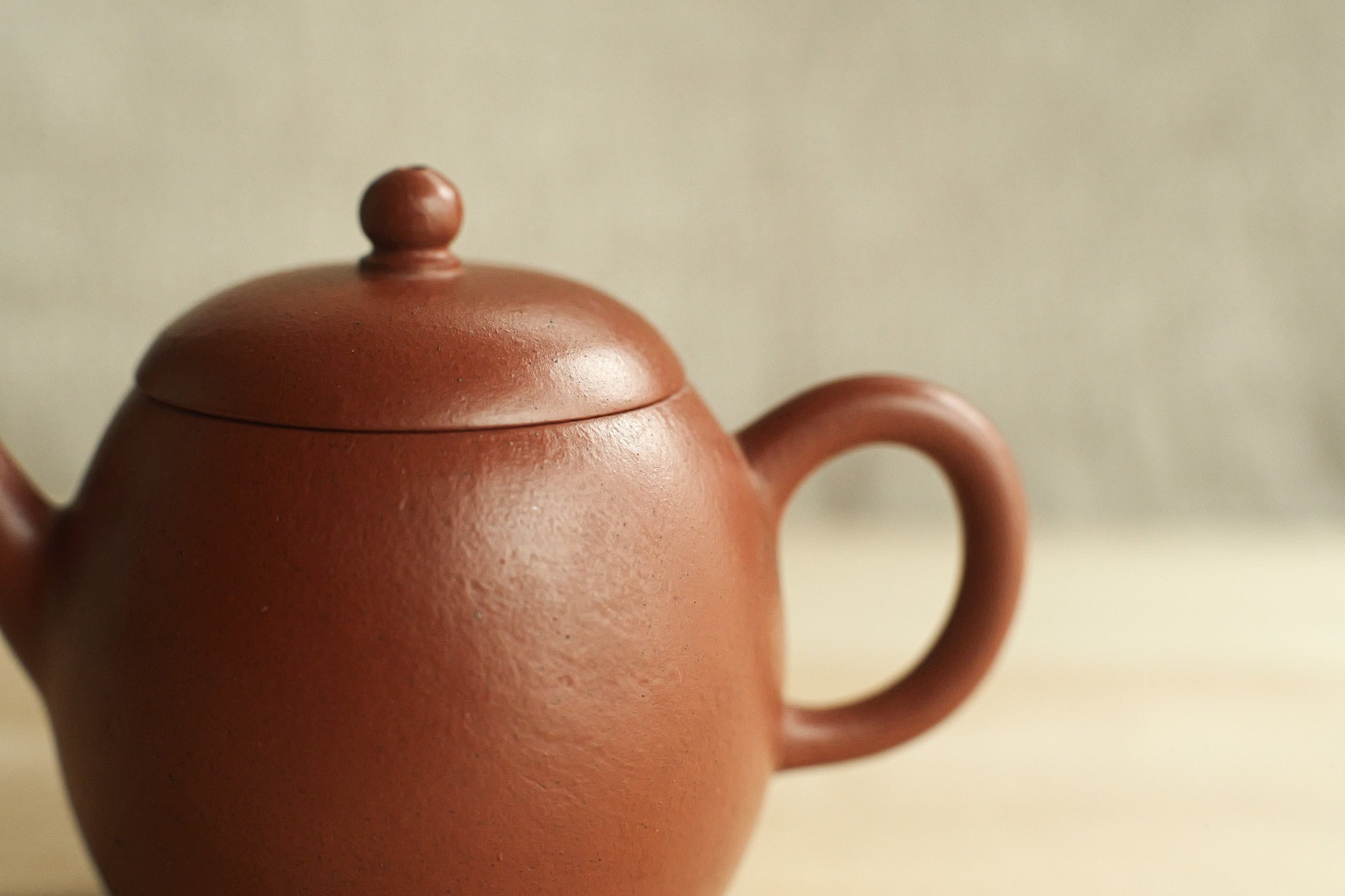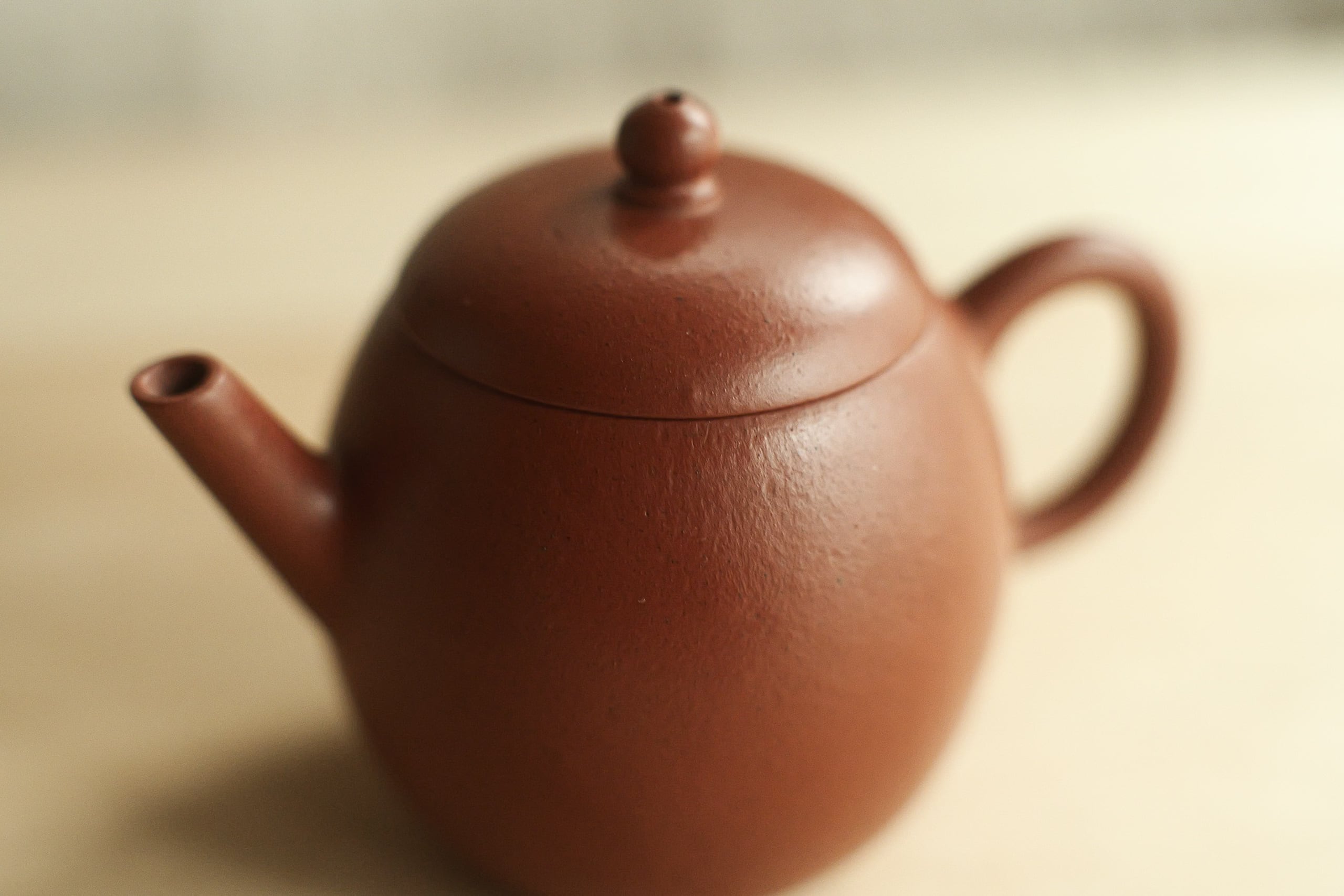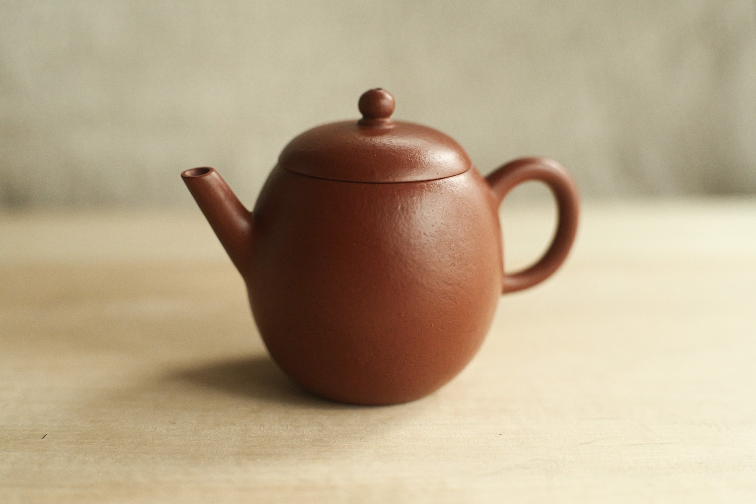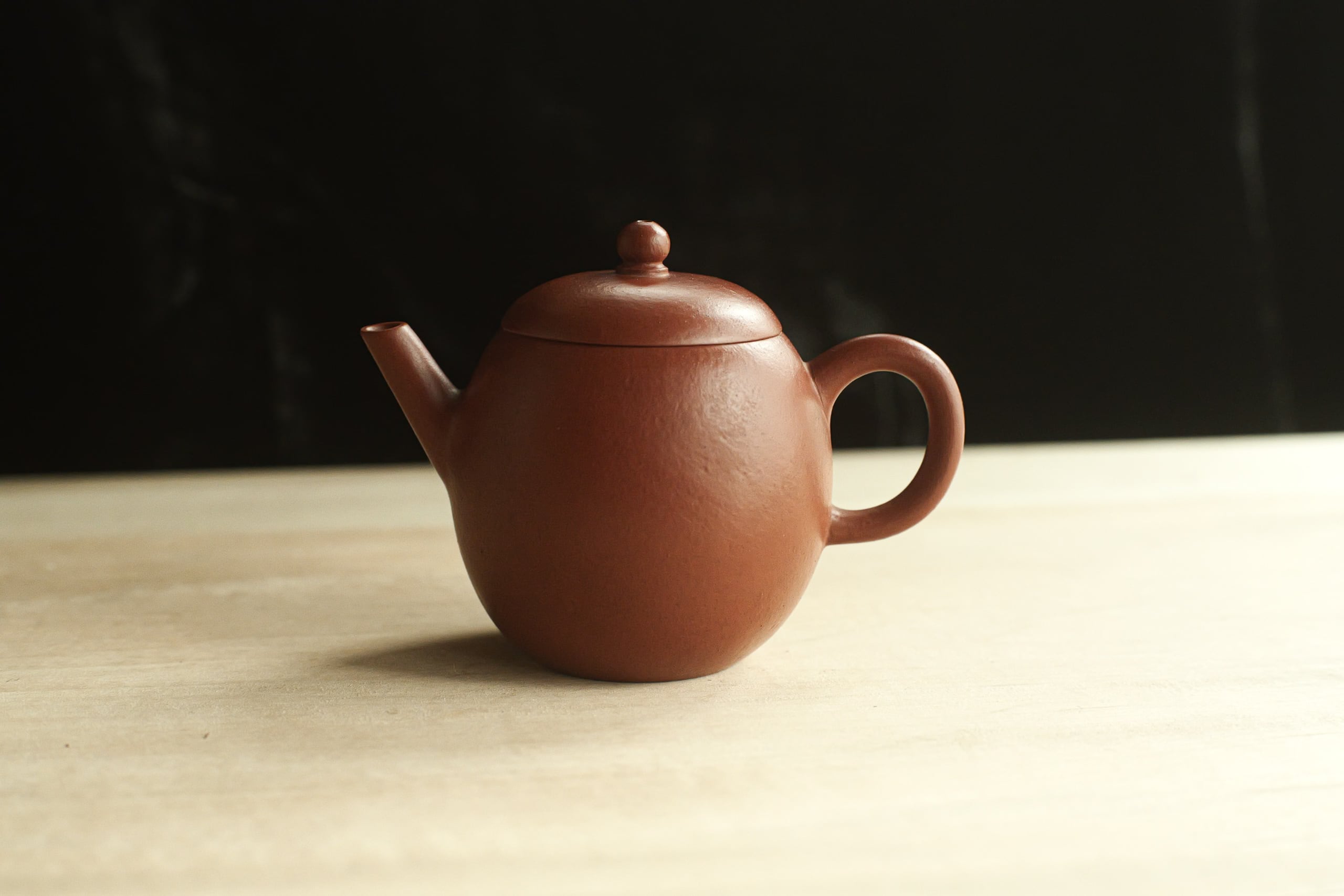 グレードの高い朱泥で作られたものと思う。 作りも古の風味をしながら繊細。 形は、やや卵に似るので、よく「龍蛋」と呼ばれそうで、 でも上がそんなに絞ってないので、 甕形にも見える。