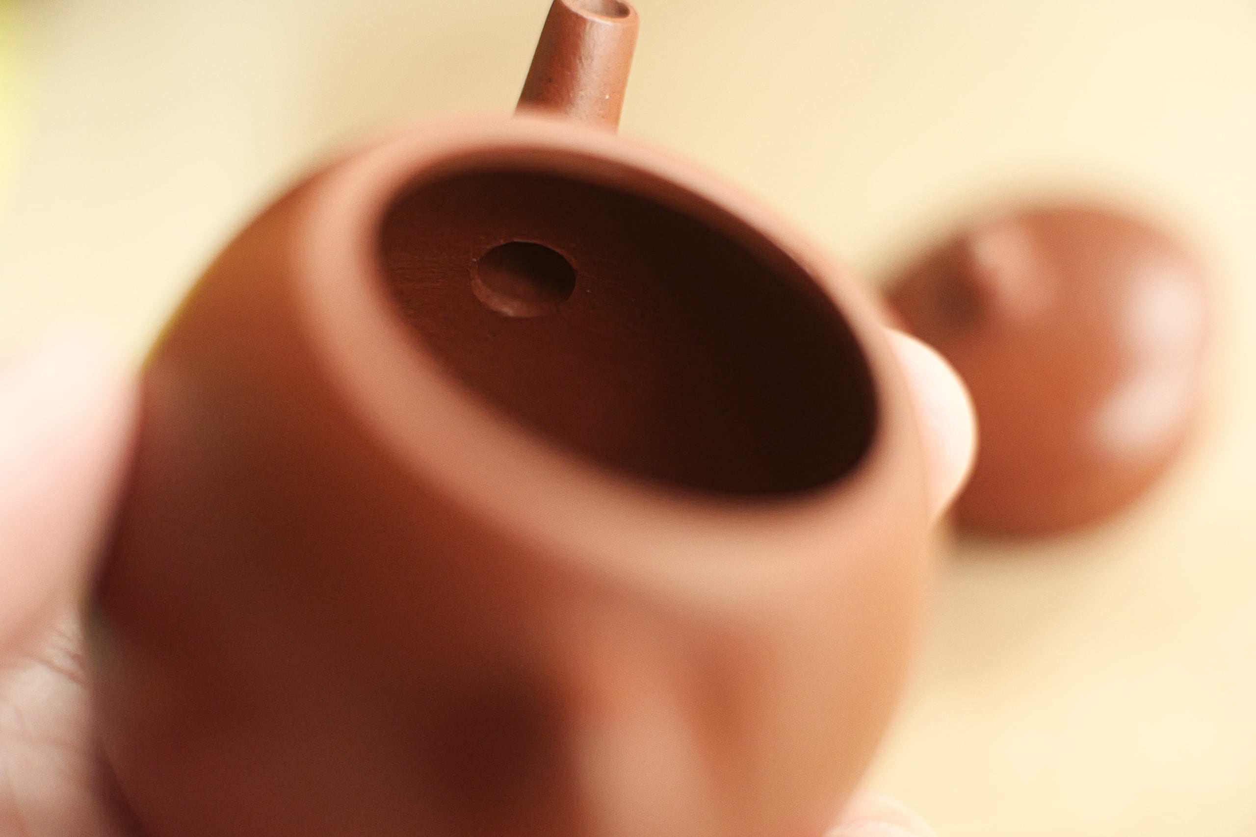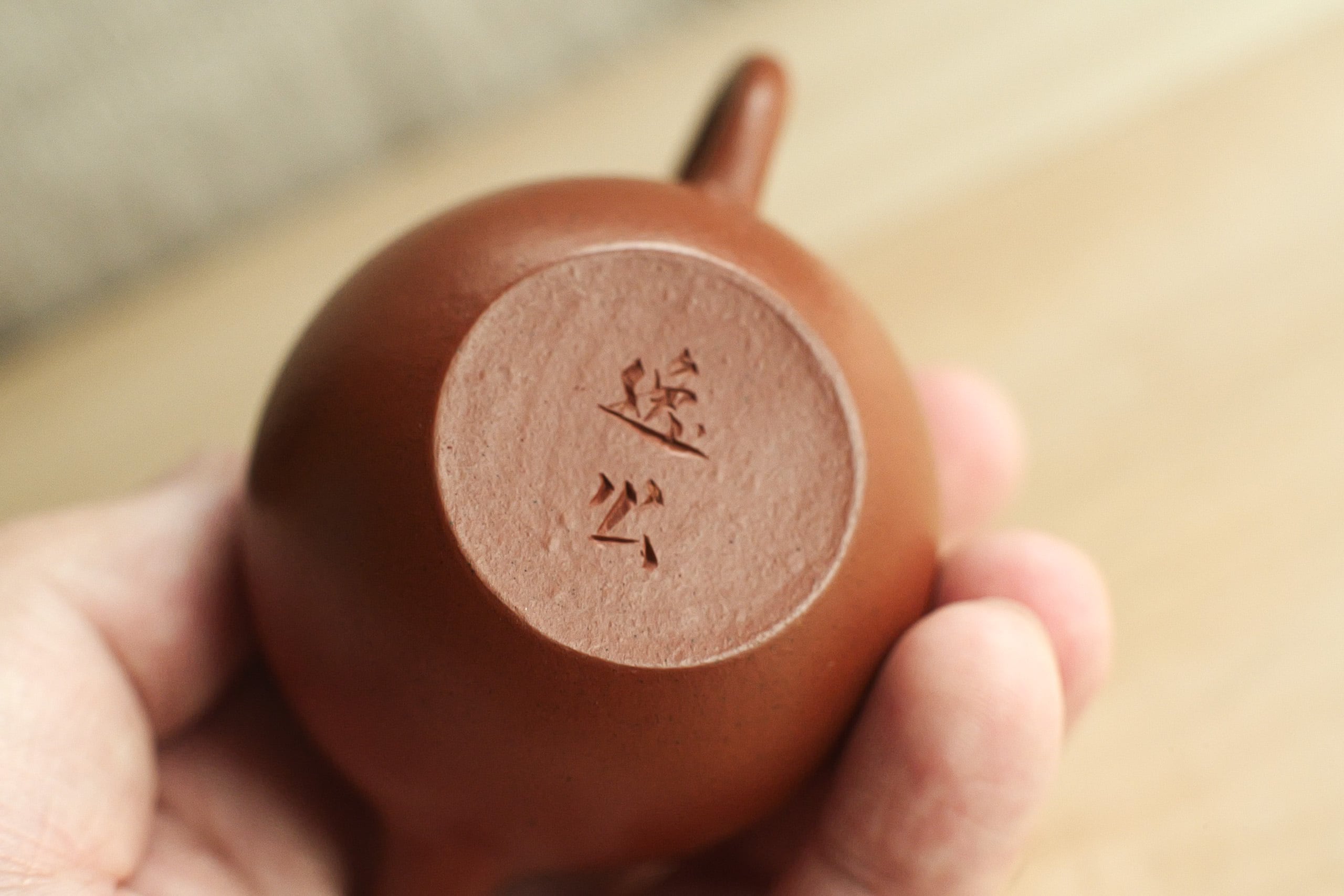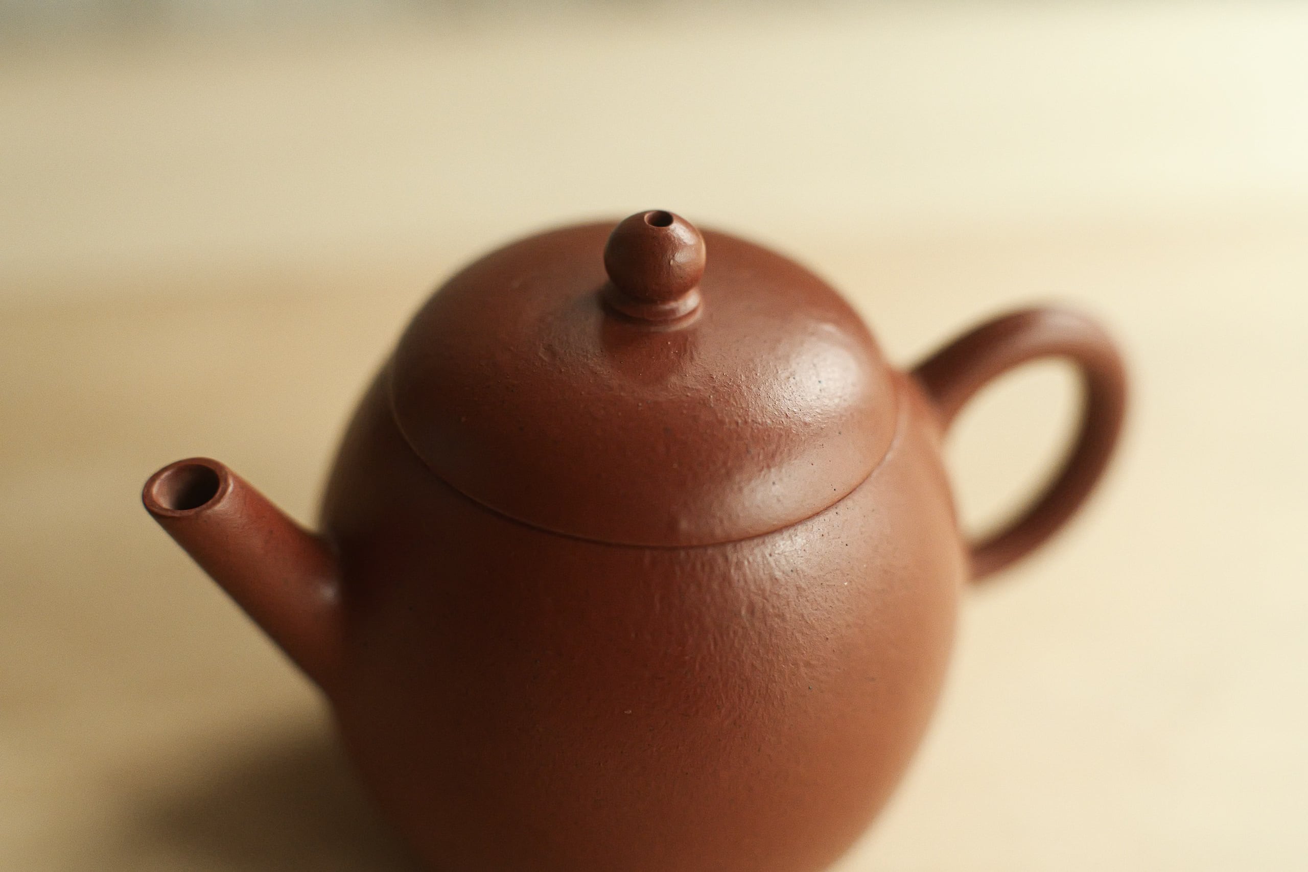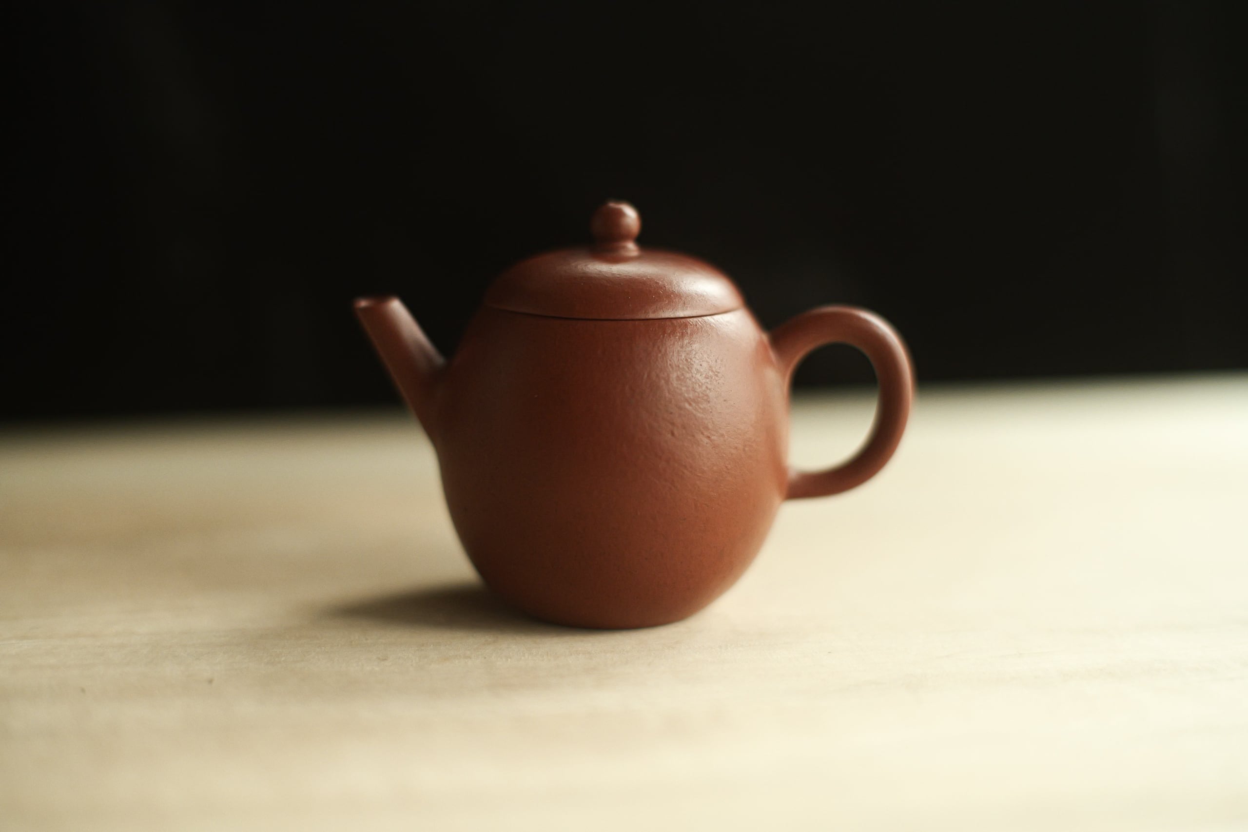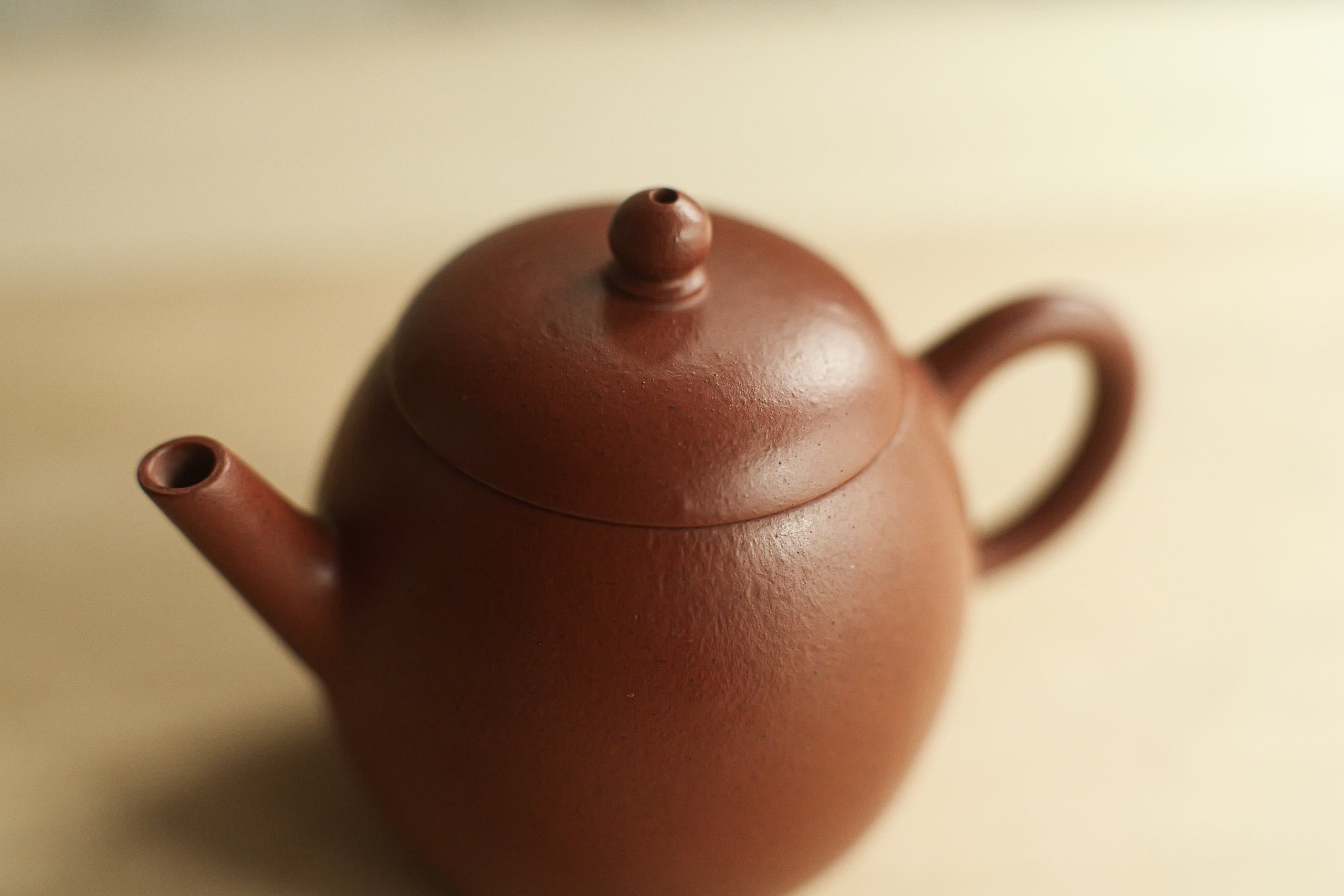 グレードの高い朱泥で作られたものと思う。 作りも古の風味をしながら繊細。 形は、やや卵に似るので、よく「龍蛋」と呼ばれそうで、 でも上がそんなに絞ってないので、 甕形にも見える。