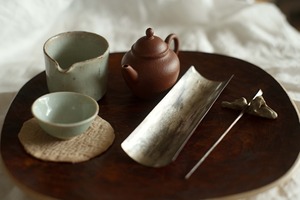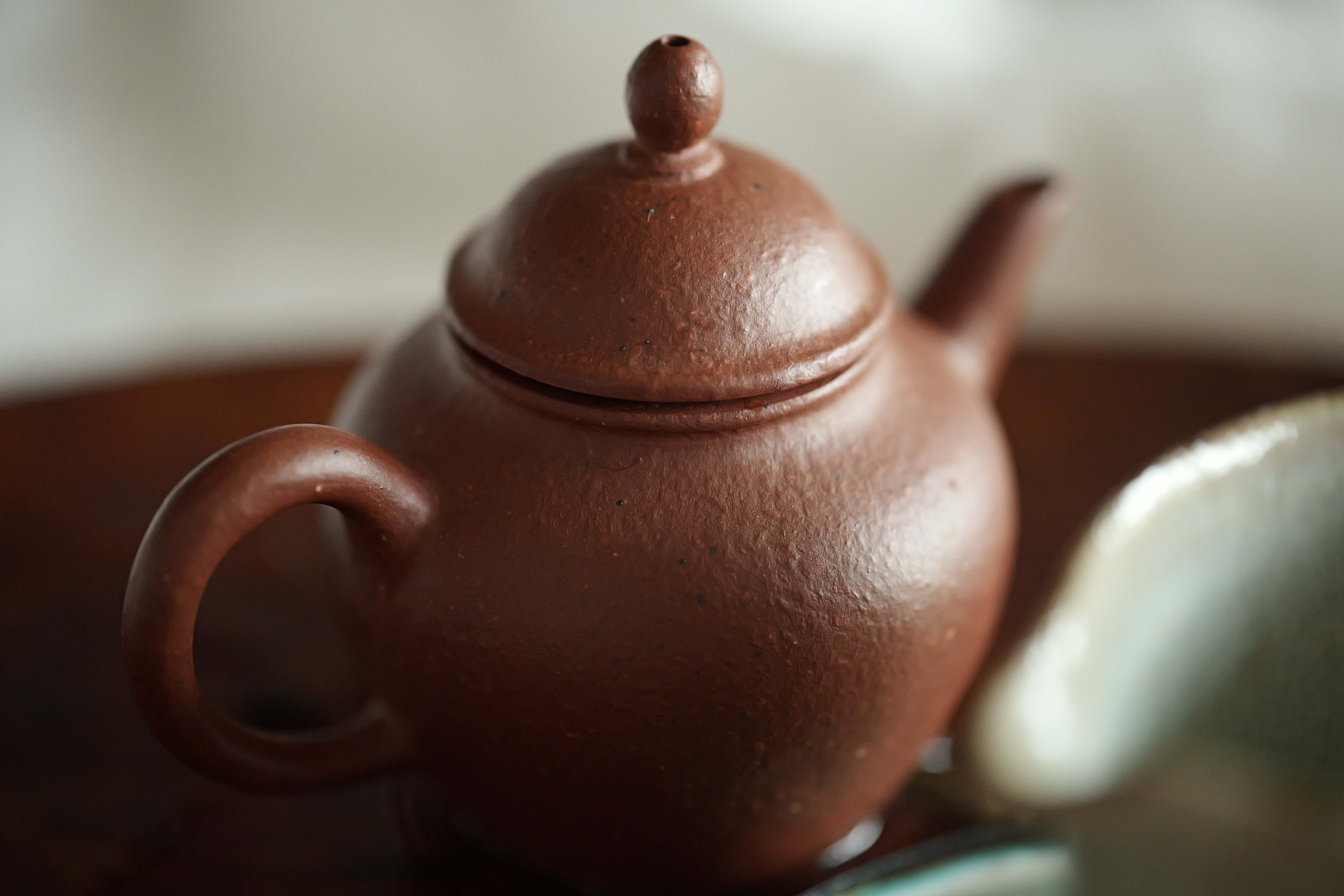 紫砂「秋水」(器形)壺(100cc位) 作家さん自身が原石を砕いて土を作ってます。 肌理は粗いながら潤いがあるところが気にいるところ。 少しお茶を淹れたら、艶が目に見えるほど増した。 育てやすくて、通気性もありそうで烏龍茶の味わいを増幅する効果も期待できる。