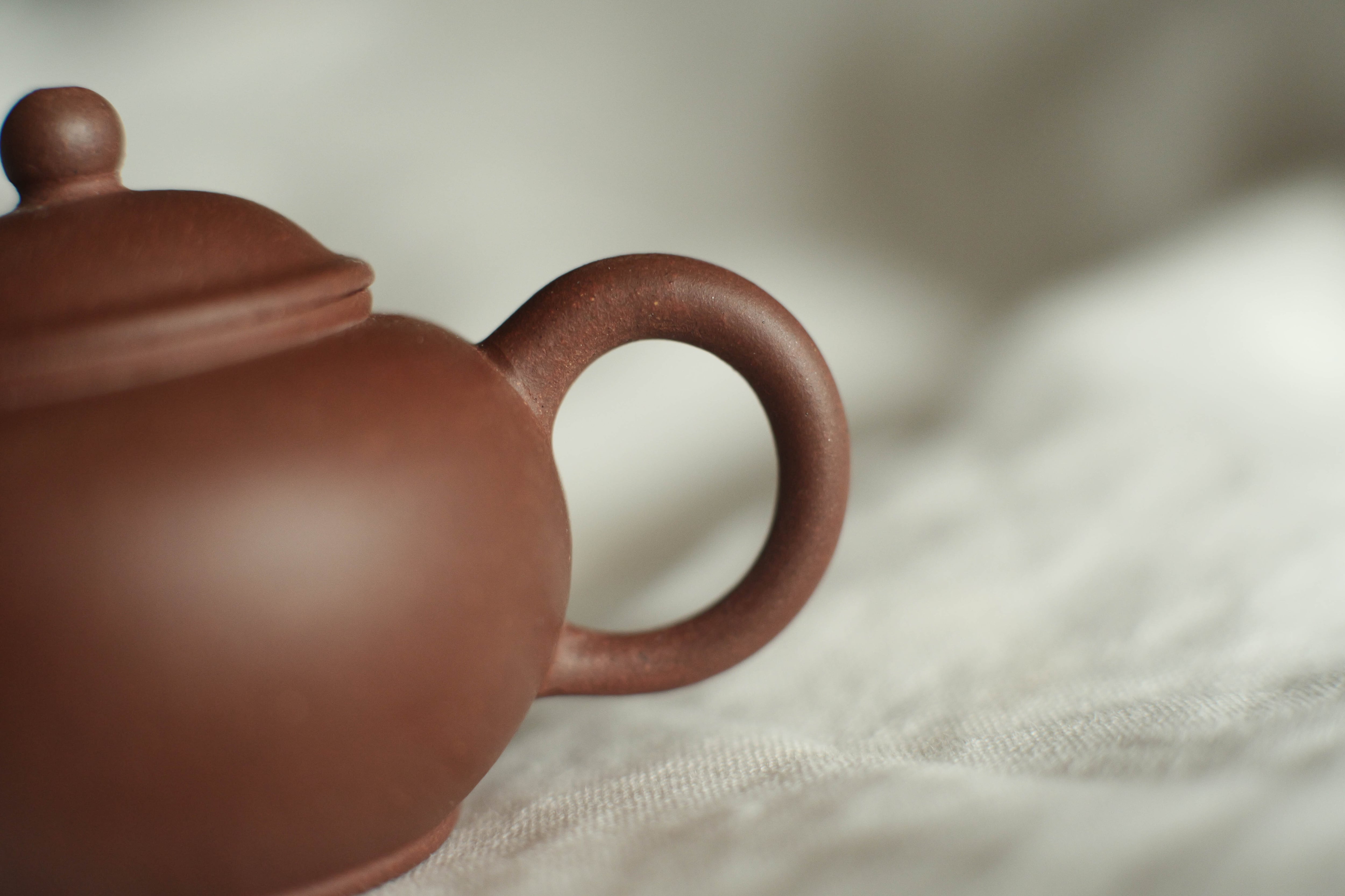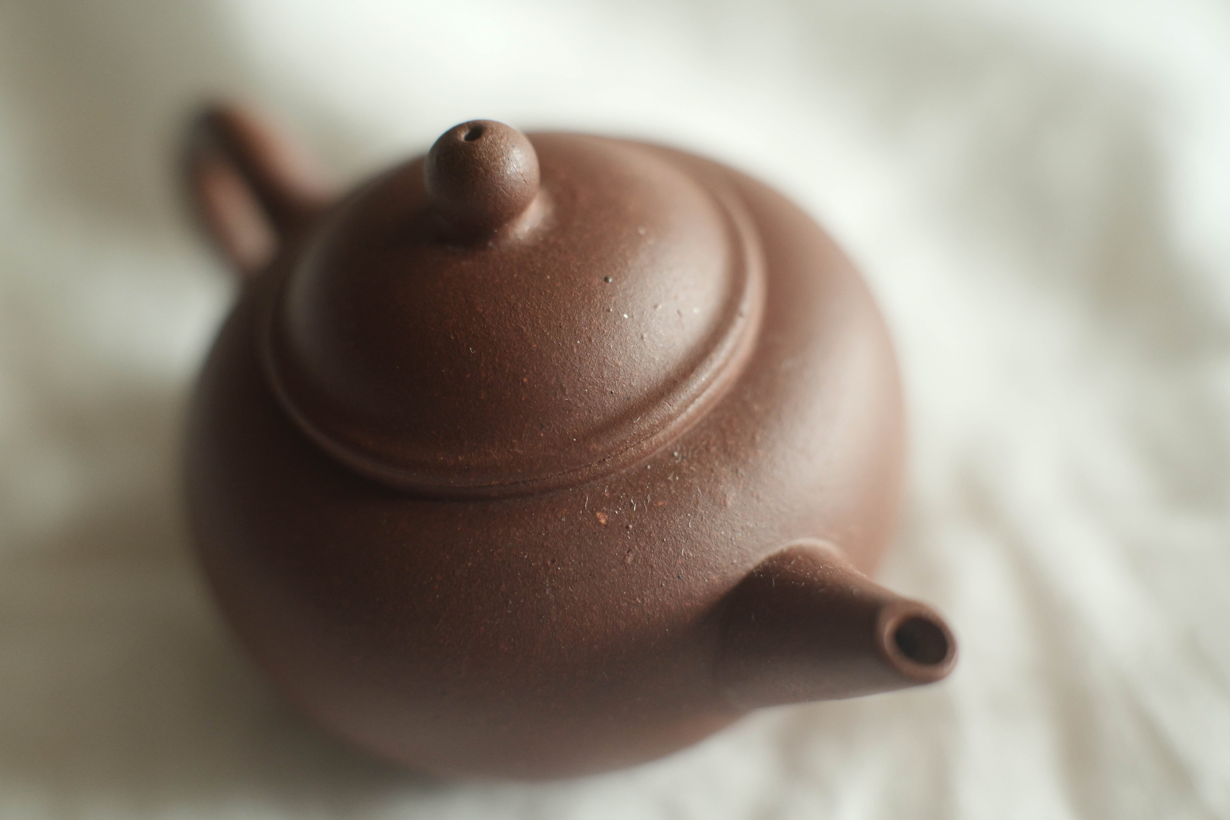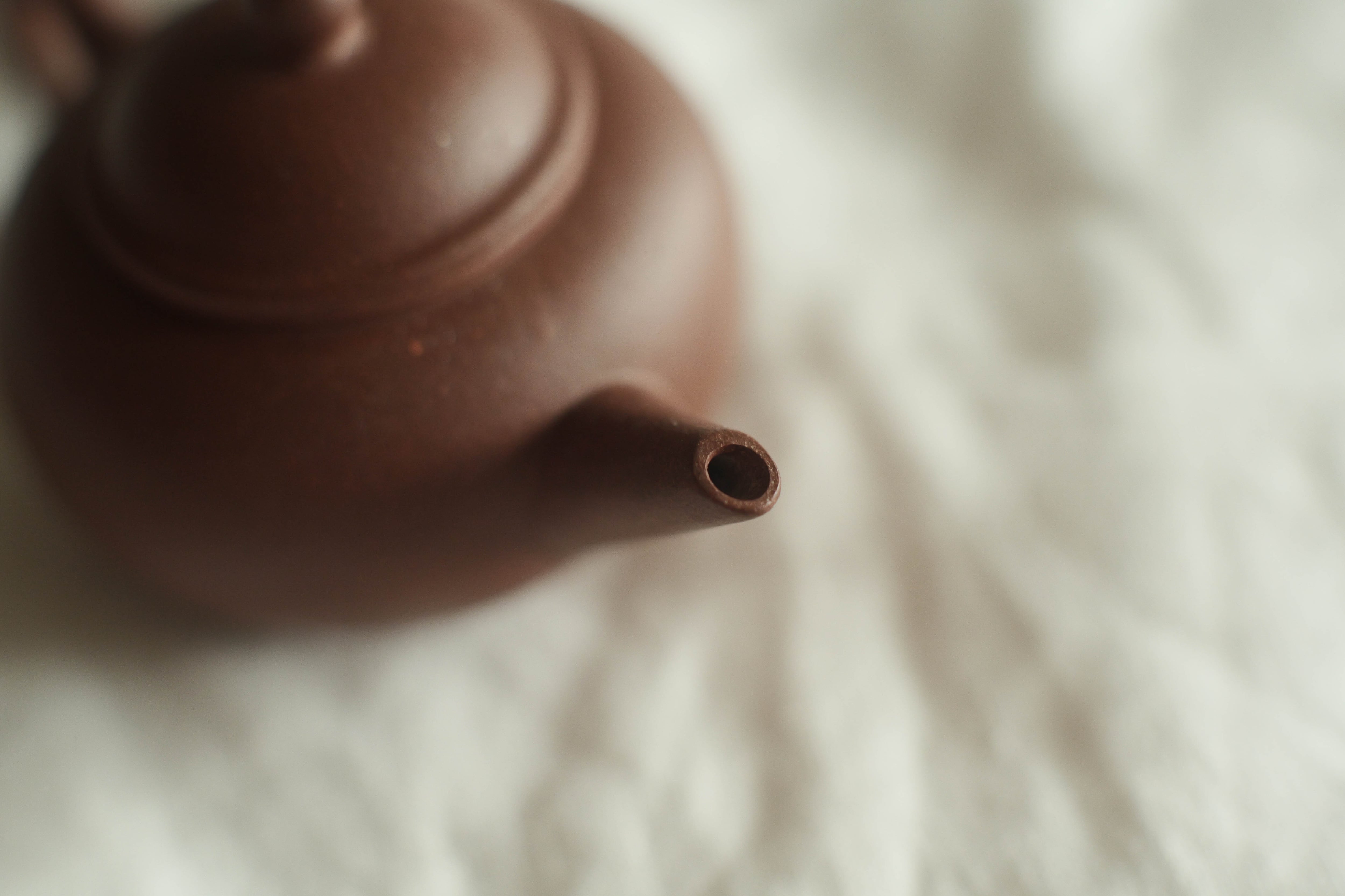 宜興紫砂一廠が70−80年代、台湾からの注文に応じて作った型の力を存分借りた方の半手作り。 マスターが決めた型のおかげで、水切れ、水流の綺麗さなどの性能が言うことなし 一廠のこのグレードの水平壺は、時期によって口、取手の形がずいぶん変わるが、 このロットの注ぎ口の程よい曲線は店主が気になる。 取手がスレンダーすぎずに、赤ちゃんっぽさもない。中庸に賢く見える。 表面に現れる溶ける鉄点もポイント。