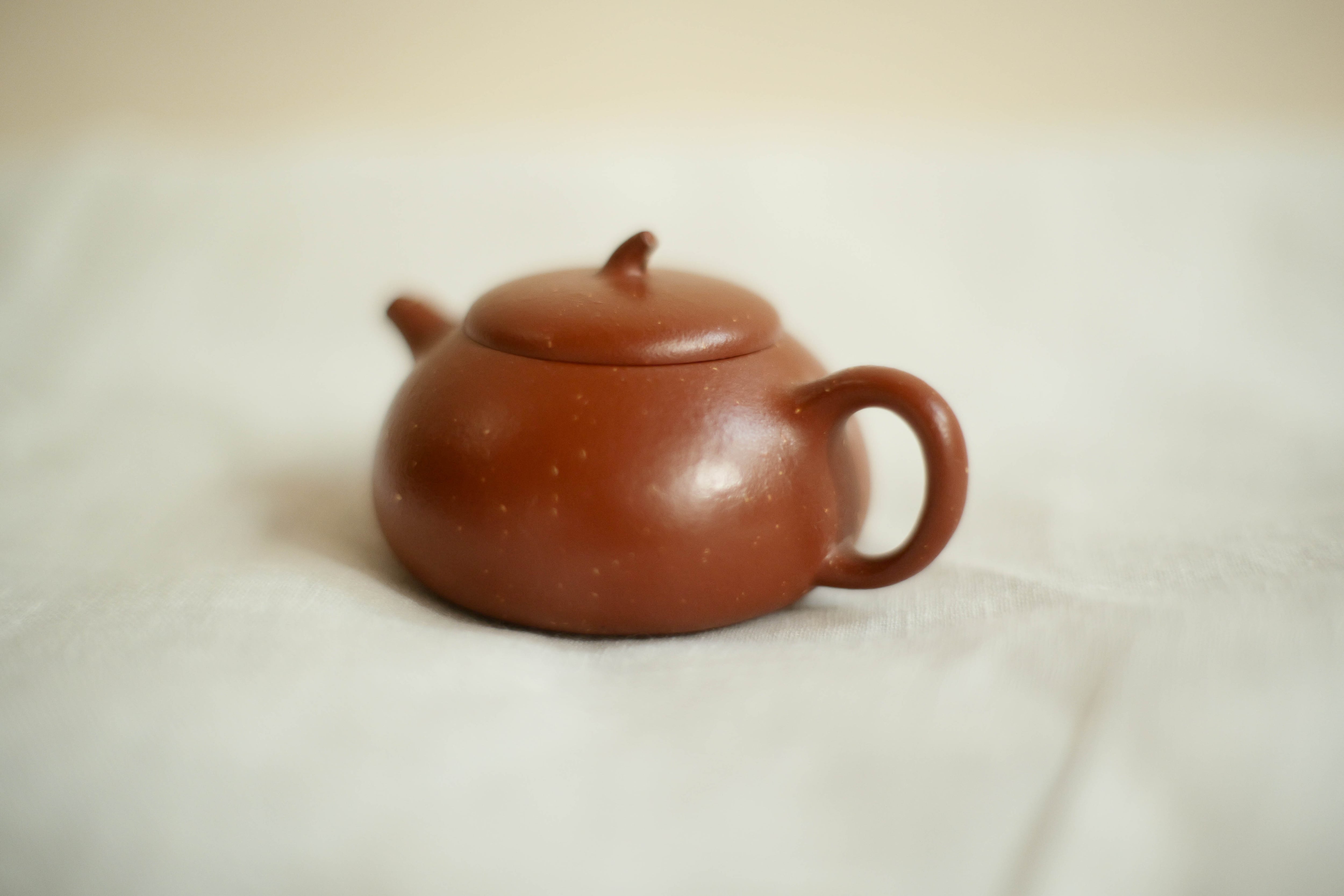 細かめに砕いた朱泥と 粗く砕いた段泥をブレンドした「調砂朱泥」。 宜興紫砂の歴史と同じ古い土の調和技術の一つで、 装飾料紙における金散らしと同じように、 夜空に輝く満天の星のような可愛らしさを現せる。 茄子に象るのは、宜興紫砂では古来あるカテゴリーで、 こちらは太(胖)った茄子みたいということから、 「胖茄」の器形を頂いた。
