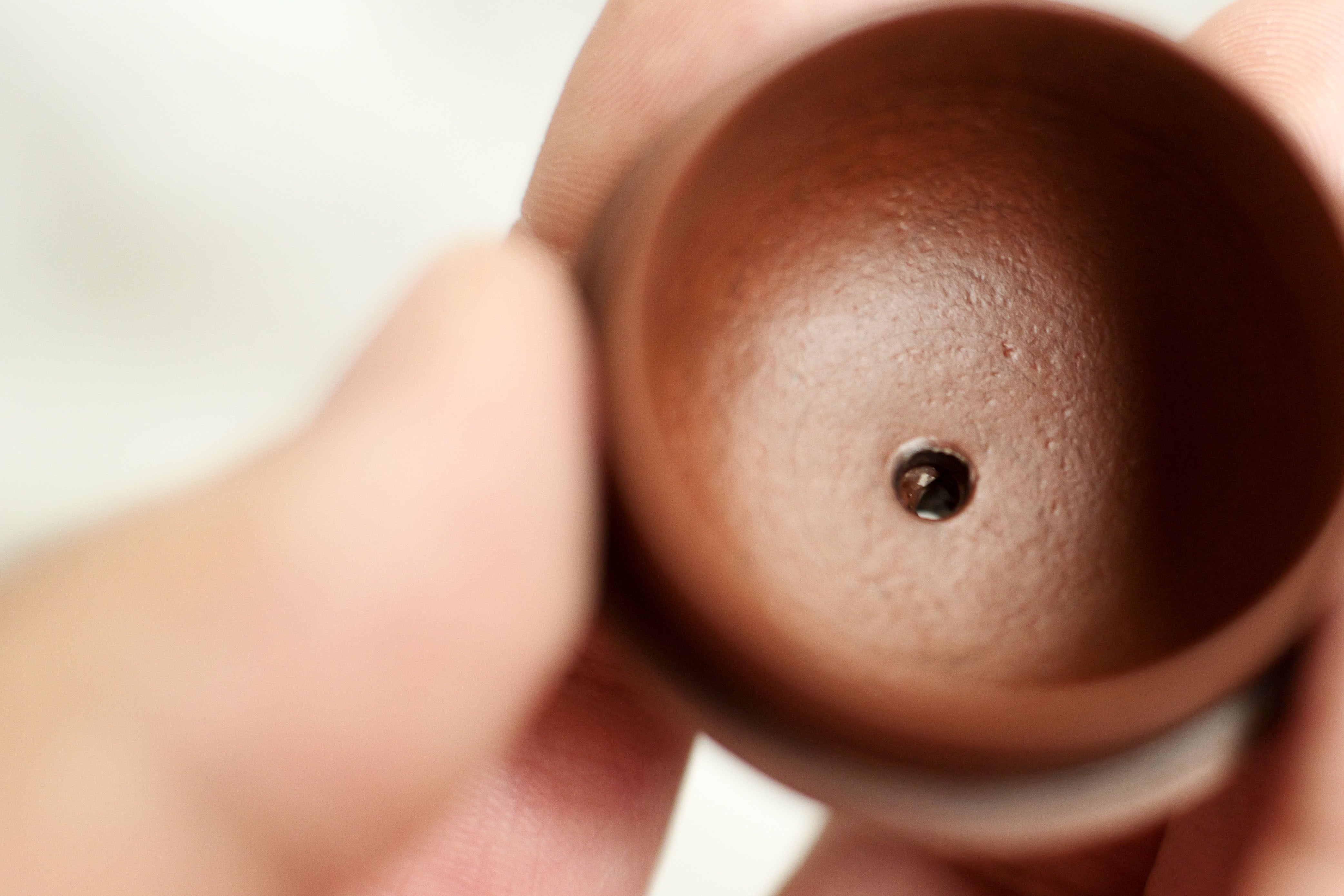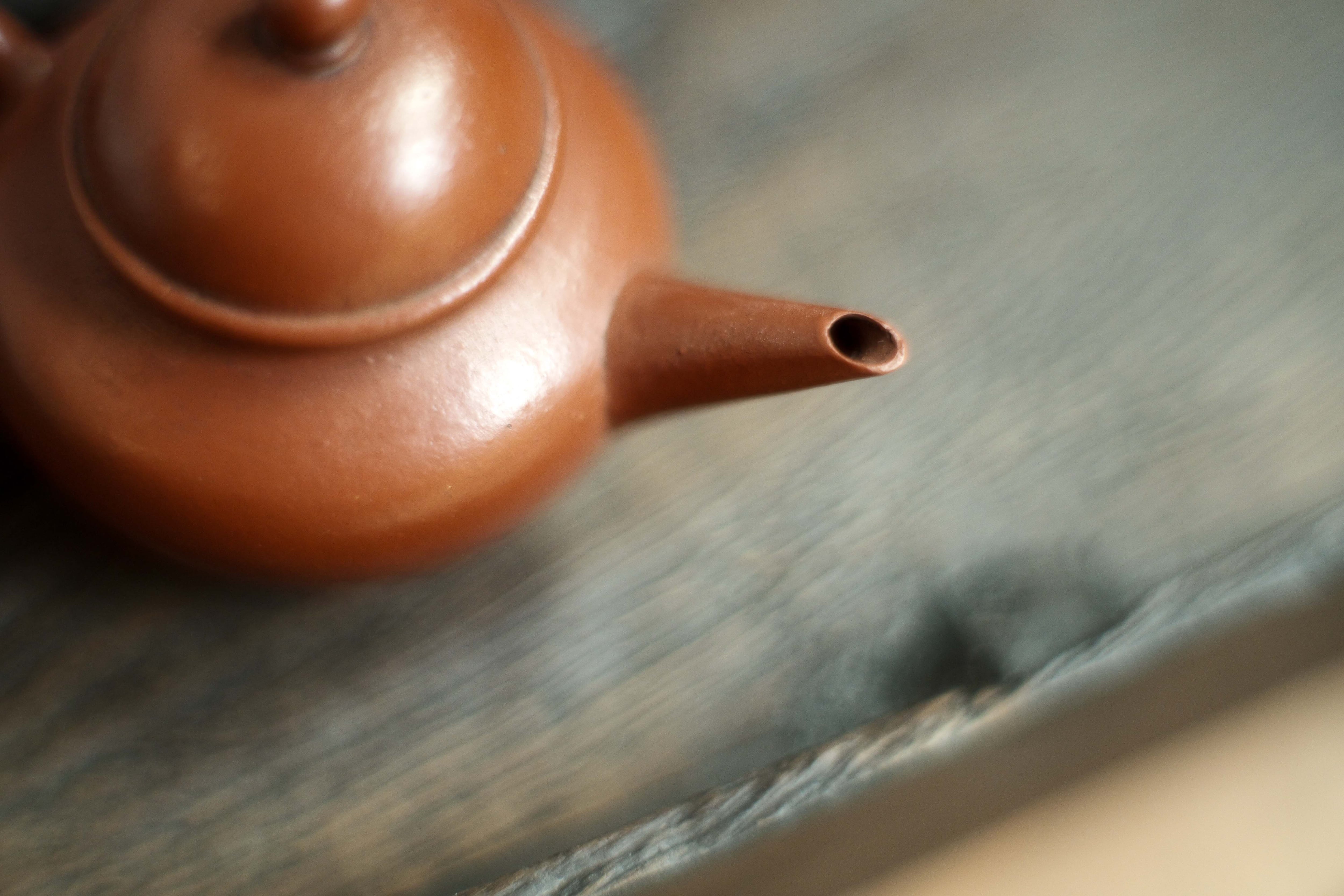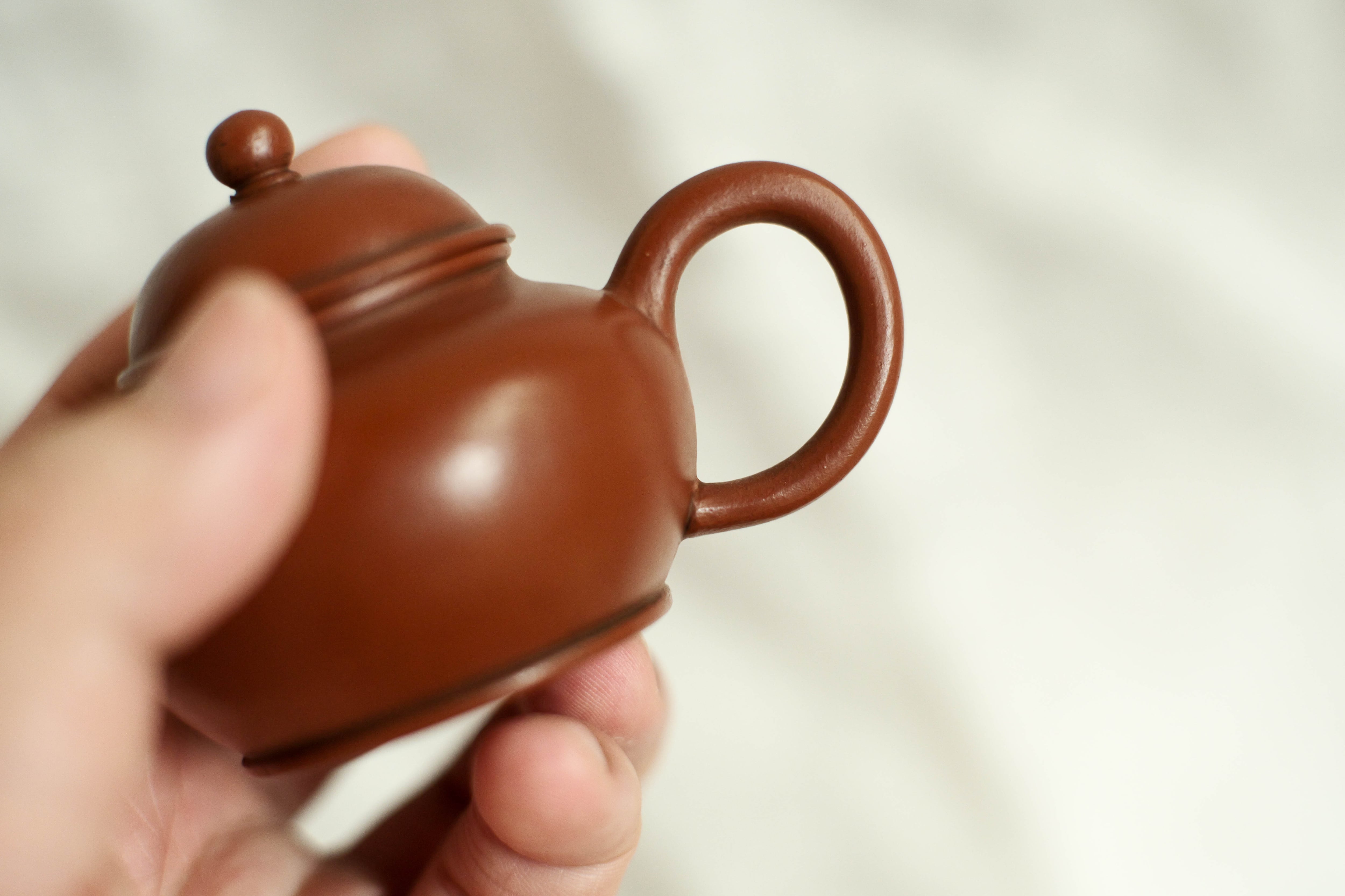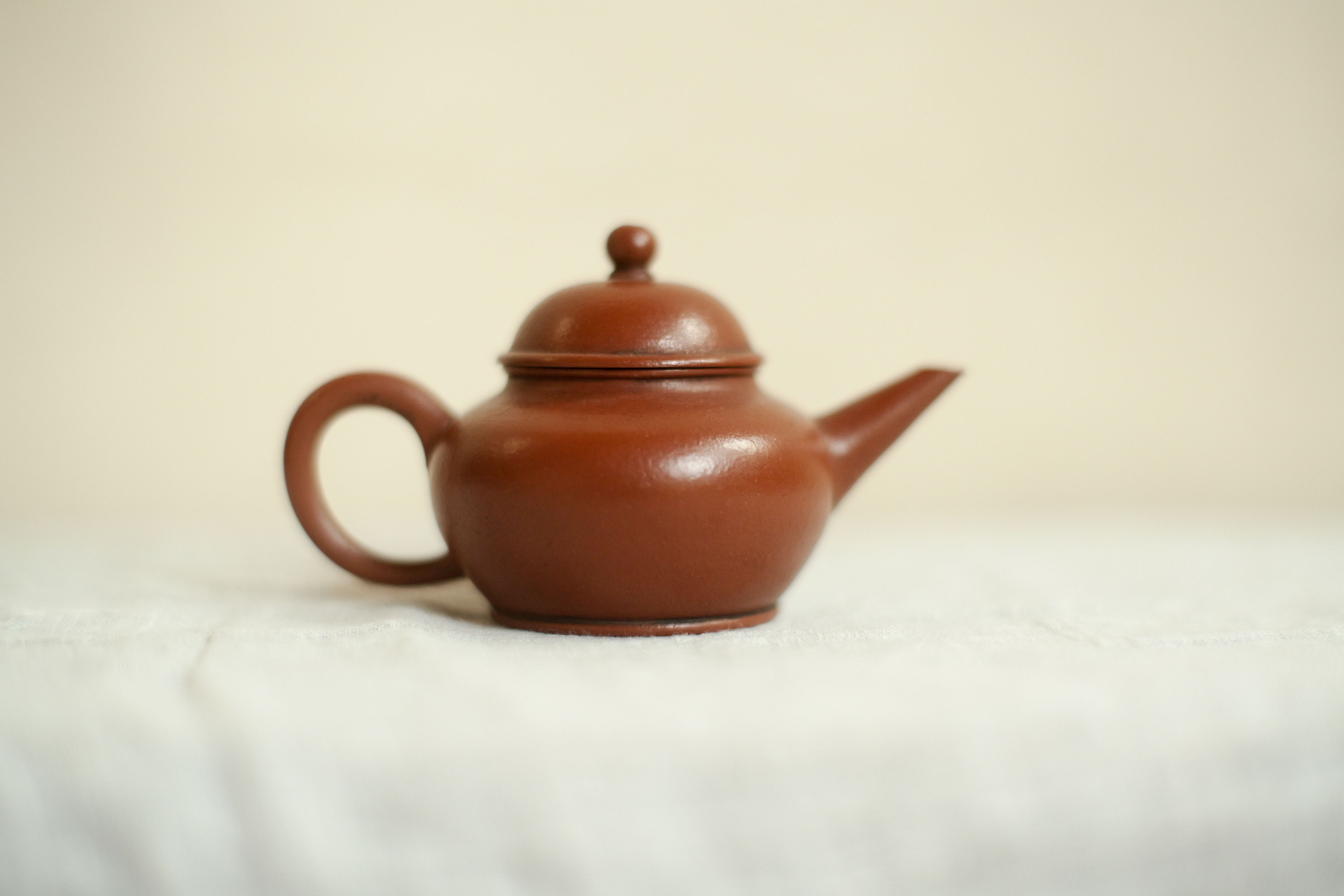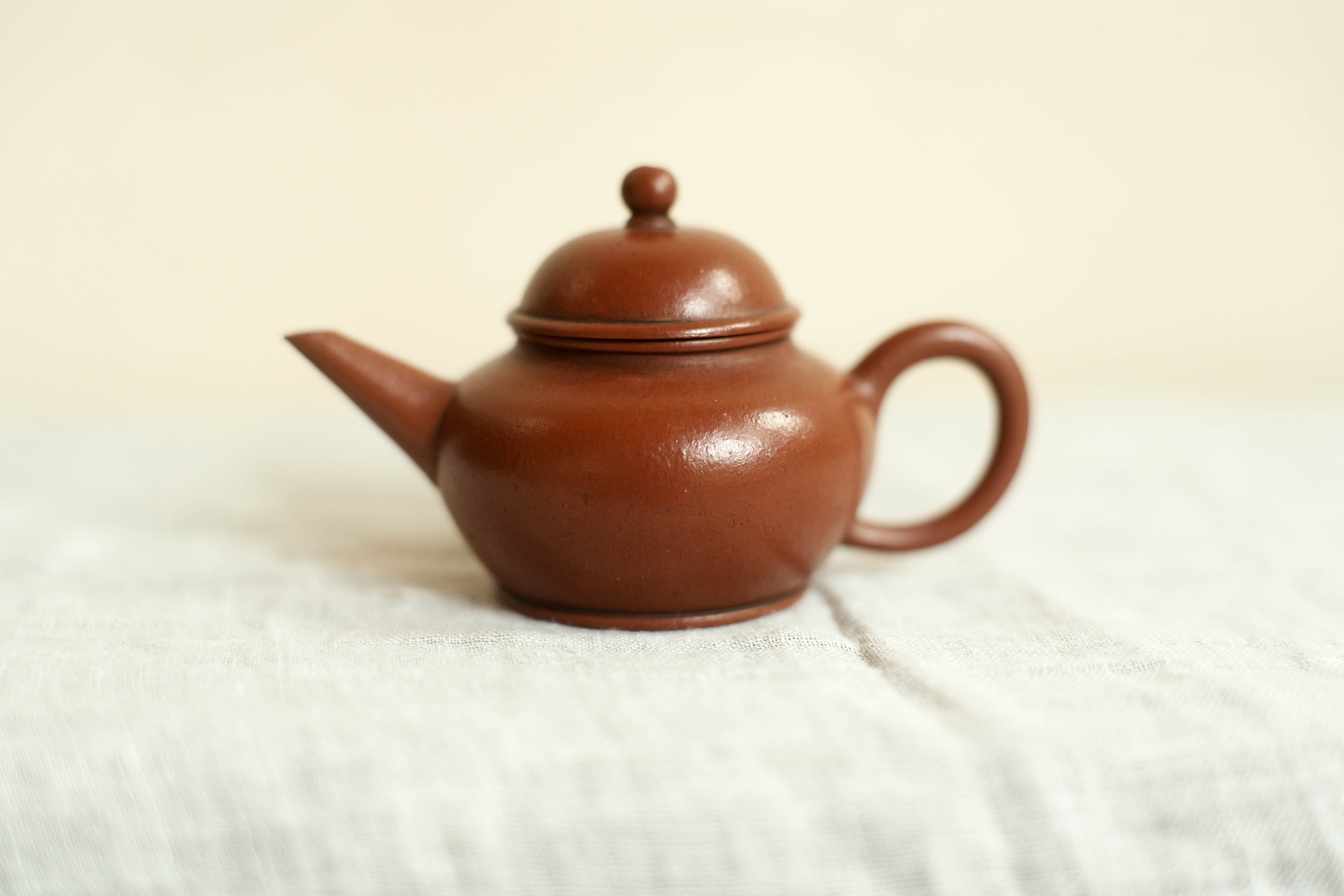 90年代に台湾のお客さんが前近代の朱泥壺の復刻品として作られたもの。 土も作りもすごく「老」の味を出している この重心が低めの水平壺は、形がグァバに似てるから、「芭楽(グァバ)水平」と呼ばれるらしい。 落款の判子がすごく可愛い。 今年宜興で見つけた「芭楽水平」の最後の一個。