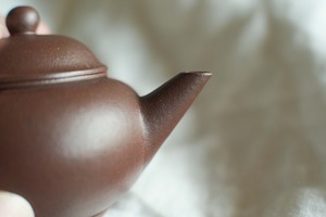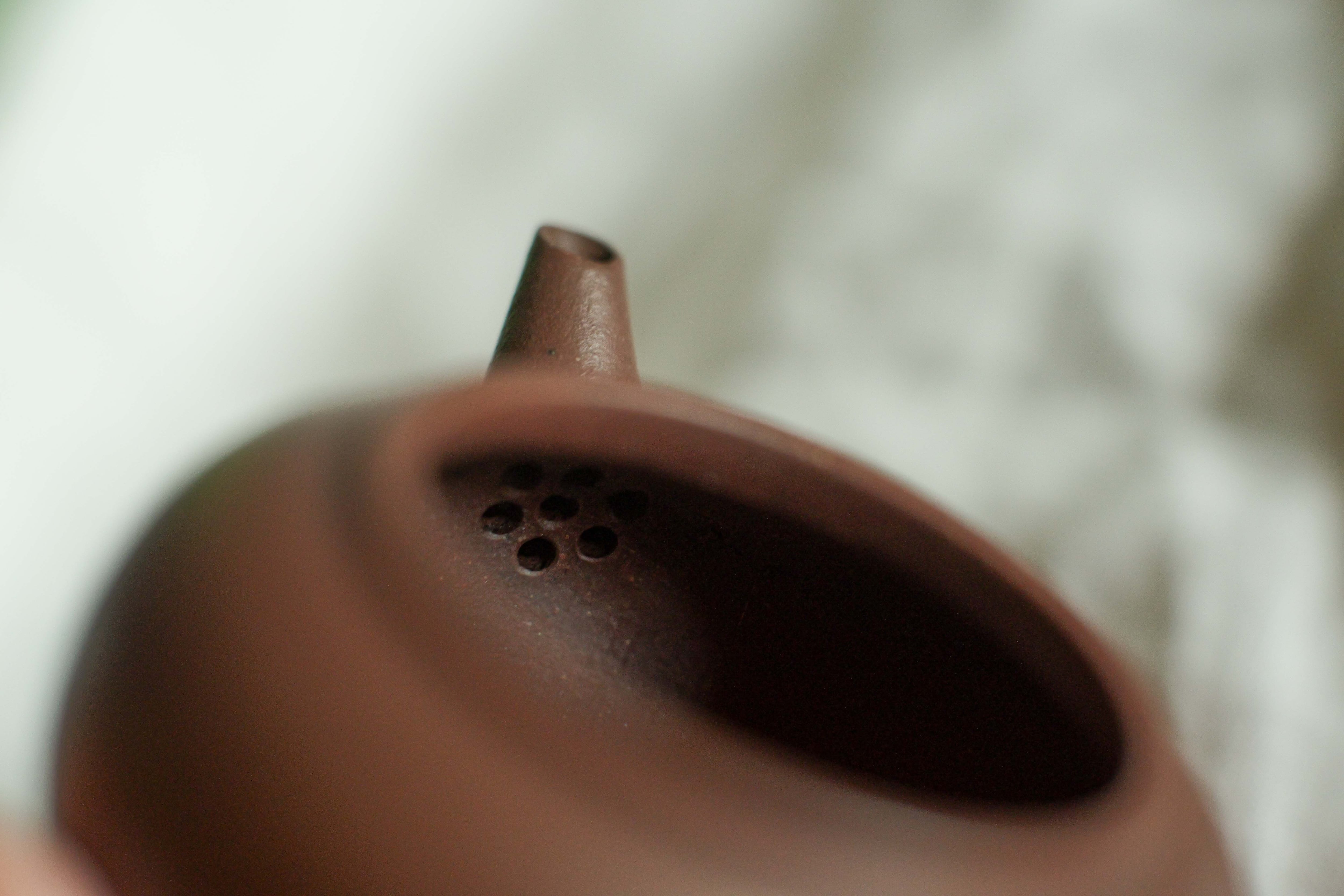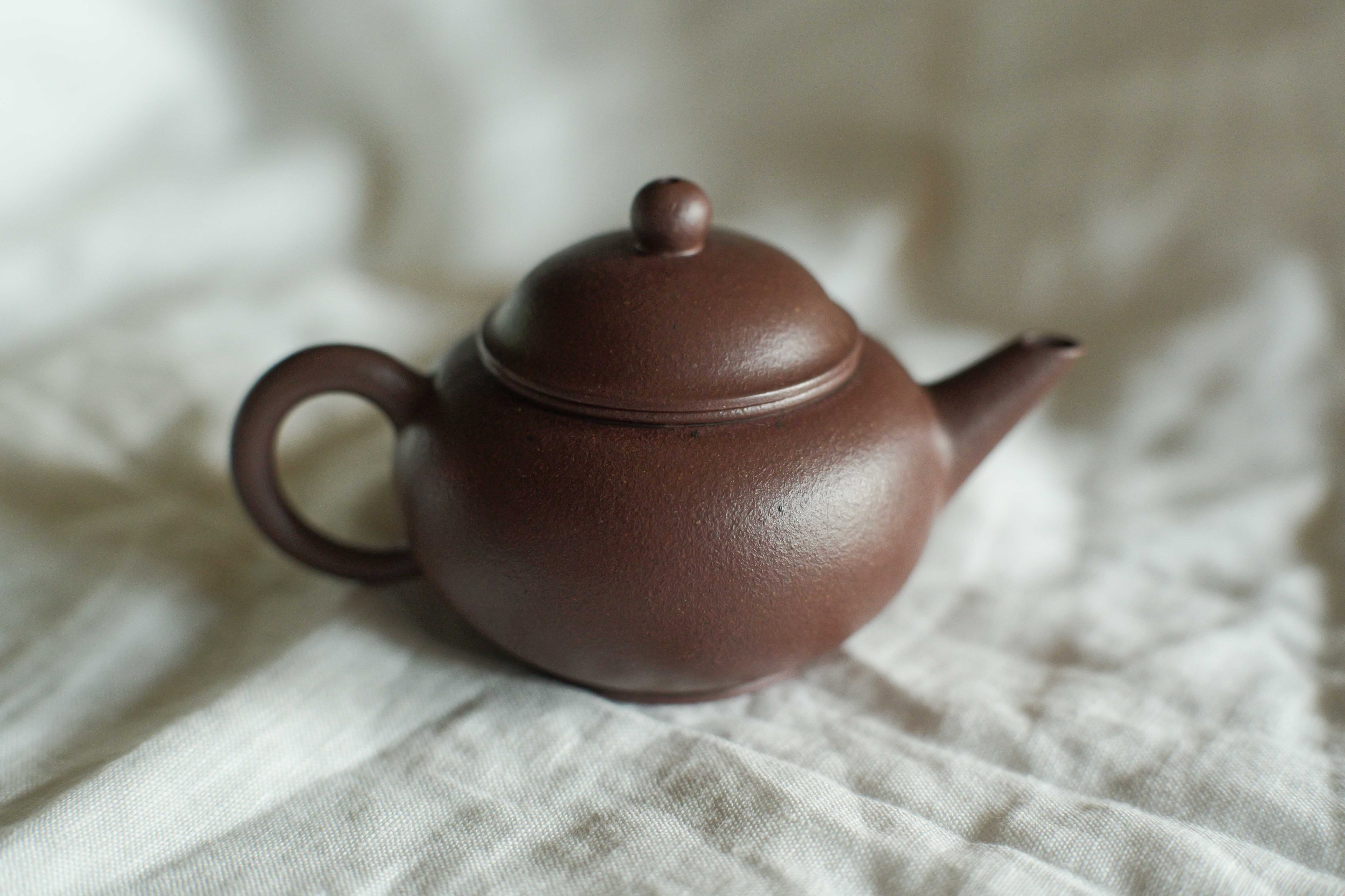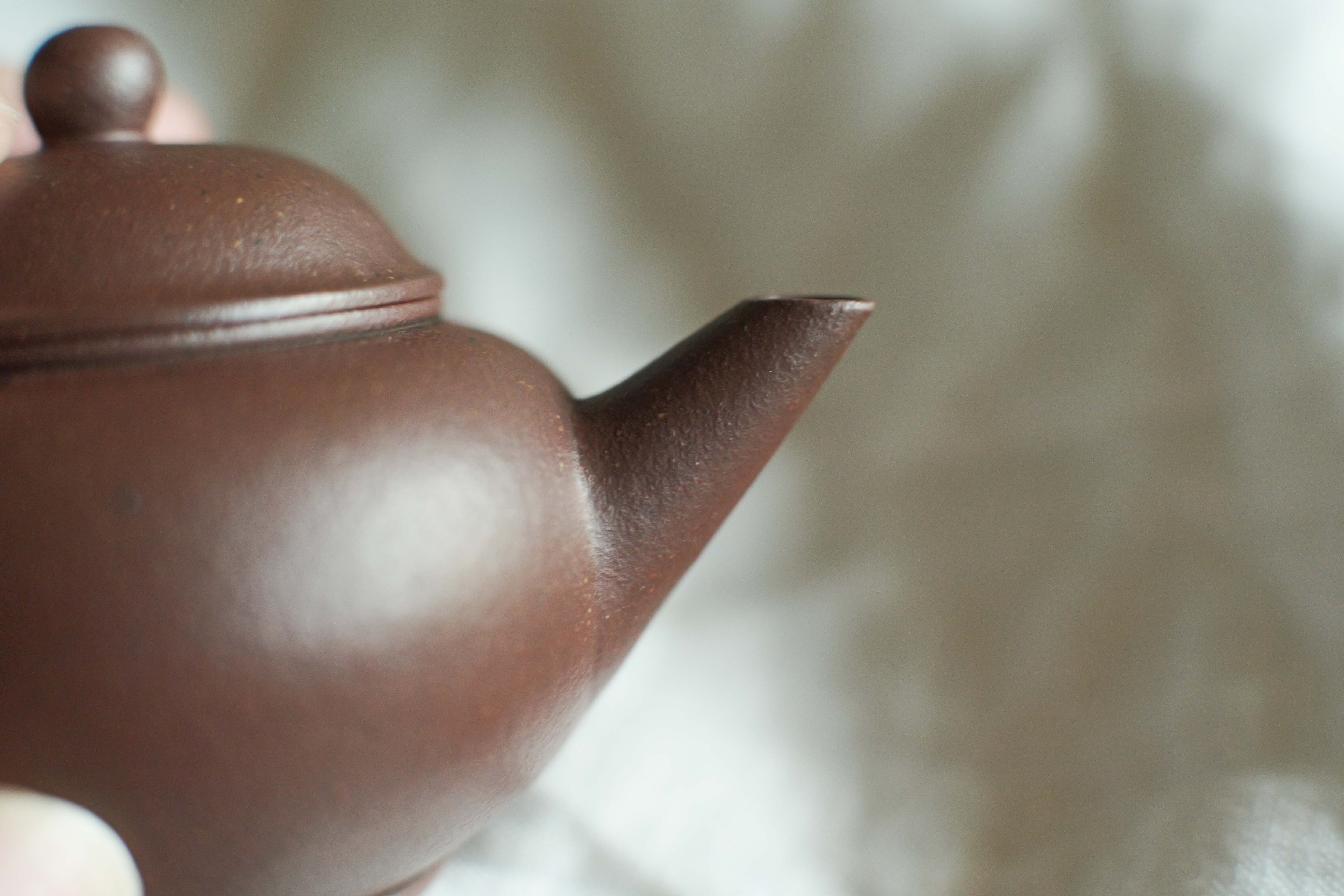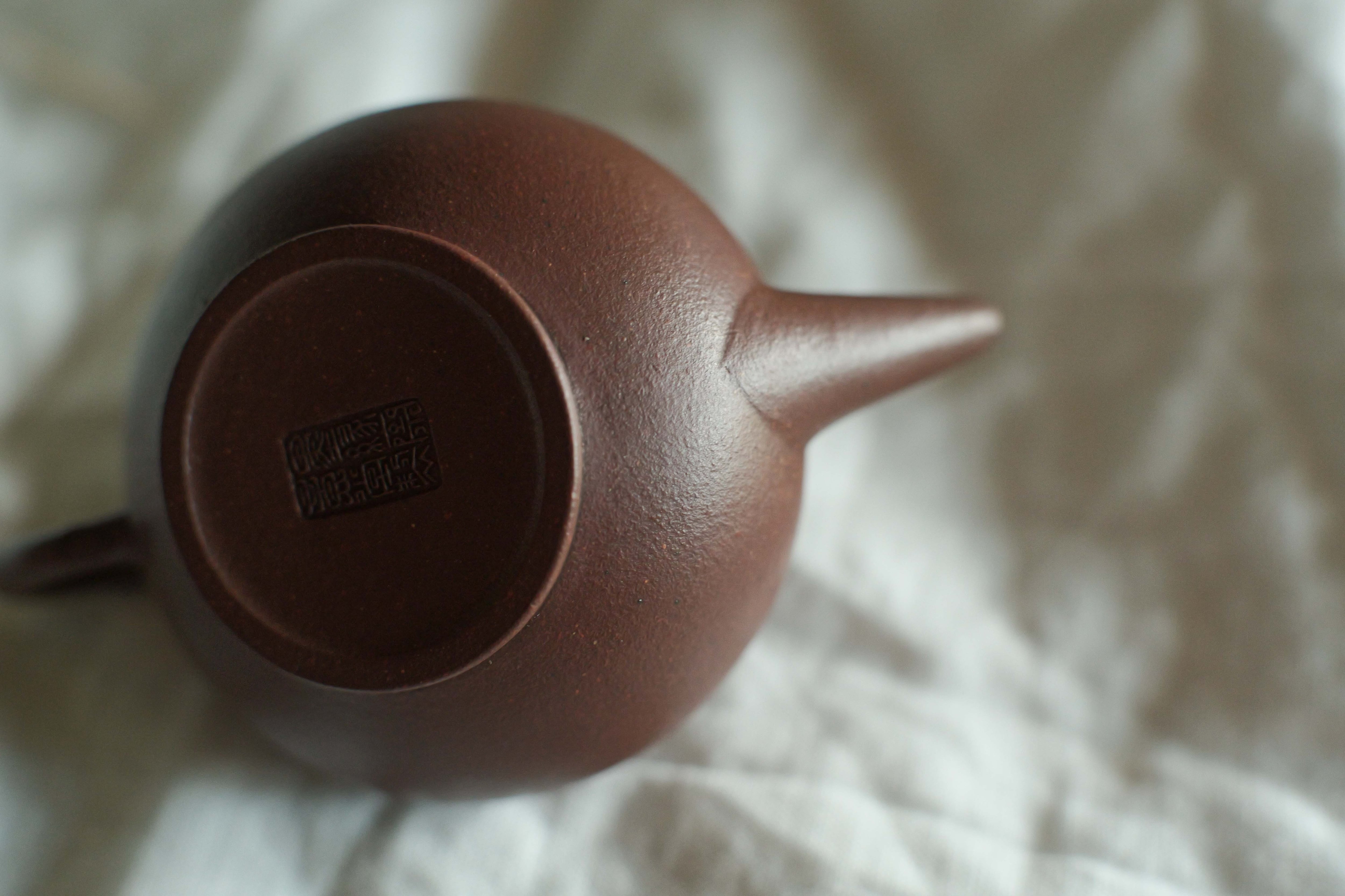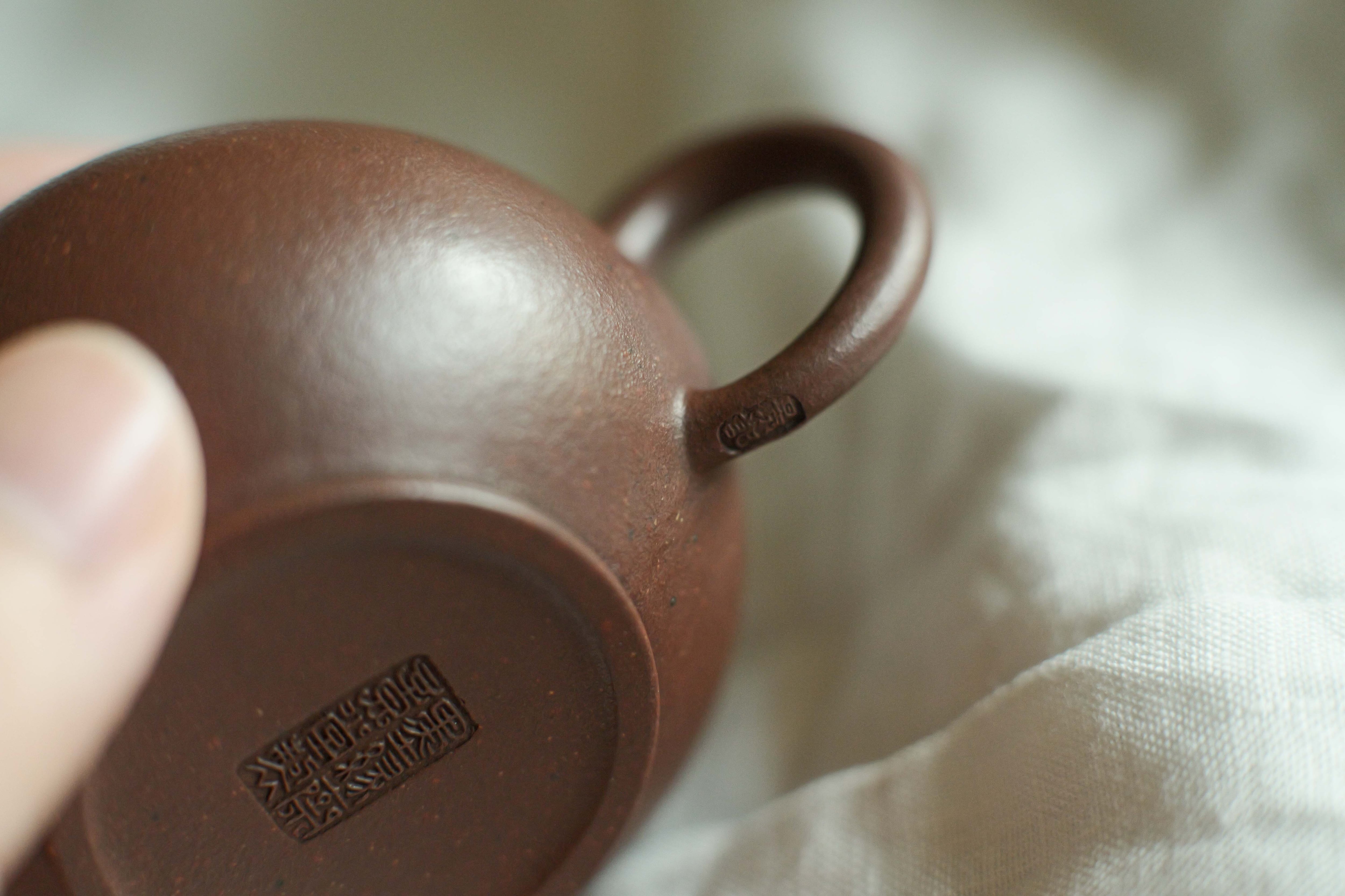 90年代台湾からの注文に応じて作られた水平壺と言われる。 身と注ぎ口が繋ぐなど「角」があるところは、 ほぼ丸みが付けられるのは造形上の特徴。 落款:「墨緣齋景堂製」 (昔、顧景舟の落款であるが、 後人が顧さんの雅な雰囲気にリスペクトする復刻作品を作るときによくこの判子を倣って使う)