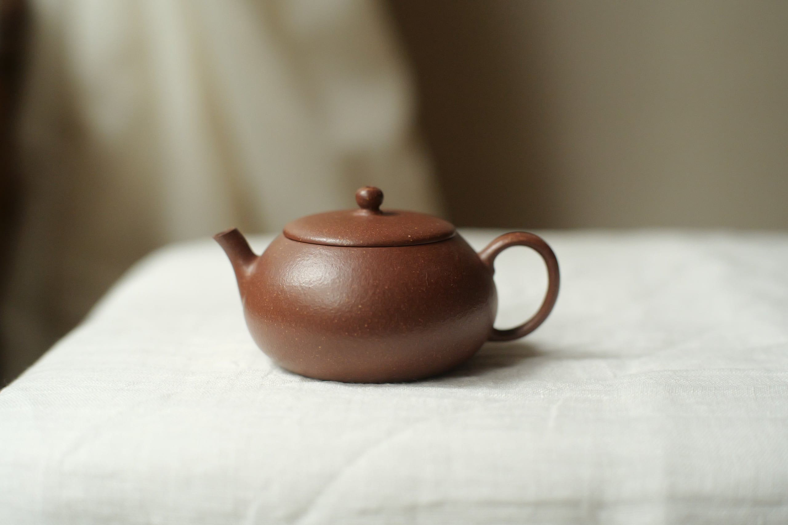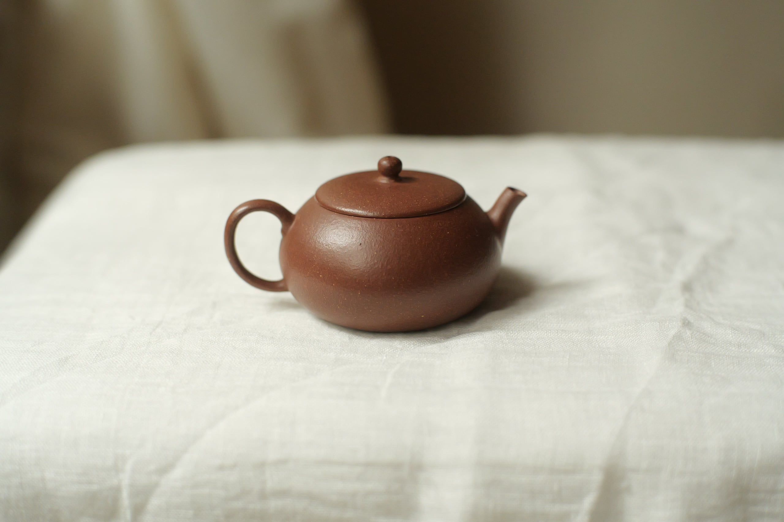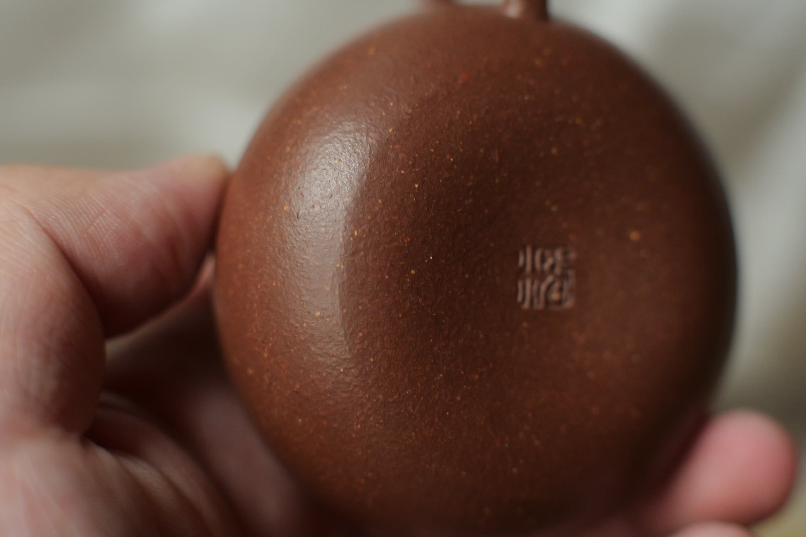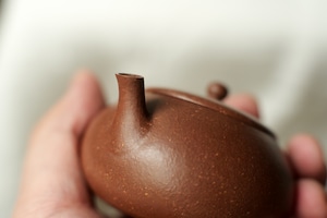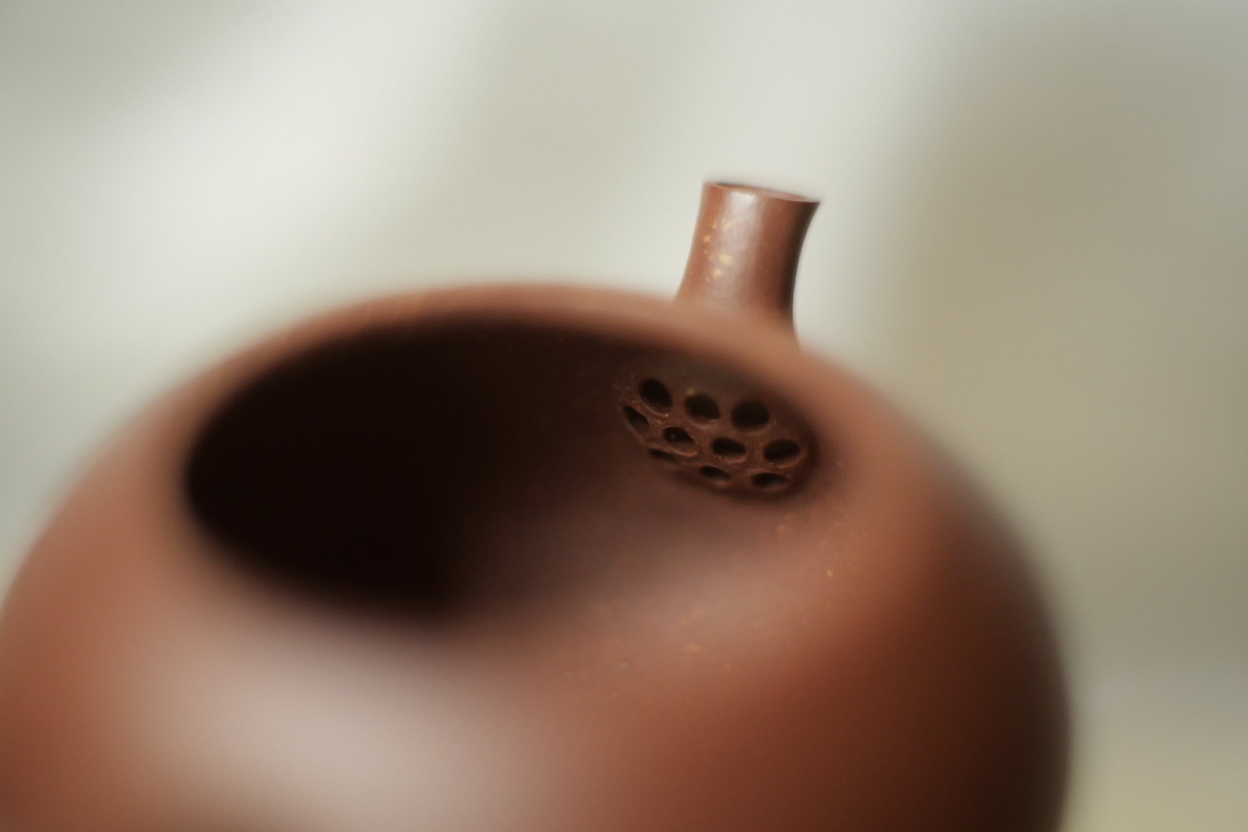 張小小さんによるオリジナル性の高い器形「蓮影」。 蓋と身の接し方、口の曲線と一気に茶湯を出し切れるバランス、 おへそのような底などはチャーミング 90ccの容量、そんなにお茶を選ばない朱泥系の降坡泥も 選ぶポイント