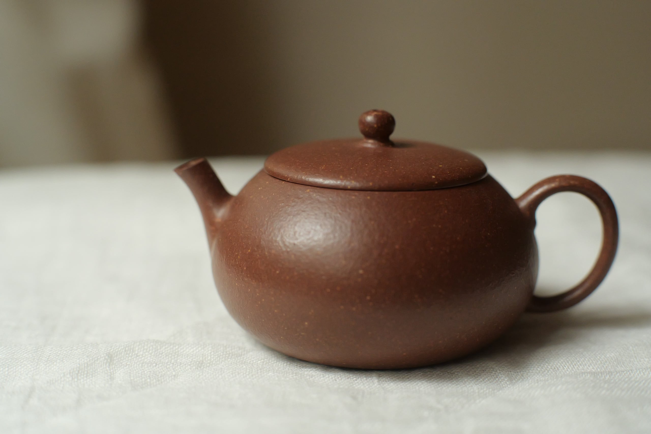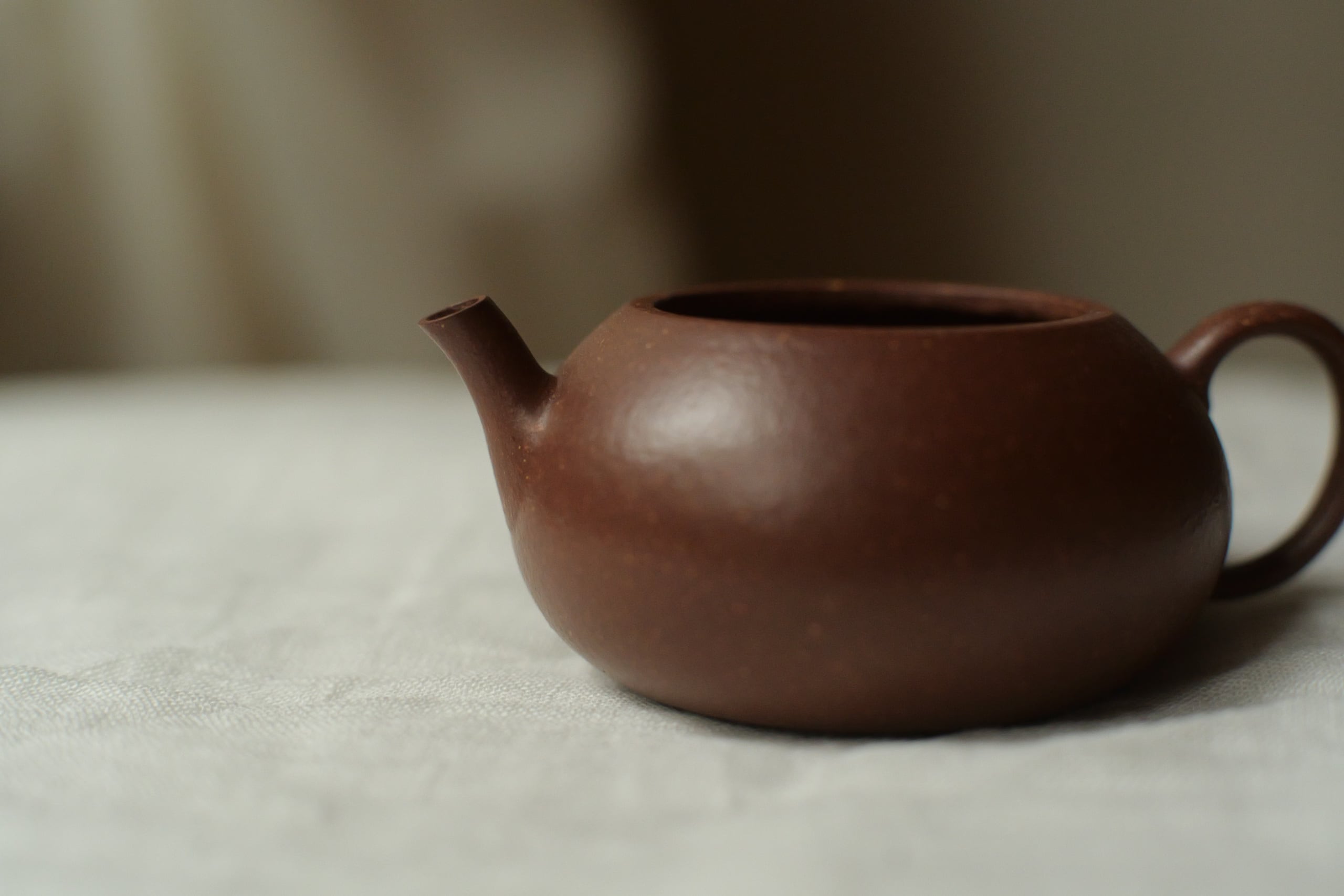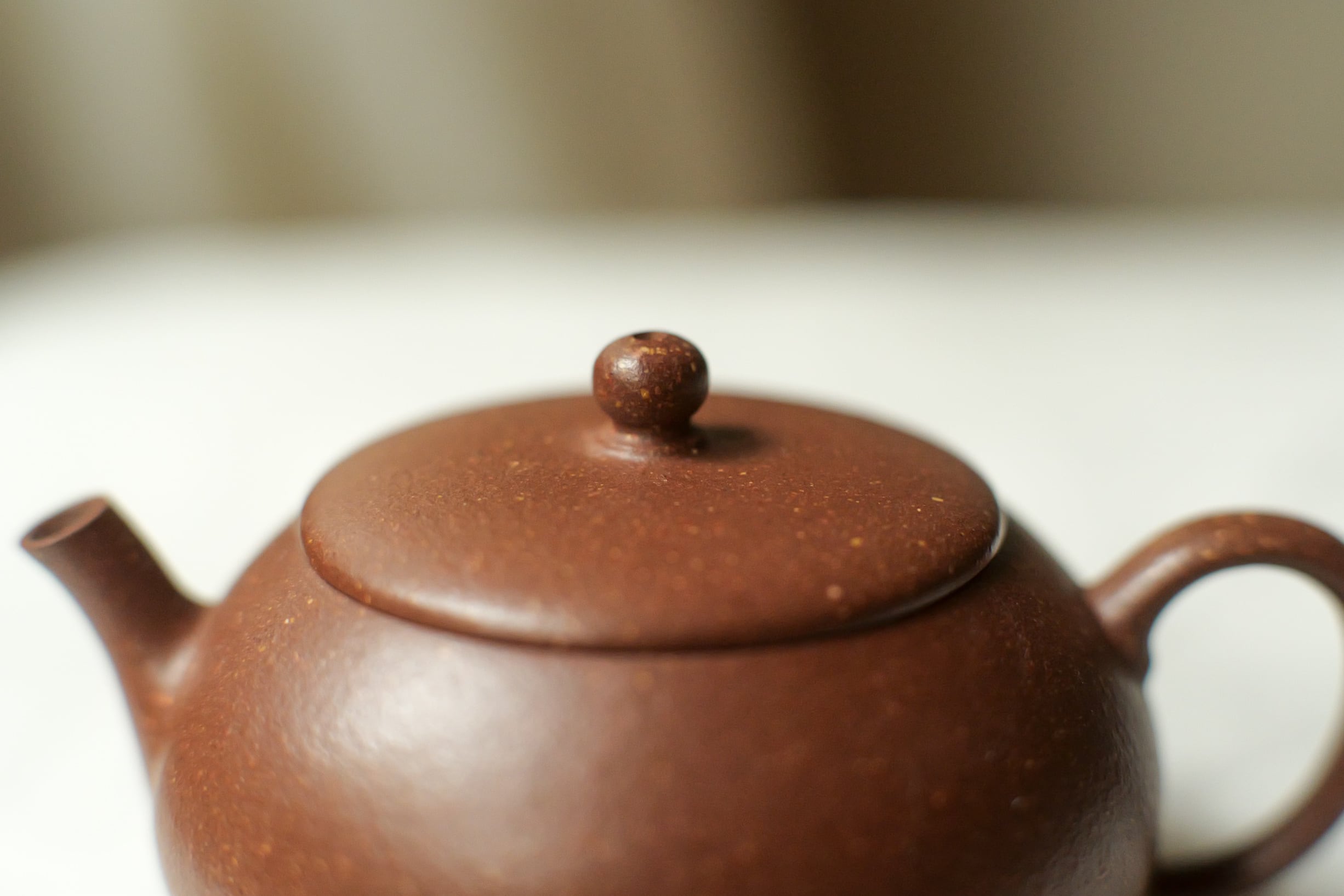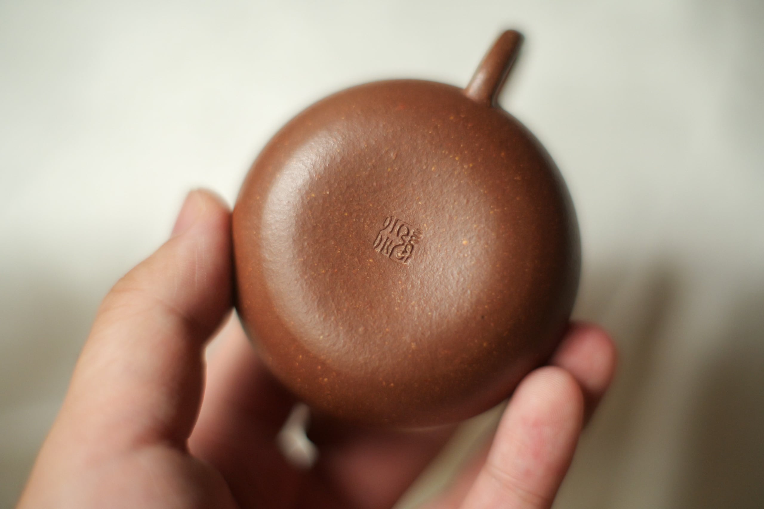 張小小さんによるオリジナル性の高い器形「蓮影」。 蓋と身の接し方、口の曲線と一気に茶湯を出し切れるバランス、 おへそのような底などはチャーミング 90ccの容量、そんなにお茶を選ばない朱泥系の降坡泥も 選ぶポイント